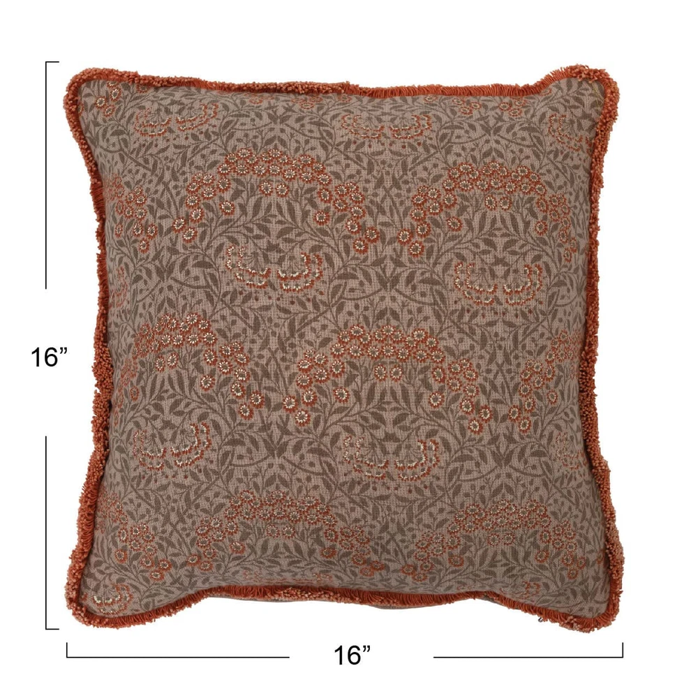 Add depth and personal style to any bed, chaise, or loveseat with a thoughtfully crafted throw pillow; Each plush accent features a variety of prints, embroideries, and textures, carefully curated to enhance any interior design scheme This classically designed throw pillow showcases a metallic floral print on cotton, finished with delicate eyelash fringe Square multicolor cotton throw pillow with metallic floral print and eyelash fringe; Tonal cotton encasement on back Express your constantly evolving style with the simple addition of this eye-catching pillow Removable cotton throw pillow cover and insert; Back zipper with flap; Hand wash, do not bleach, do not tumble dry, do not dry clean, medium iron from reverse Pillow measures 16" L x 16" W x 2" H