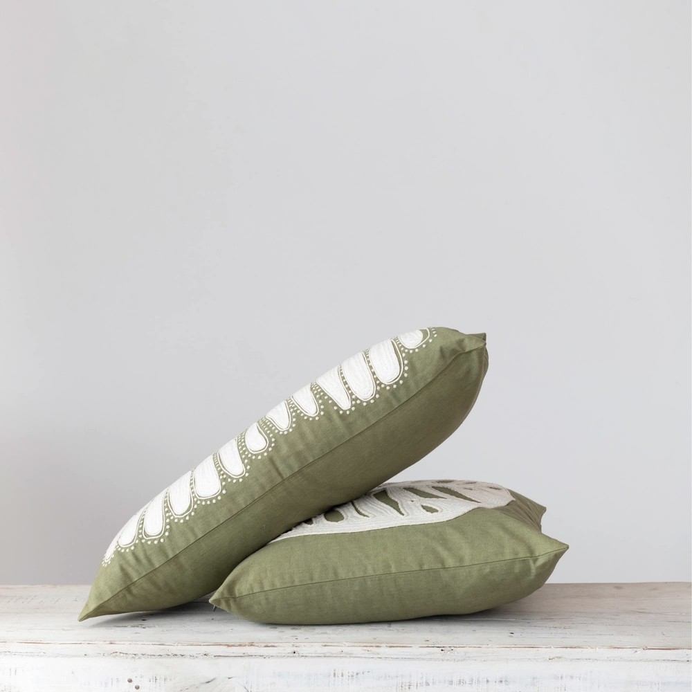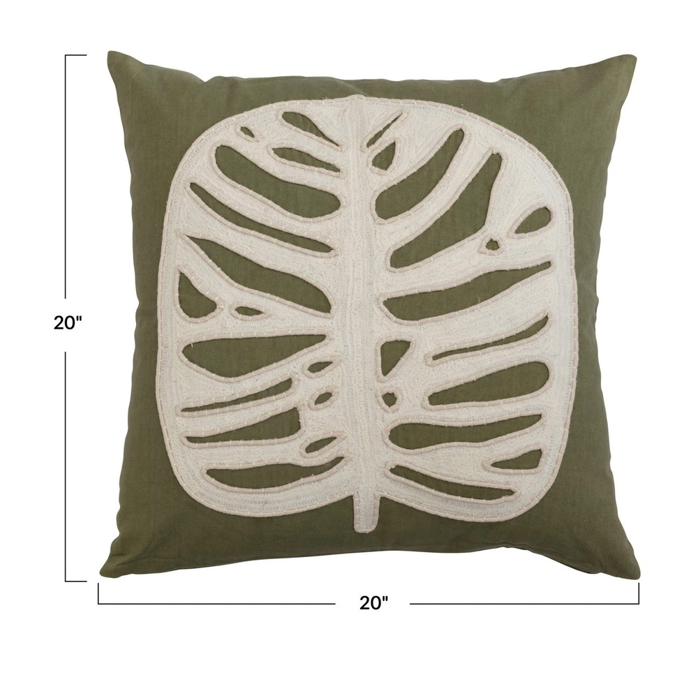 Green and cream cotton pillow with applique leaf and embroidery; Cover: 100% Cotton; 20" L x 20" W x 2" H Green and cream cotton pillow with applique leaf and embroidery Spot Clean Only Cover: 100% Cotton Prop 65 Compliant 20" L x 20" W x 2" H
