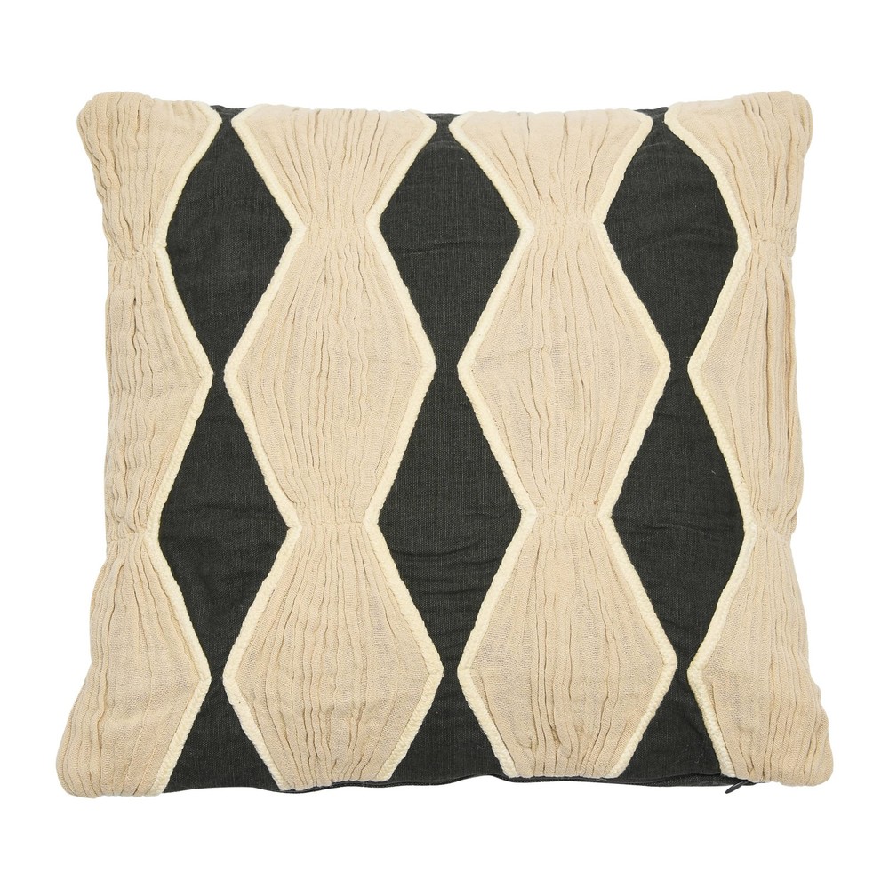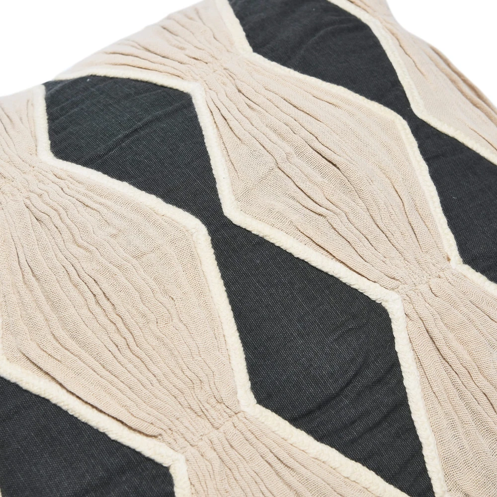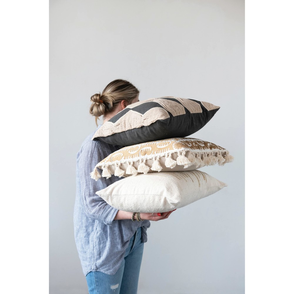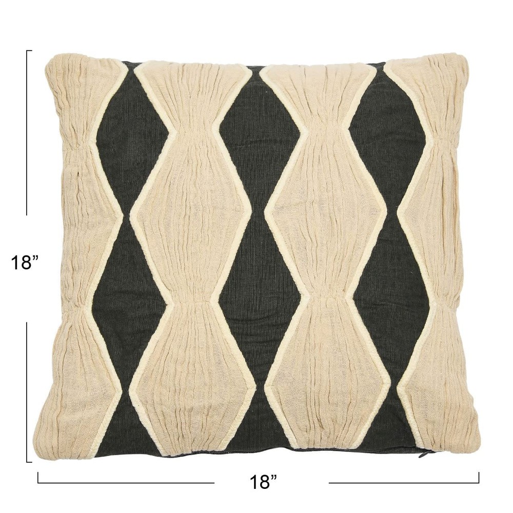 Add depth and personal style to any bed, chaise, or loveseat with a thoughtfully crafted throw pillow; Each plush accent features a variety of prints, embroideries, and textures, carefully curated to enhance any interior design scheme This contemporary, textured throw pillow features an embroidered geometric pattern and delicate applique on cotton Square and tan throw pillow with embroidered pattern on cotton; chambray on back Express your constantly evolving style with the simple addition of this eye-catching pillow Removable cotton throw pillow cover and insert; in seam zipper closure; Hand wash, do not bleach, do not tumble dry, do not dry clean, medium iron (do not iron on trim) Pillow measures 18" L x 18" W x 2" H