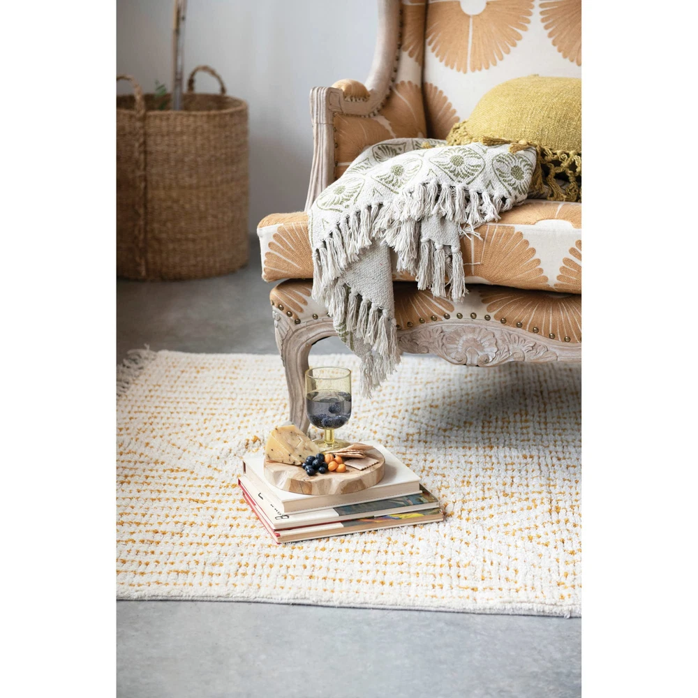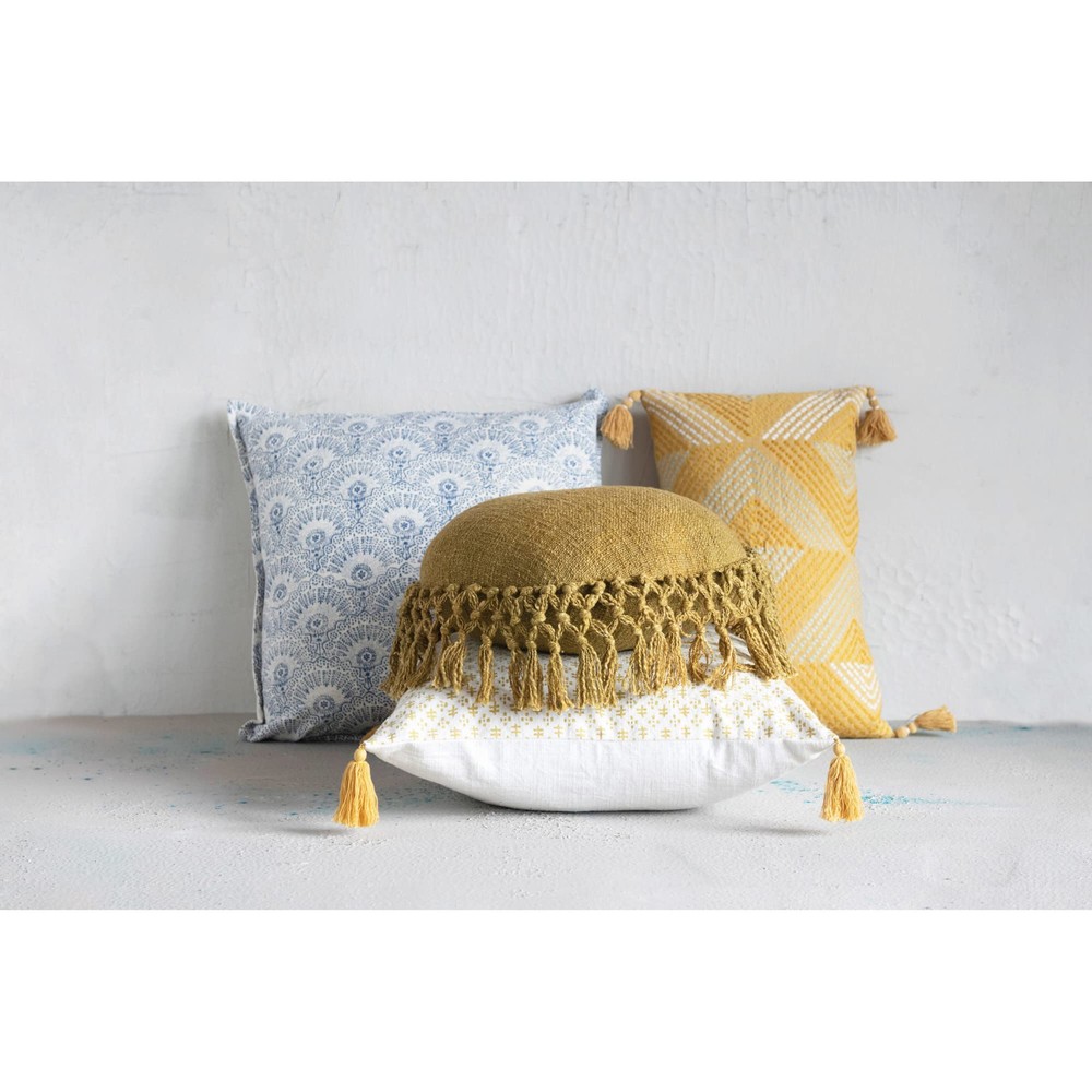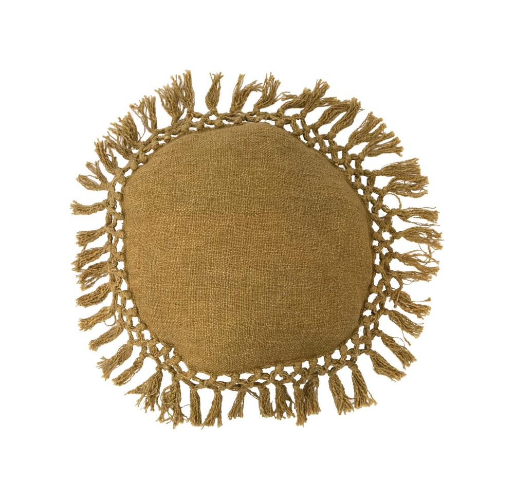 Add depth and personal style to any bed, chaise, or loveseat with a thoughtfully crafted throw pillow; Each plush accent features a variety of prints, embroideries, and textures, carefully curated to enhance any interior design scheme This playful throw pillow showcases soft cotton slub adorned with intricately crocheted tassels Round cotton throw pillow in marigold with crocheted tassels Express your constantly evolving style with the simple addition of this eye-catching pillow Removable cotton pillow cover and insert; Back zipper with flap; Dry clean only Pillow measures 16" L x 16" W x 2" H
