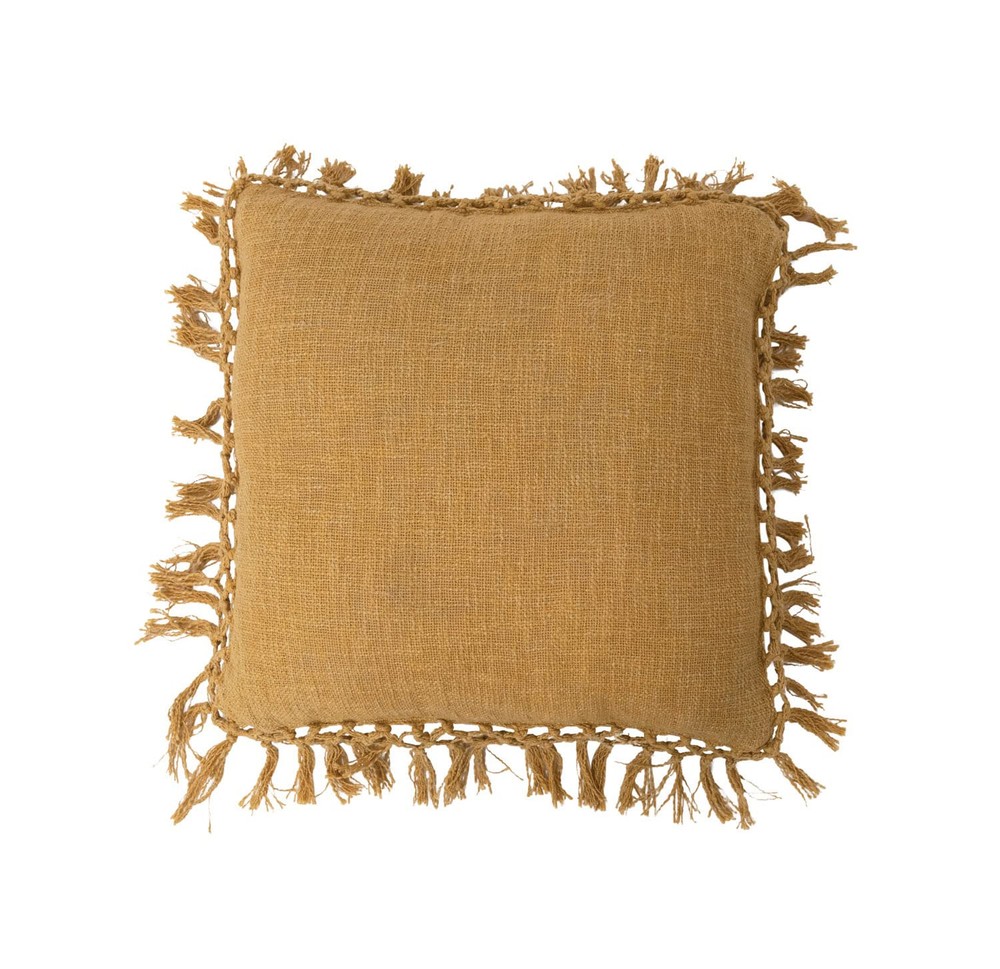 Add depth and personal style to any bed, chaise, or loveseat with a thoughtfully crafted throw pillow; Each plush accent features a variety of prints, embroideries, and textures, carefully curated to enhance any interior design scheme This boho-inspired throw pillow showcases soft cotton slub construction adorned with intricately crocheted fringe detail Square mustard cotton slub throw pillow with crocheted fringe Express your constantly evolving style with the simple addition of this eye-catching pillow Removable cotton throw pillow cover and insert; Hand wash, warm iron if needed Pillow measures 20" L x 20" W x 2" H