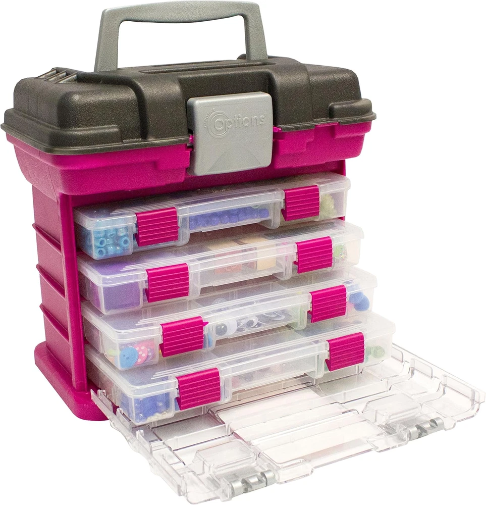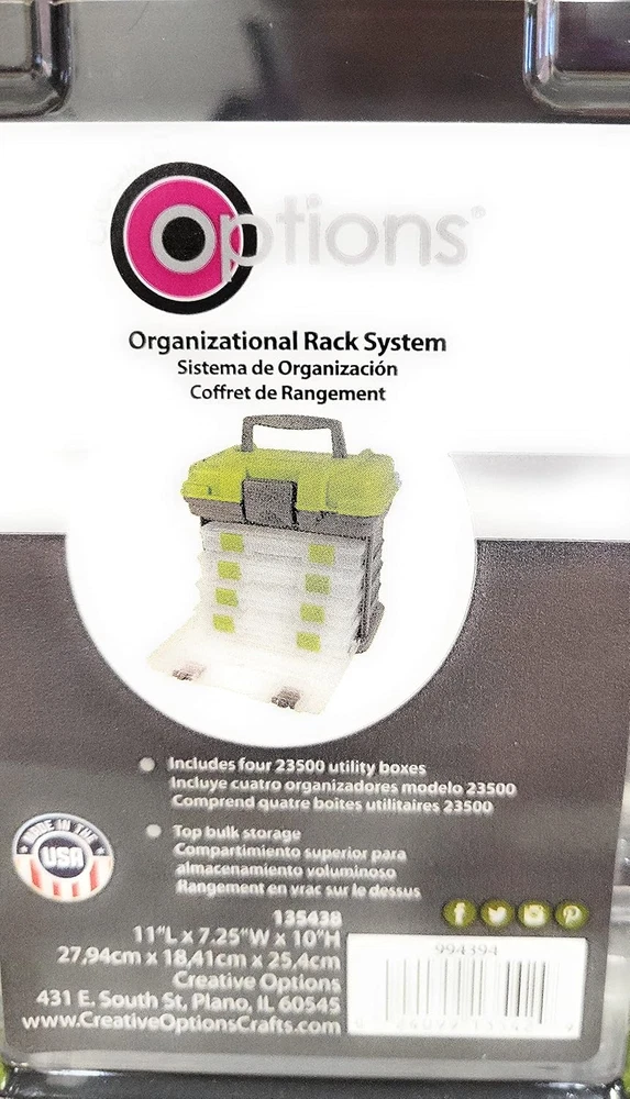 Store New Arrivals Add to Favorite View Feedback Creative 1354-83 Options Grab'N'Go Rack System, Small, Magenta Description Item model number 1354-83 Unit Count 1.0 Count Special Feature Water resistant Number of Items 1 Assembly required No Color Magenta Batteries required No Brand Creative Options Material Acrylic Country of Origin USA Global Trade Identification Number 00024099135436 Item Weight 2.85 pounds Item Weight 285 Pounds Number of Compartments 5 Shape Rectangular Package Type Standard Packaging Manufacturer Creative Options Number of pieces 1 Is Discontinued By Manufacturer No Product Dimensions 10"D x 11"W x 7.25"H Size Small Includes 4 small utility boxes Top bulk storage Latching closures and top handle Includes 4 Creative Options utility kits, model (2-3500) Small sized The Grab'n'Go Rack System by Creative Options combines drawer organization with utility boxes to give crafters and artists an organizational option for any craft hobby. The top of the kit features a large bulk storage area for larger items, while the acrylic window below reveals multiple drawer channels to slide Creative Option Utility Boxes, often used as storage kits of their own. Open the acrylic window slide out the included utility boxes, which can be taken as separate kits when needed. ABOUT US We offer the best prices around on high quality products. Our E-store includes media such as books, movies, music and games while offering electronics, toys, sporting apparel, clothing, tools, general home, garden items and more. SHIPPING We are always working hard to ensure your package arrives as soon as possible. Please understand that some factors like weather, high postal traffic, and the performance of shipping companies are outside of our control. We offer free shipping to the lower 48 states and ship within 2 business days of payment, usually sooner. We do not accept P.O. Boxes. Please provide a physical address. RETURNS We offer a 30-Day Return Policy on items which you are not completely satisfied with. You have the option for a full-refund or an exchange of the item. No returns are available on items shipped outside of the USA. PAYMENT We accept PayPal. CONTACT US This page content is yet to come Please ad us to your favorite seller and visit again later Thank You