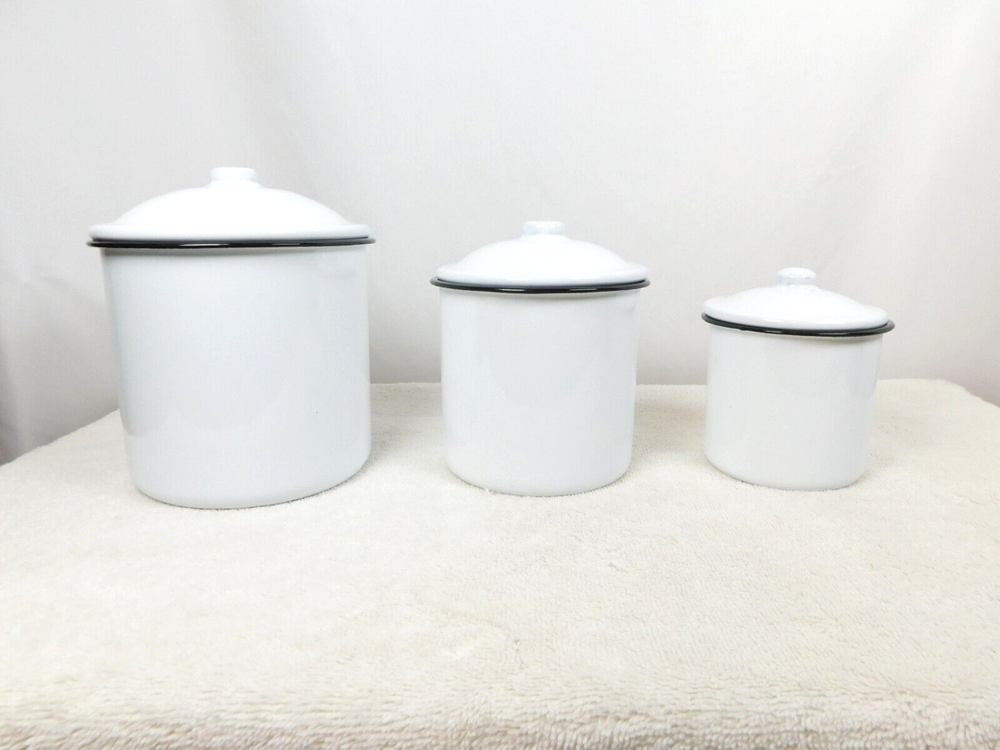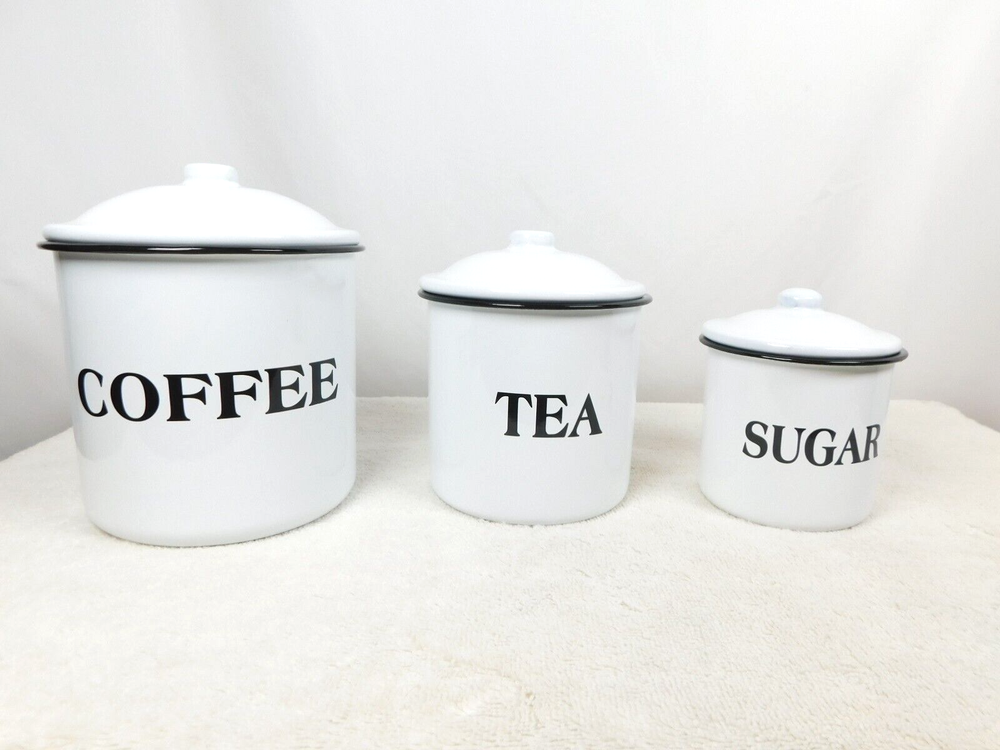 This Creative Co Op set of coffee, tea, and sugar canisters with lids is a must-have for any kitchen. The stylish black and white enamel design adds a touch of elegance to your countertop. Each canister measures 8 inches in height and comes with a lid to keep your drinks and sugar fresh. The set includes three canisters, making it perfect for those who love to enjoy coffee, tea, and sugar in style. The enamel material ensures that your canisters will last for years to come. Add this set to your kitchen storage and organization collection today!
