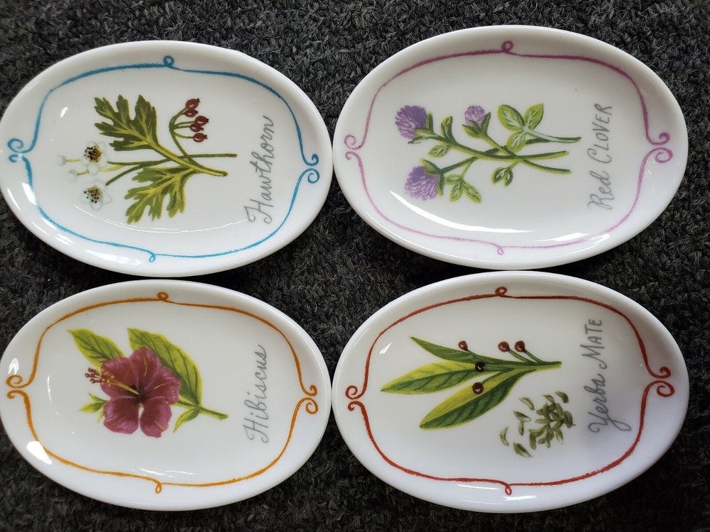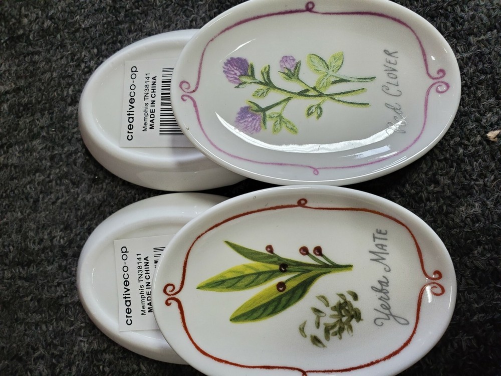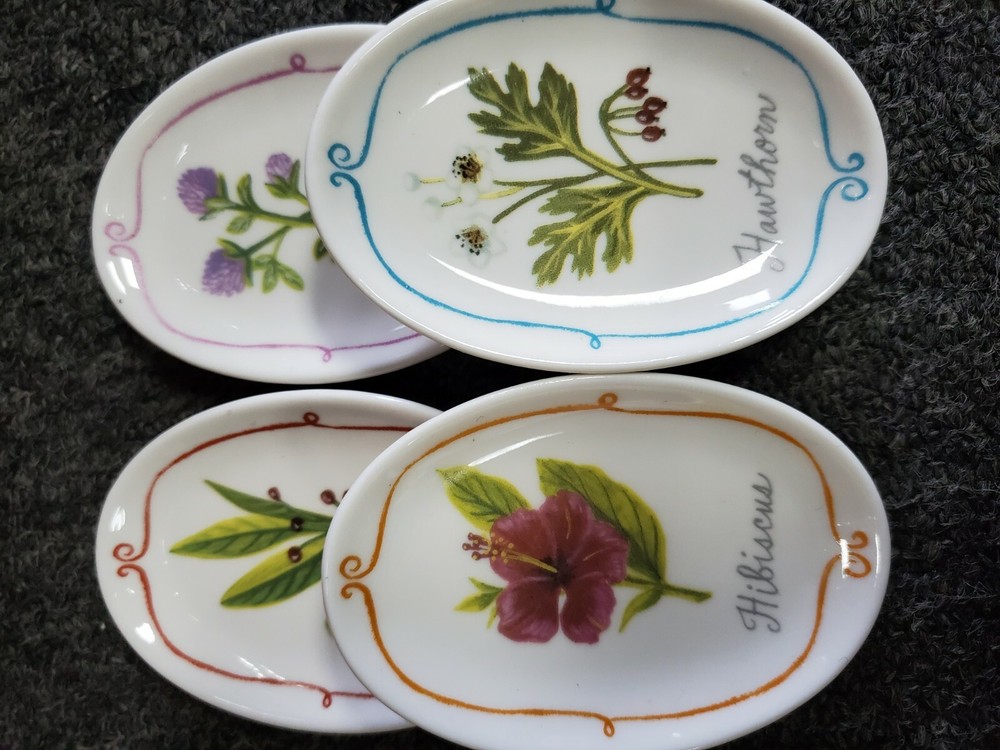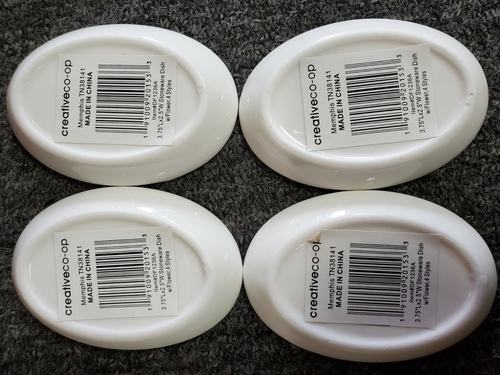 6 Plates of each design 24 Plates in total PRODUCT DESCRIPTION 3-3/4"L x 2-1/2"W Stoneware Dish w/ Flower, 4 Styles SPECIFICATIONS -Catalog Name: 3-3/4"L x 2-1/2"W Stoneware Dish w/ Flower, 4 Styles -Ships by Truck: No -Inner: 24 -UPC: 191009201533 -Carton: 96 -Cube: 1.0417