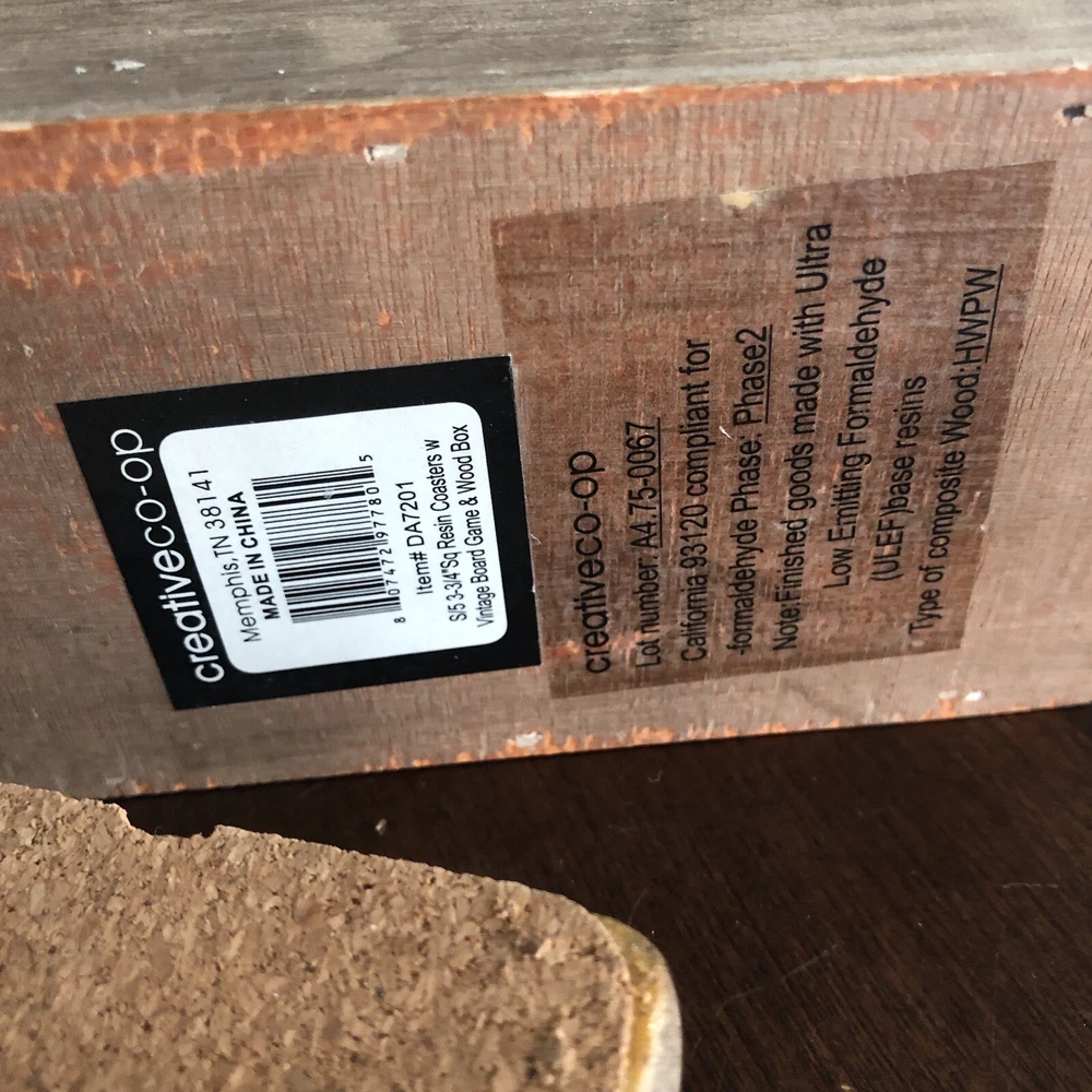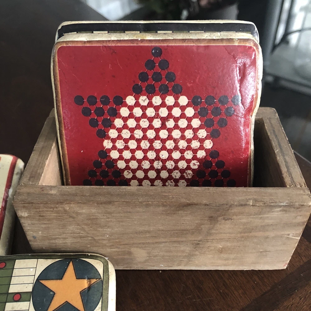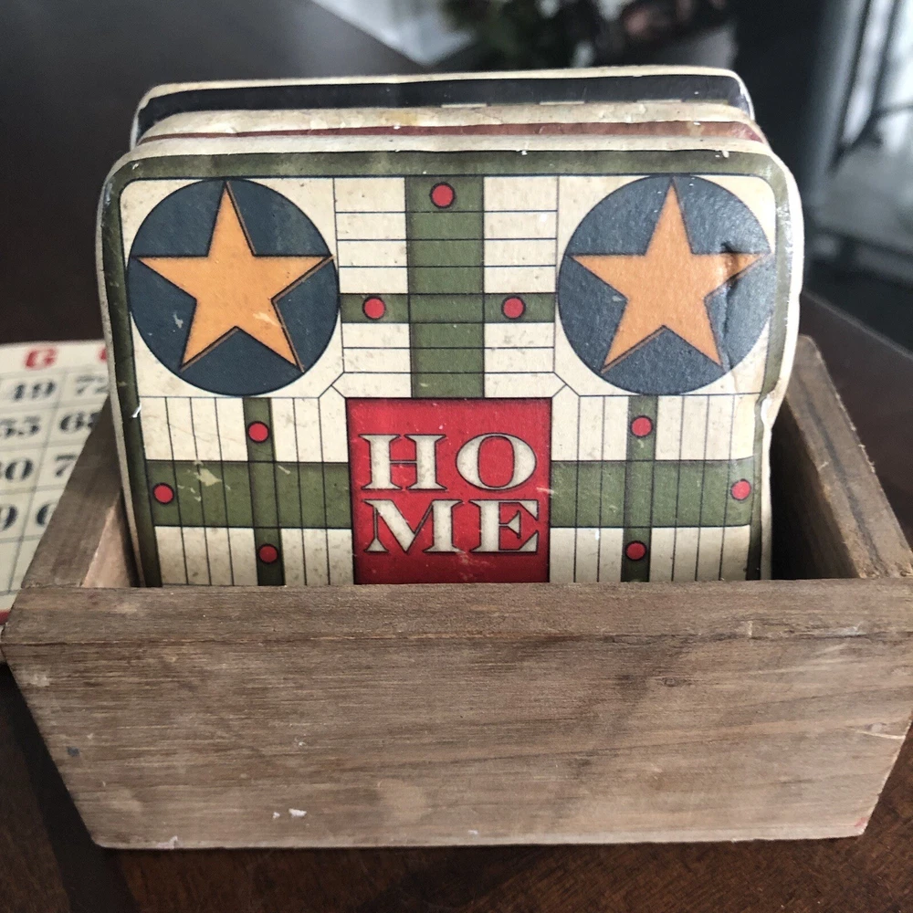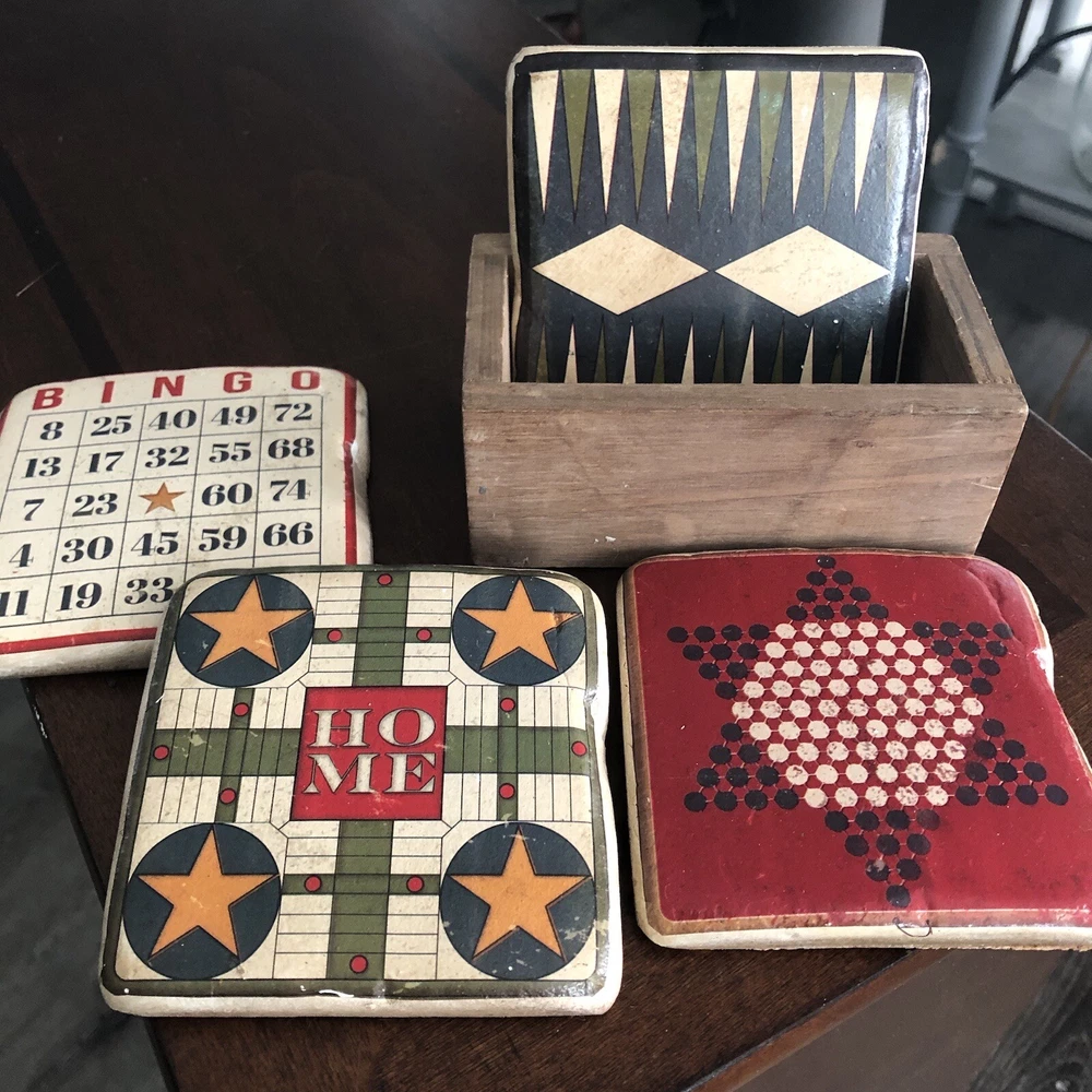 Creative Co 3.75” Square Thick Vtg Board Games Resin Wood Box 4 Coasters. Each coaster has solid weight Mimicked old vintage board games Cork on back A little peeling of cork on back Coasters made to look old and vintage In wood box Made in China