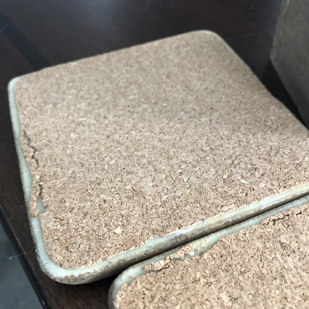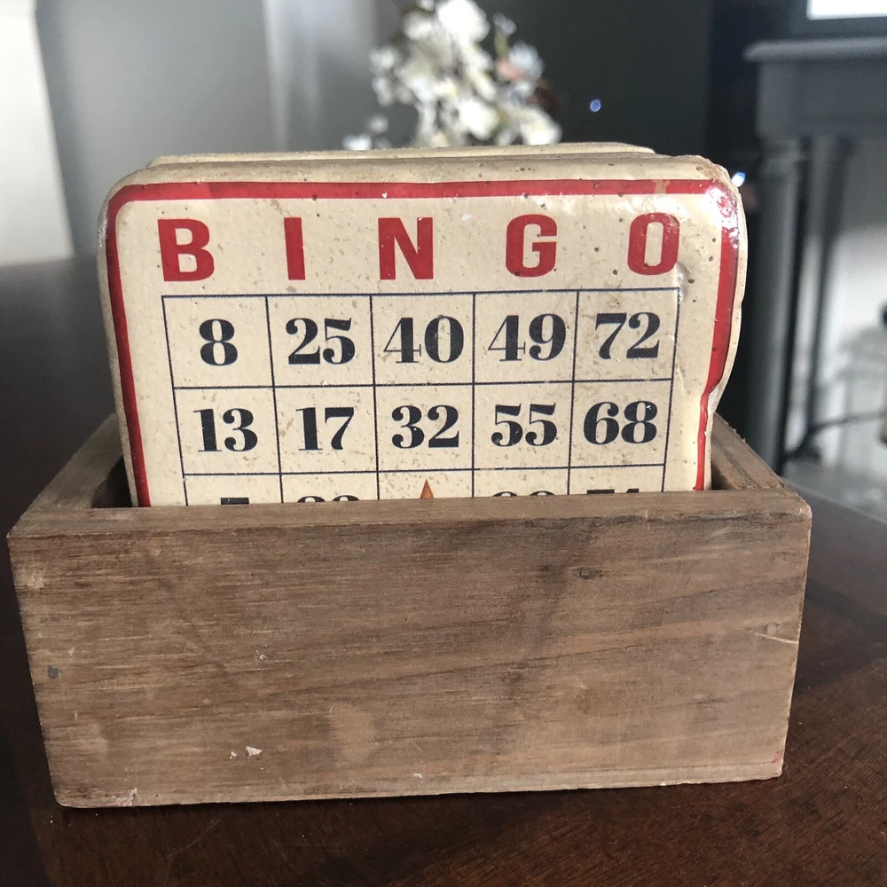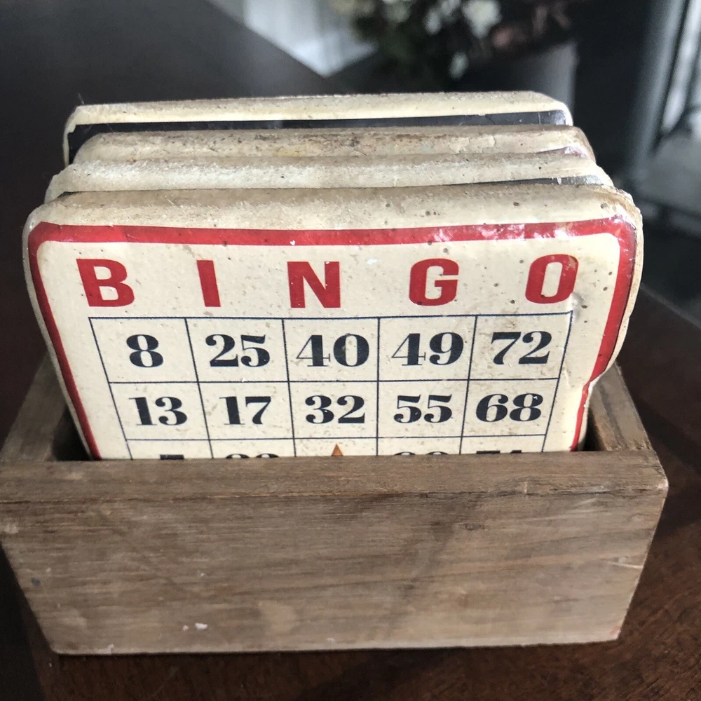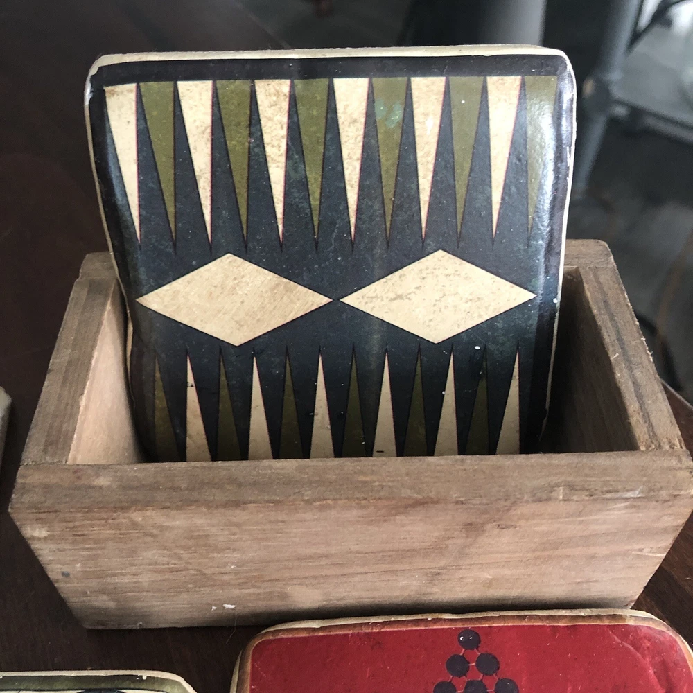 Creative Co 3.75” Square Thick Vtg Board Games Resin Wood Box 4 Coasters. Each coaster has solid weight Mimicked old vintage board games Cork on back A little peeling of cork on back Coasters made to look old and vintage In wood box Made in China