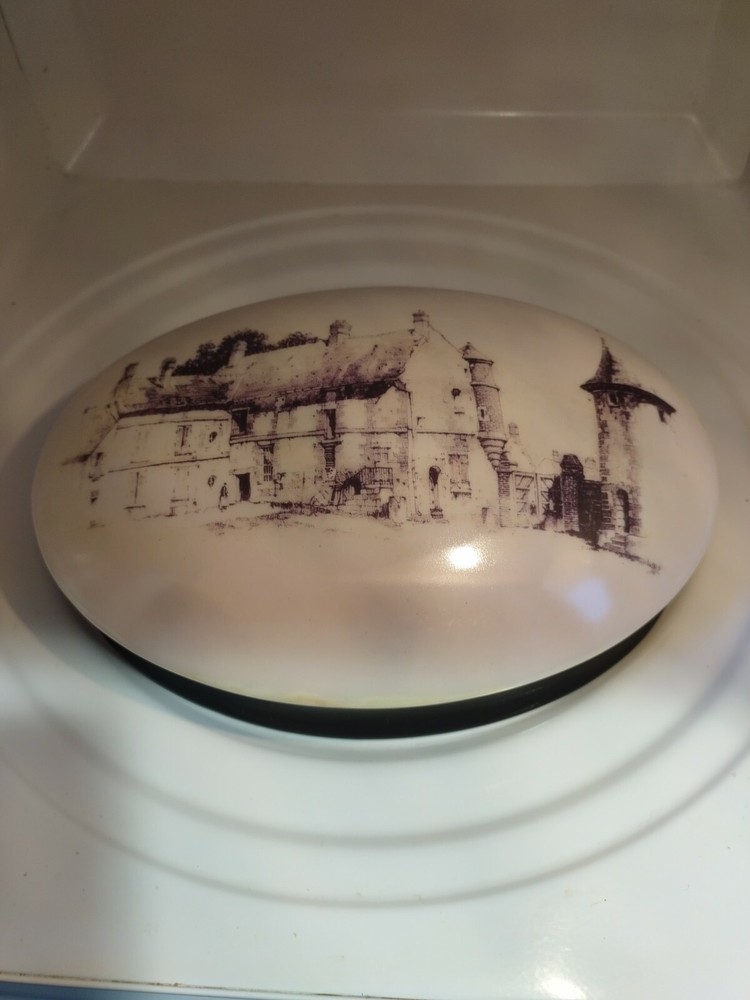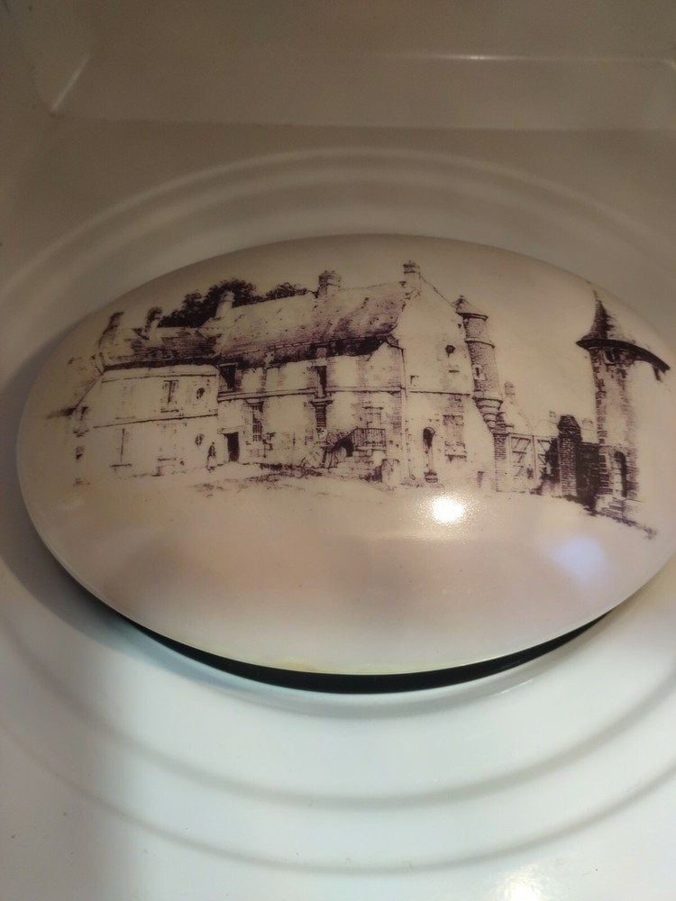 Creative Co Op 8" Ceramic Covered Box. Condition is "New". Shipped with USPS Priority Mail.New with tag.Pretty sketched in black picture of old Country Castle & farm area.Glaze is vintage style with slight "aged" finish! Very pretty.It is oval size 8 " around
