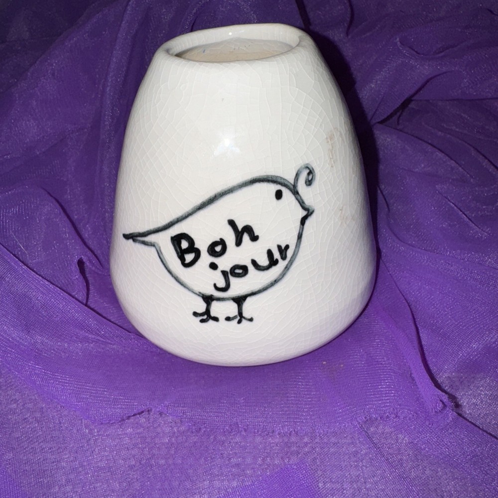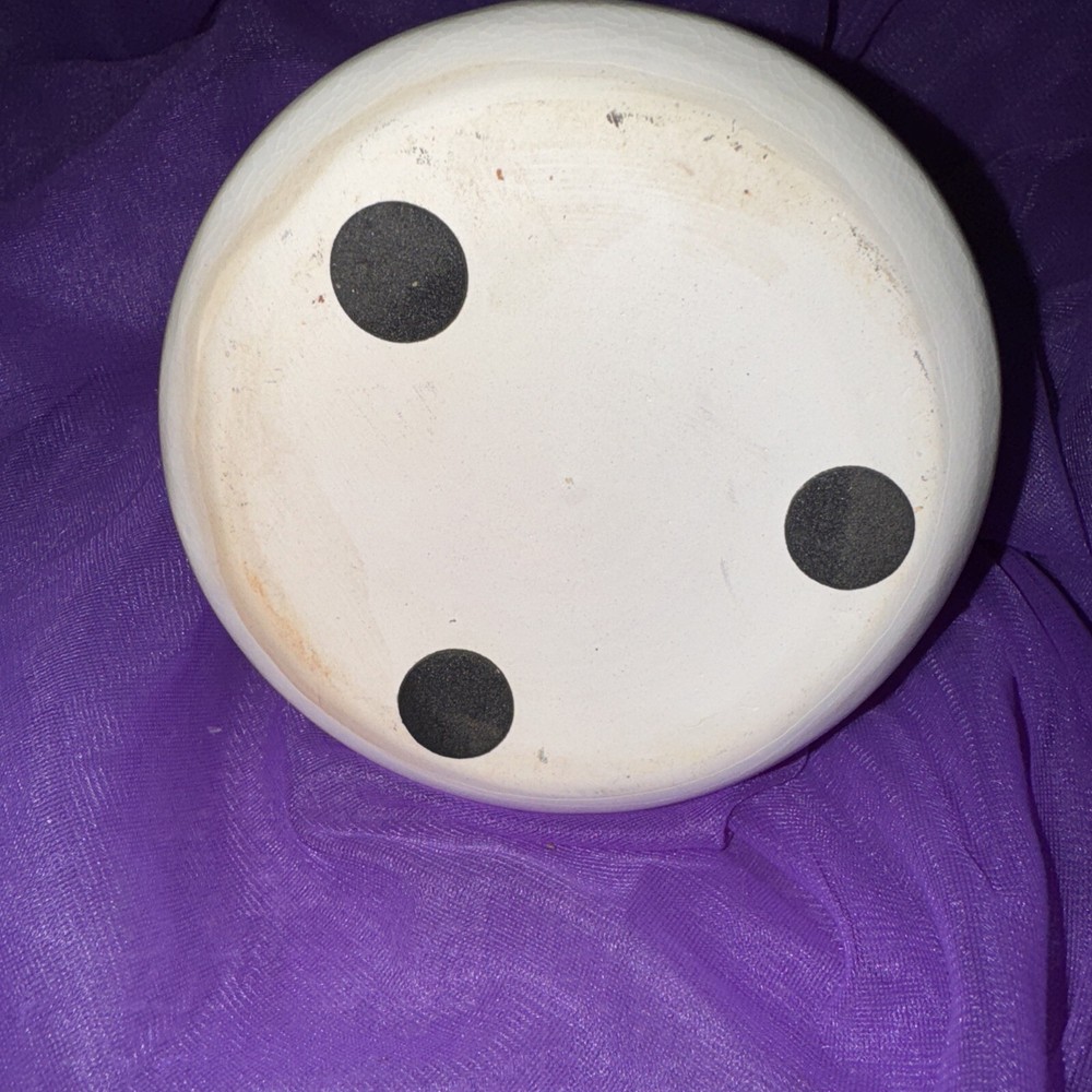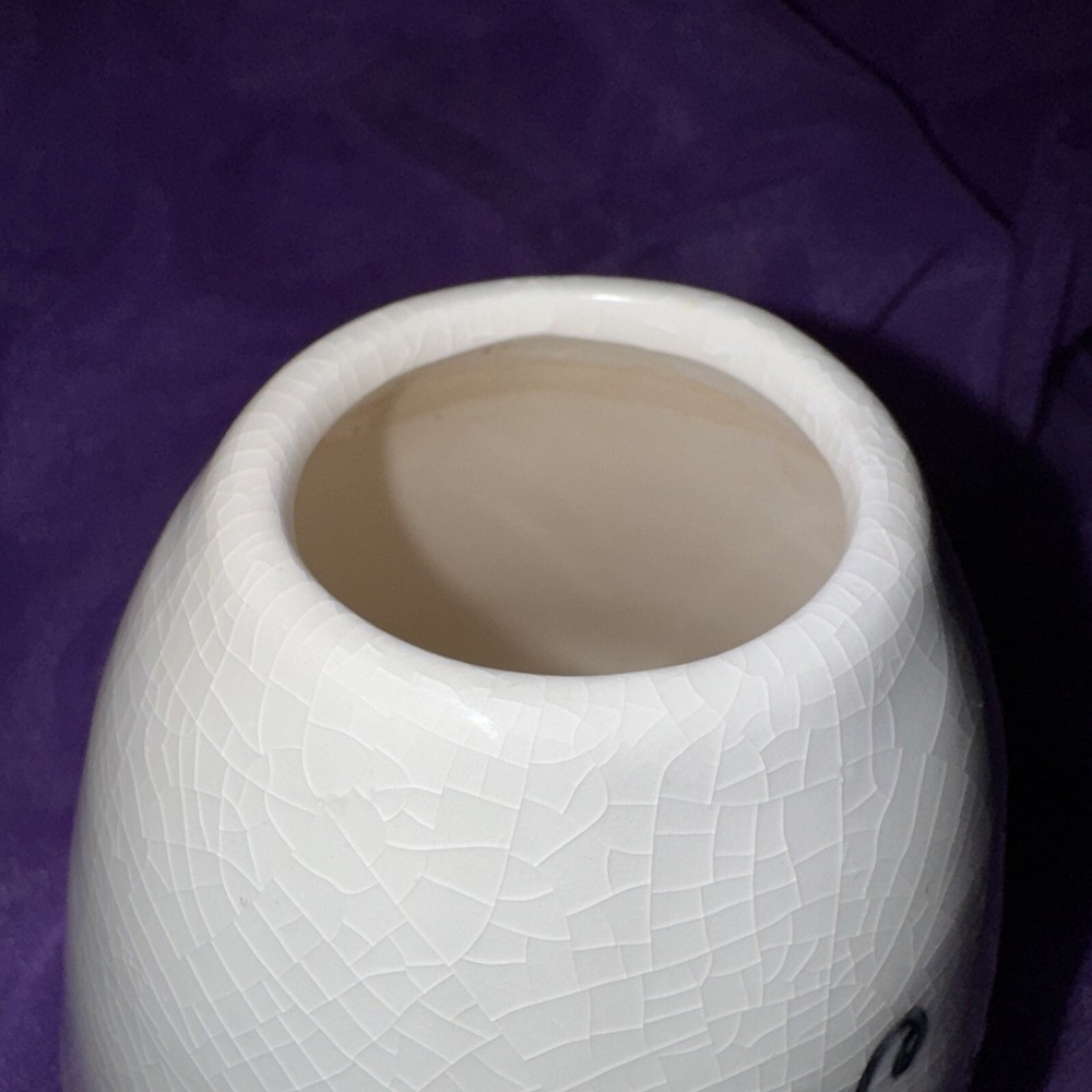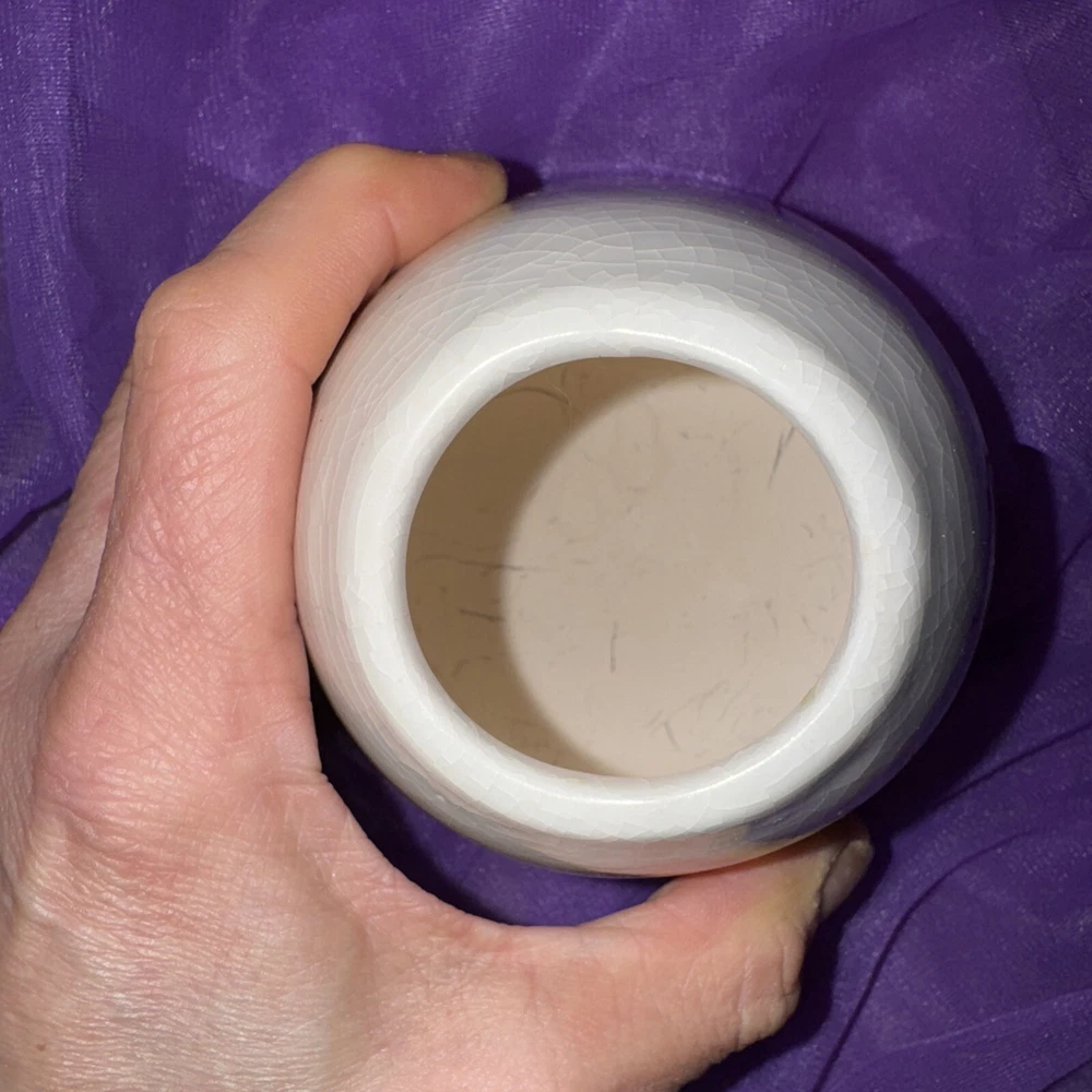Gorgeous well cared for no chips cracks or stains. An adorable vase for display anywhere you want to add some whimsy. See all pics. There are a few scratches inside the vase from having an artificial plant in it. (The wire stems scratched it). I was going to try and scrub it clean but since it’s unseen I will leave that choice up to the buyer. As with some of the earlier pieces before they went more mainstream this is not signed. 4” tall 4 “ base