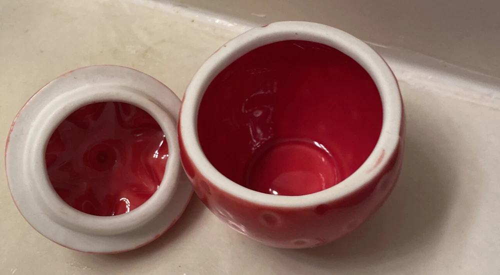 Creative Co. - Op Strawberry Stoneware Jar & Bowl. Estate sale item Bowl- 5” long x 2” H Strawberry- with lid- 3.5” H x 2.5” diameter Very good condition