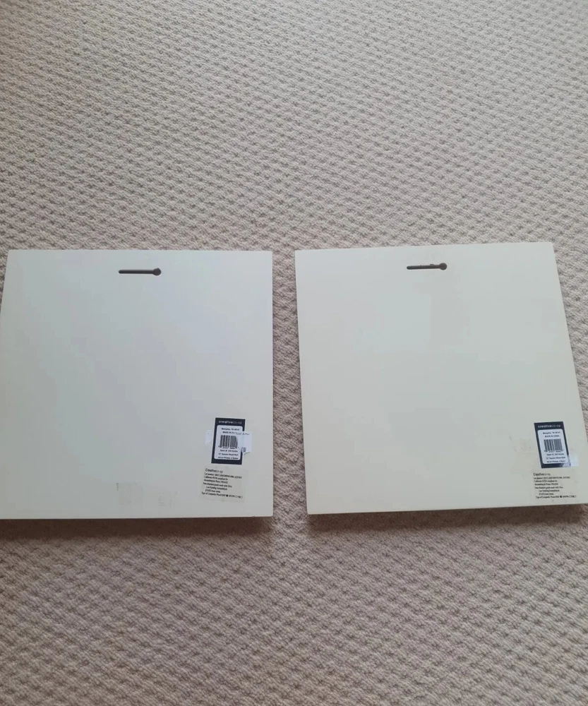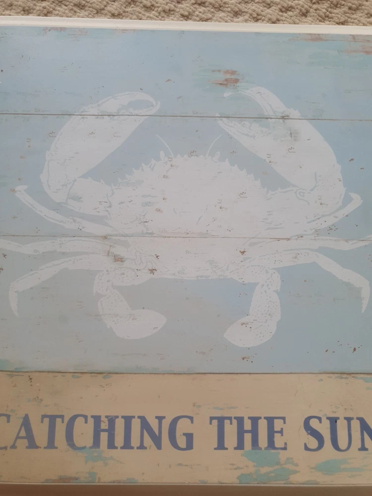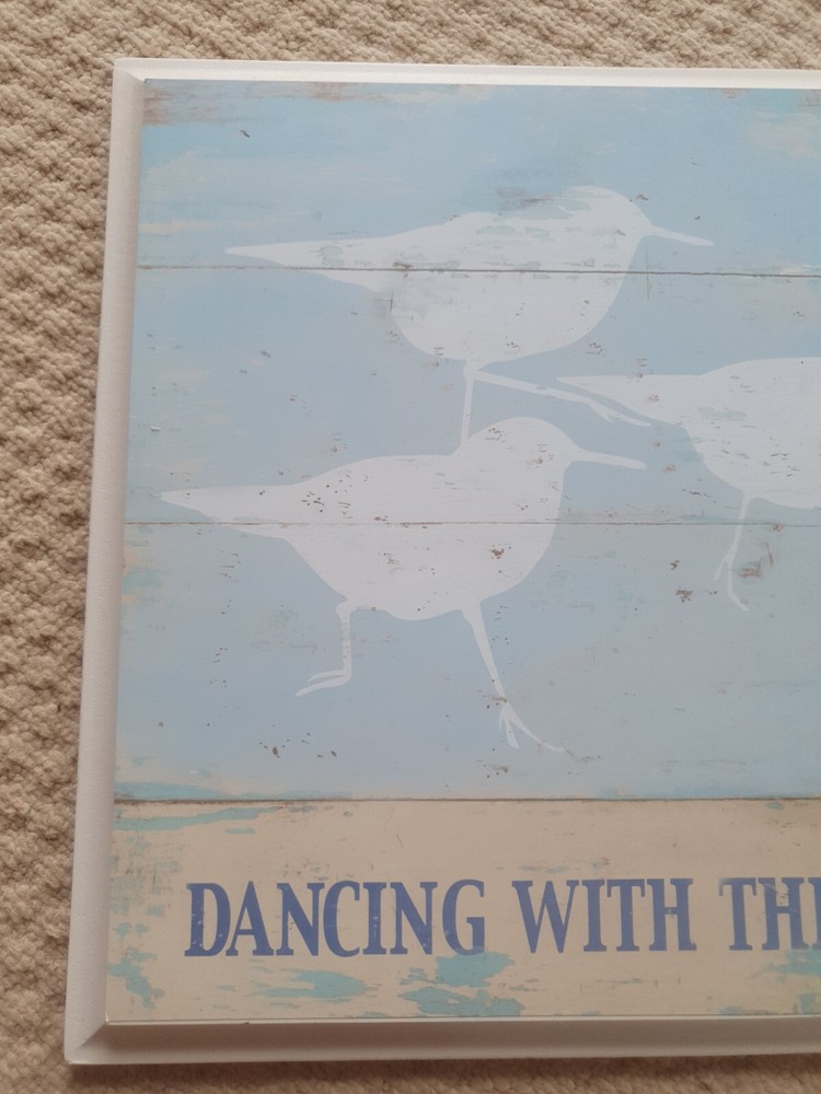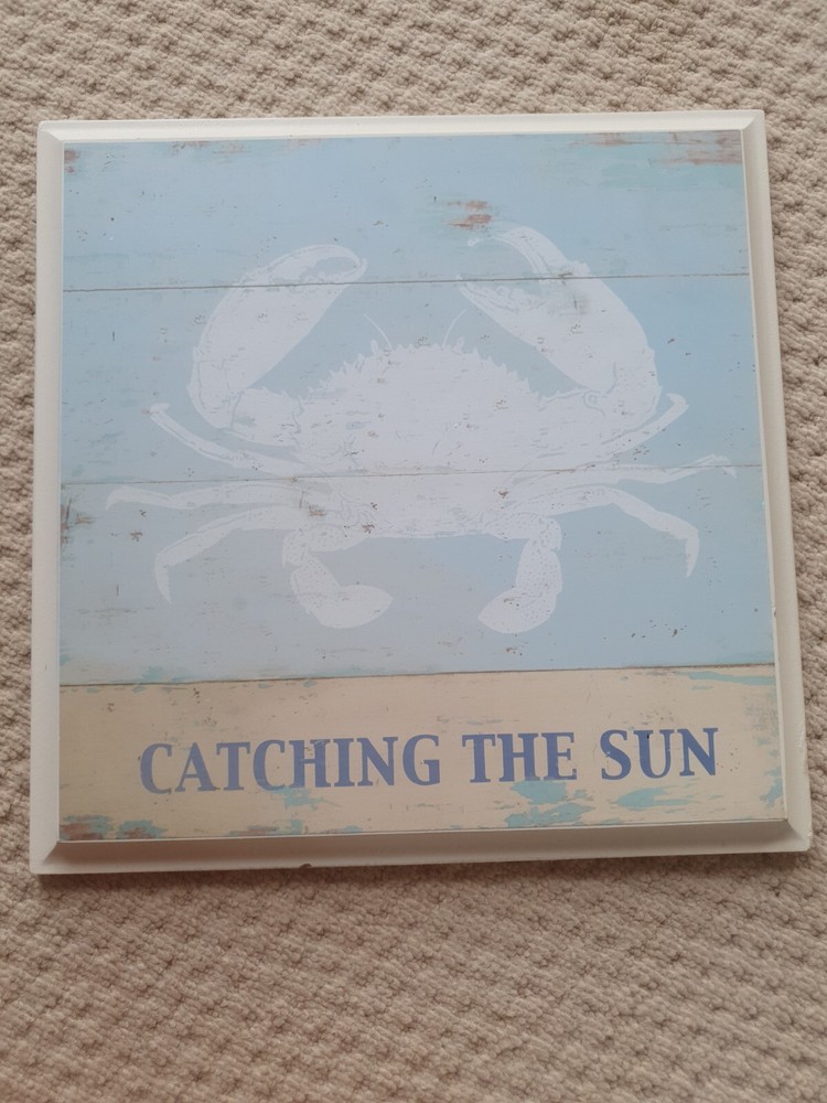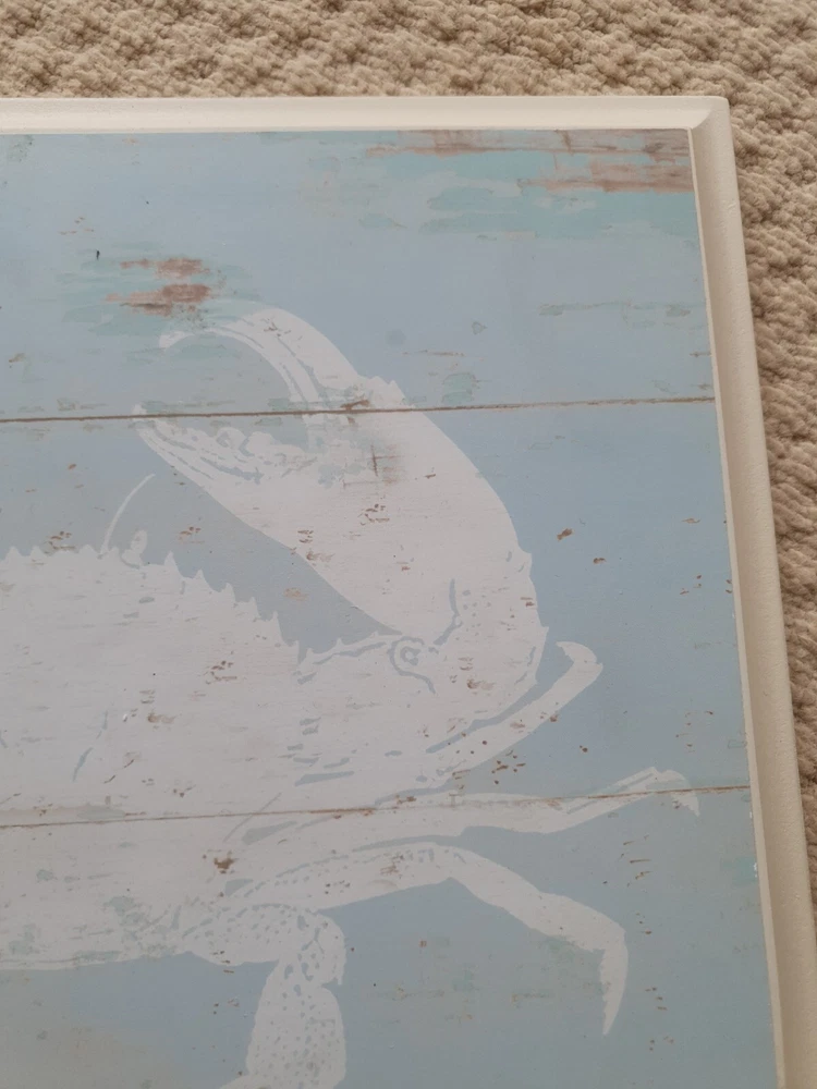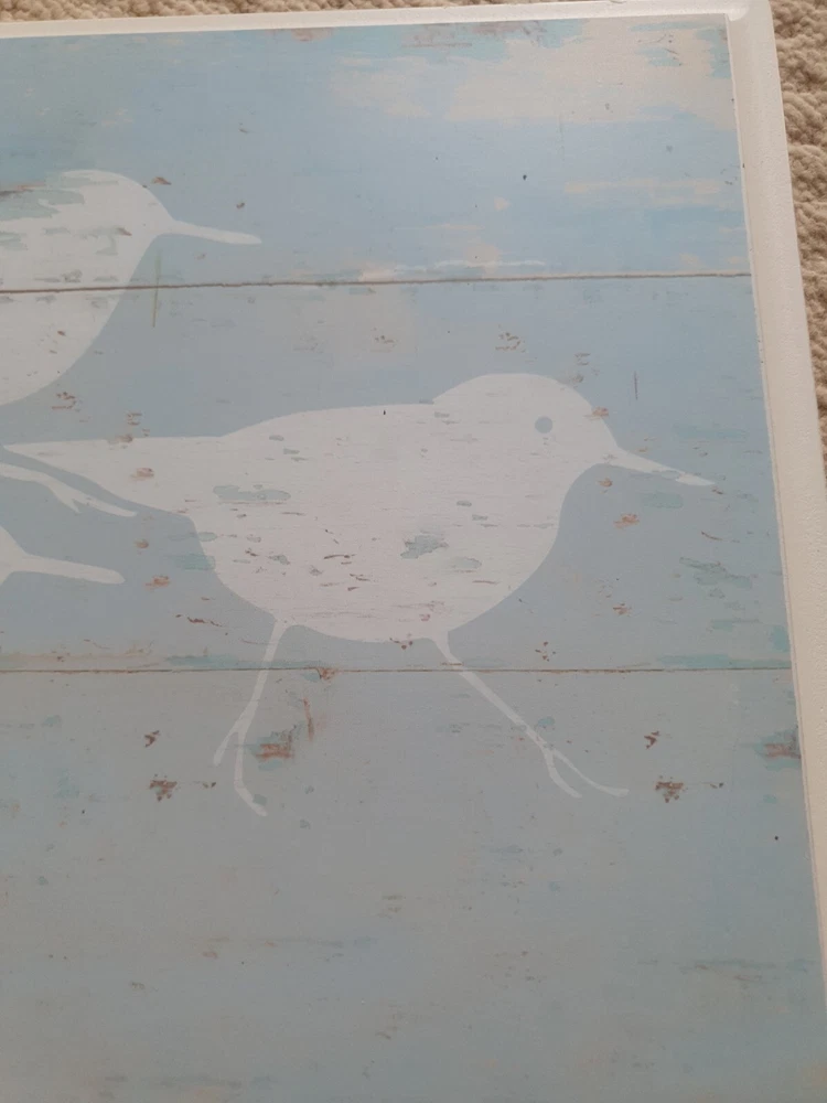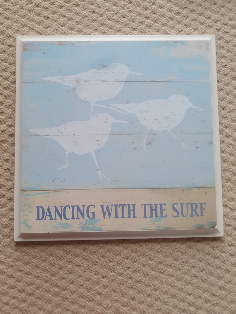 Creative Co-Op 13" Square Wood Wall Pictures Blue & Yellow Surf Birds Sun Crab. Lovely pictures. Made to look as if painted on wooden planks. Beautiful duck egg Blue and pale yellow. Bargain price. Please look at my other items for sale. I can usually combine the postage.