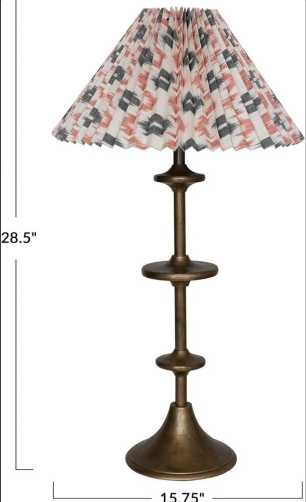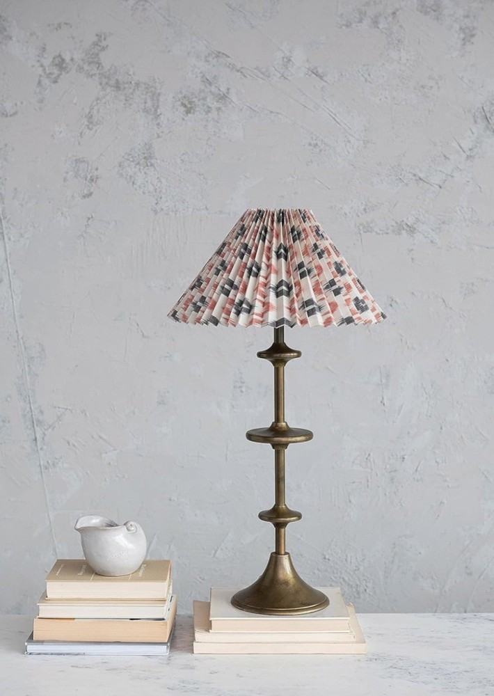 base only & Lamp Shade Elevate your space with the Creative Co-Op Round Metal Table Lamp, a blend of vintage charm and modern elegance. The pleated cotton shade adds a touch of classic sophistication, while the brass accents provide a warm, inviting glow. Ideal for any room, this lamp is designed to complement a variety of decors, from coastal to industrial. The lamp features a 15.75-inch round metal base that ensures stability and durability. It's equipped to hold a 40-watt bulb, offering ample illumination for reading or creating a cozy atmosphere. The model number DF8188 marks the authenticity of this stylish piece from Creative Co-Op's esteemed collection.