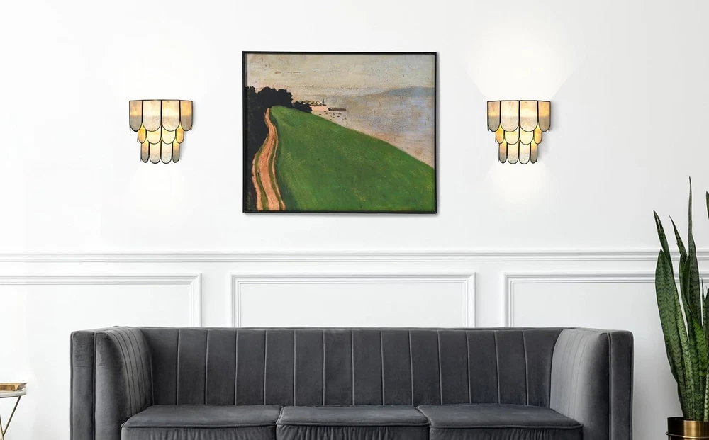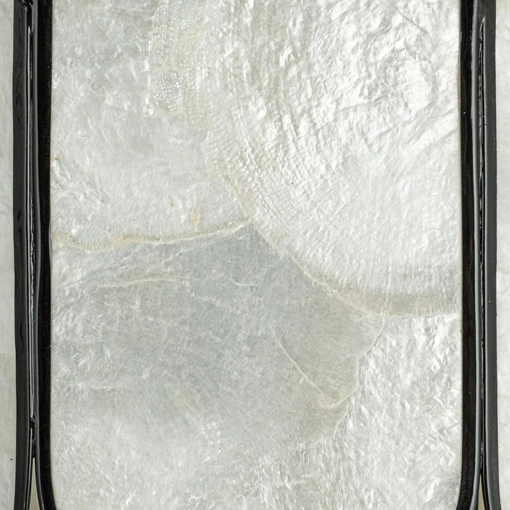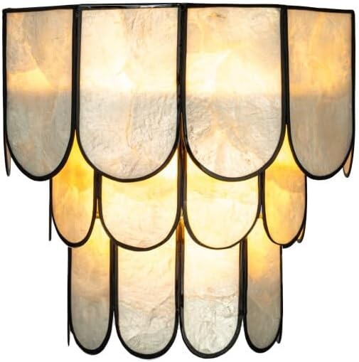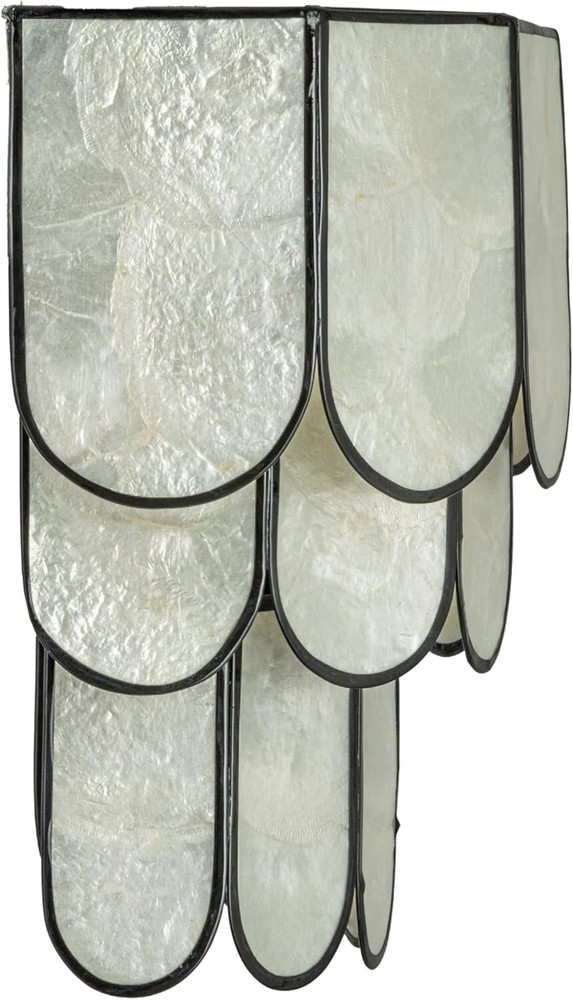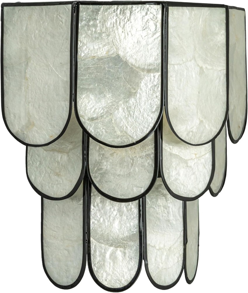 A stunning and elegant wall sconce with a black metal frame and a tiered shade made of natural capiz shells A perfect addition to any room that needs natural and glamorous lighting with a touch of coastal, boho, or modern style Requires one 60-watt bulb (not included) and requires hardwiring Made of natural capiz shells; each piece may vary from pearly to various shades of ocean browns