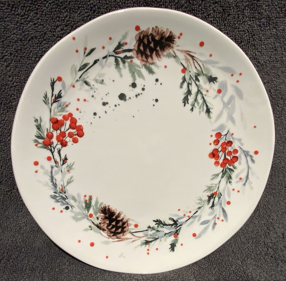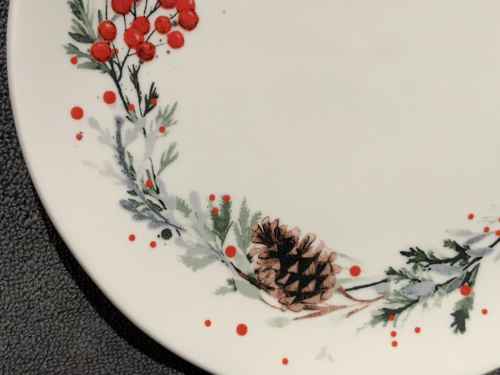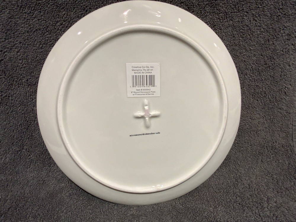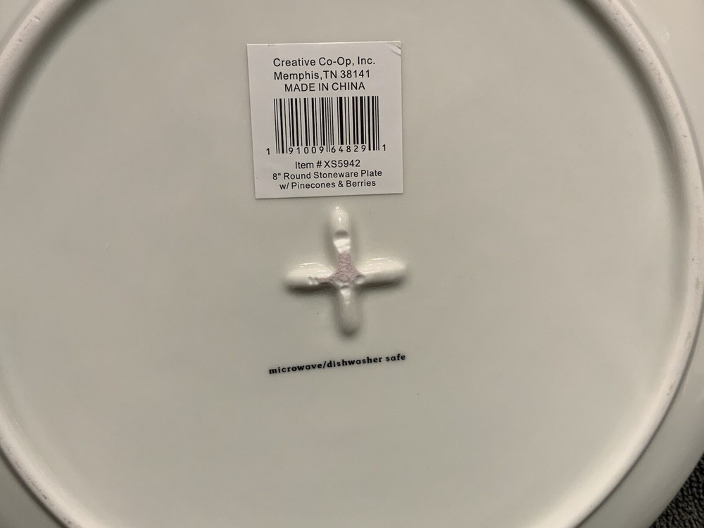 The Creative Co-Op 8” Round Stoneware Plate with Pinecones & Berries is a two-piece set featuring a round shape with a multicolor design of berries, makes a lovely plate to use during the winter season or anytime. Made of stoneware with a glossy finish this salad/desert plate is printed with the backstamp and weighs 1lb. 4.8oz. These decorative pieces from China add a touch of creativity to your table setting perfect for serving your favorite salads or desserts. No signs of use as far as I can tell and in very good condition.