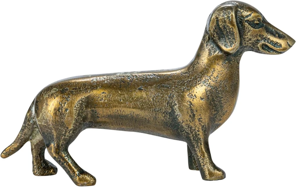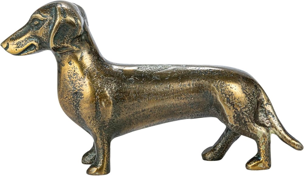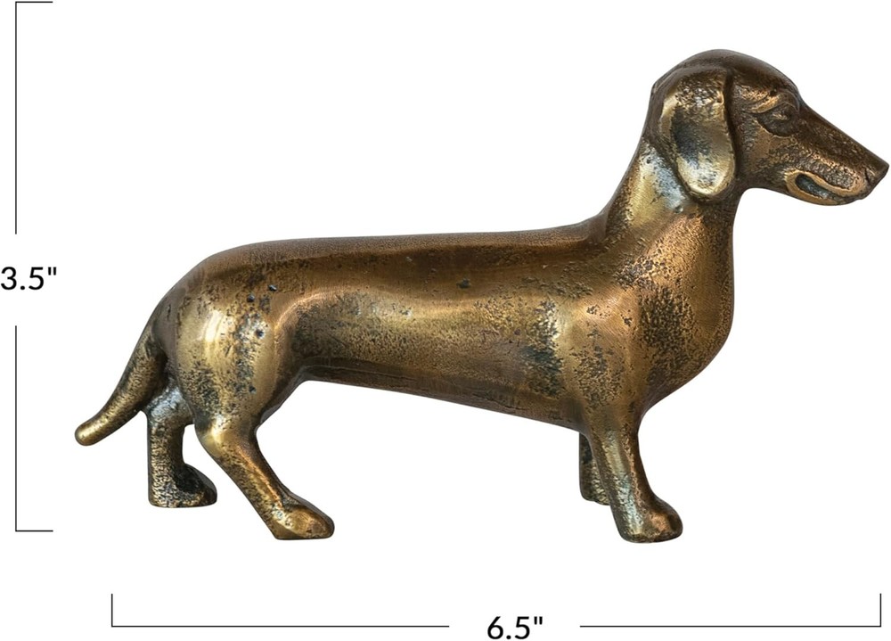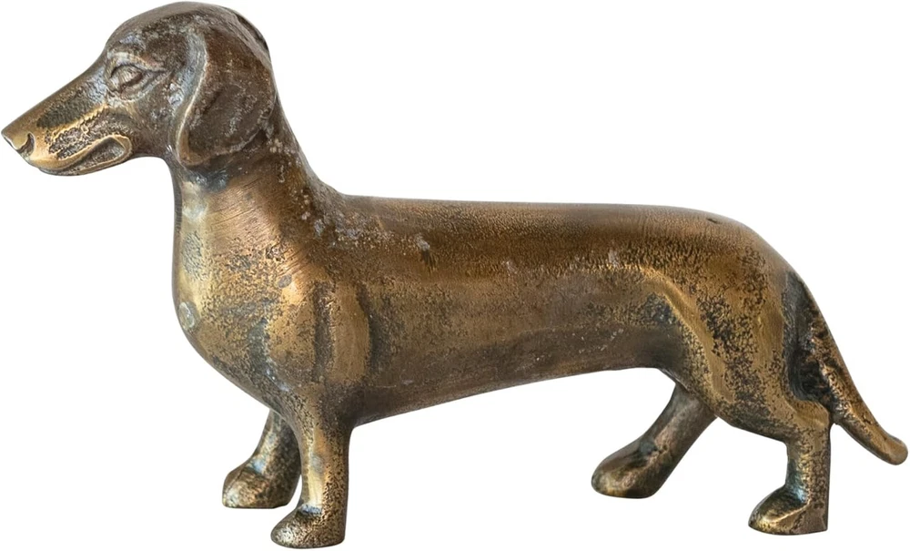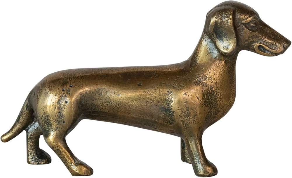 Creative Co-Op Antique Cast Aluminum Dachshund Accent Decor, Brass Product Details Product Dimensions: 6.5 x 1.5 x 3.5 inches Item Weight: 7.4 ounces Manufacturer: Creative Co-Op Country of Origin: India Item model number: DF8544 Specific instructions for use: Indoor Finish types: Antique Brass Finish Care instructions: Wipe Clean Number of pieces: 1 Batteries required: No A charming and adorable accent decor that features a cast aluminum dachshund with an antique brass finish Ideal for adding a touch of farmhouse, cottagecore, French country, vintage, or traditional style to the home or office Features a realistic and detailed design that captures the shape and expression of the dachshund; can be displayed on a shelf, table, or desk Made of cast aluminum, a lightweight and durable material that has a smooth and shiny surface Measures 6.5 inches in length, 1.5 inches in width, and 3.5 inches in height This accent decor is a must-have for dog lovers or animal enthusiasts. The accent decor is made of cast aluminum, a material that is lightweight and durable. The accent decor has a dachshund shape that is realistic and detailed. The dachshund has an antique brass finish that gives it a vintage and elegant look. The dachshund has a cute and expressive face that will make one smile. The accent decor is suitable for any style, from farmhouse to traditional. The accent decor is also versatile and can be used in any room, such as the living room, bedroom, bathroom, or office. The accent decor is easy to clean and maintain, and it will make the space look more cozy and lovely. Create a warm vibe or show off their dog passion, this accent decor will help them do it with style and flair.