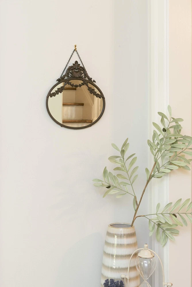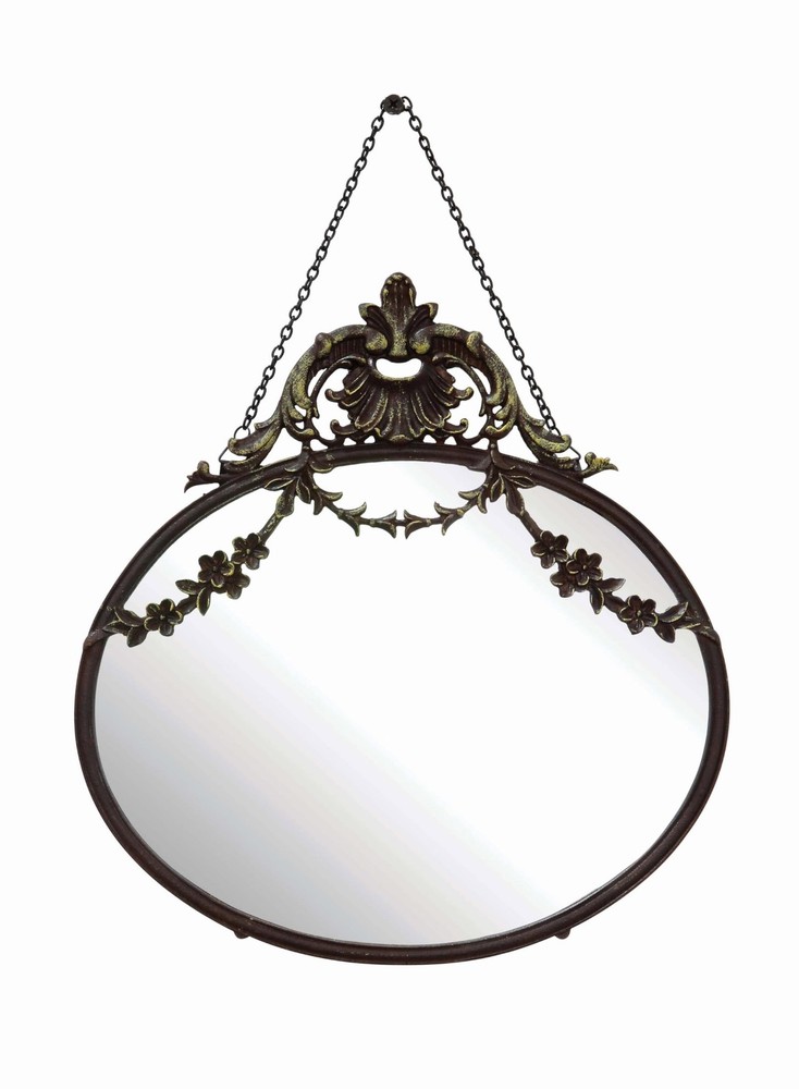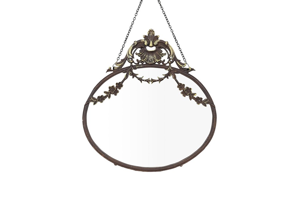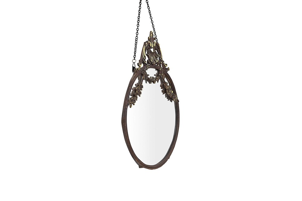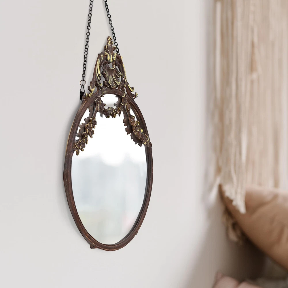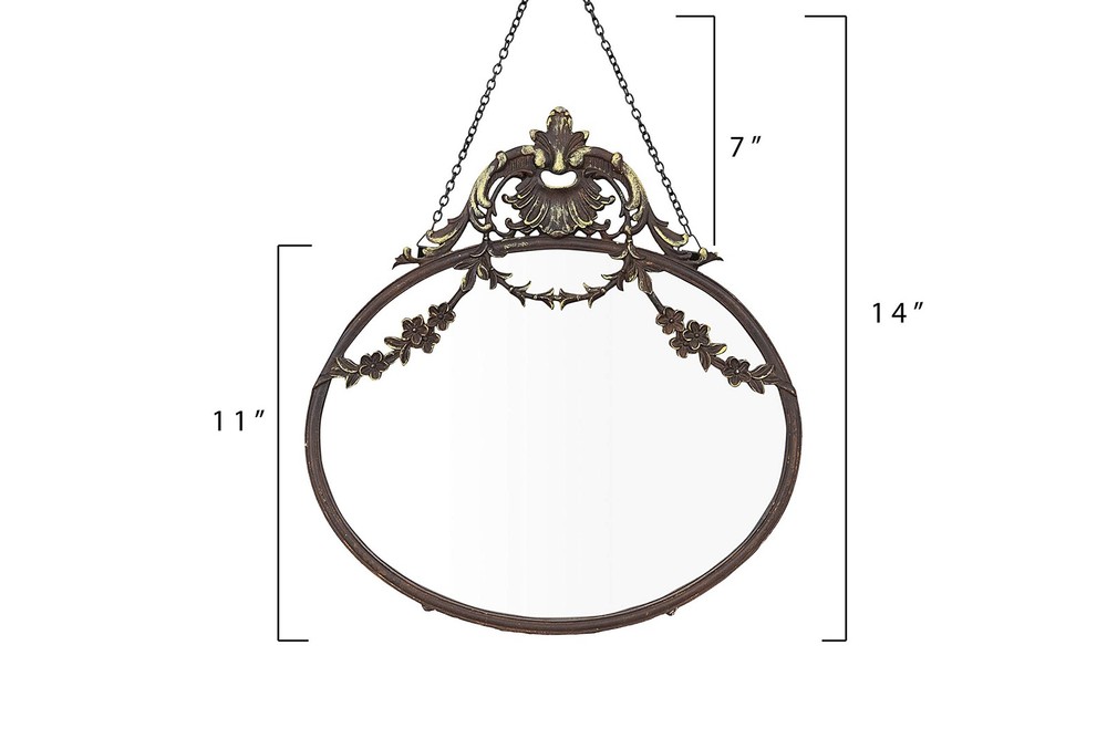A statement-making wall mirror that showcases a dramatic pewter frame and a decorative chain Ideal for adding some vintage charm and elegance to any living space, such as a bedroom, bathroom, or entryway Comes with hanging mechanisms for easy installation, can be hung easily with the chain Made from pewter, glass, and reclaimed wood Measures 10.5 inches wide and 13.5 inches high