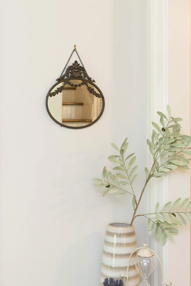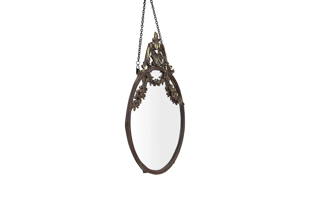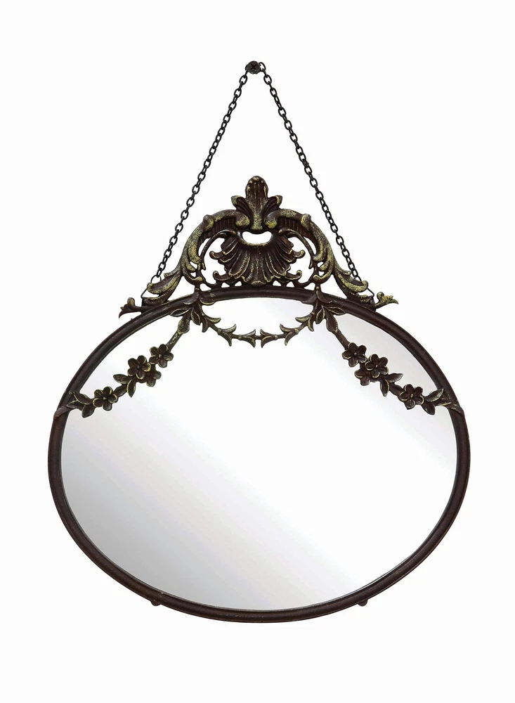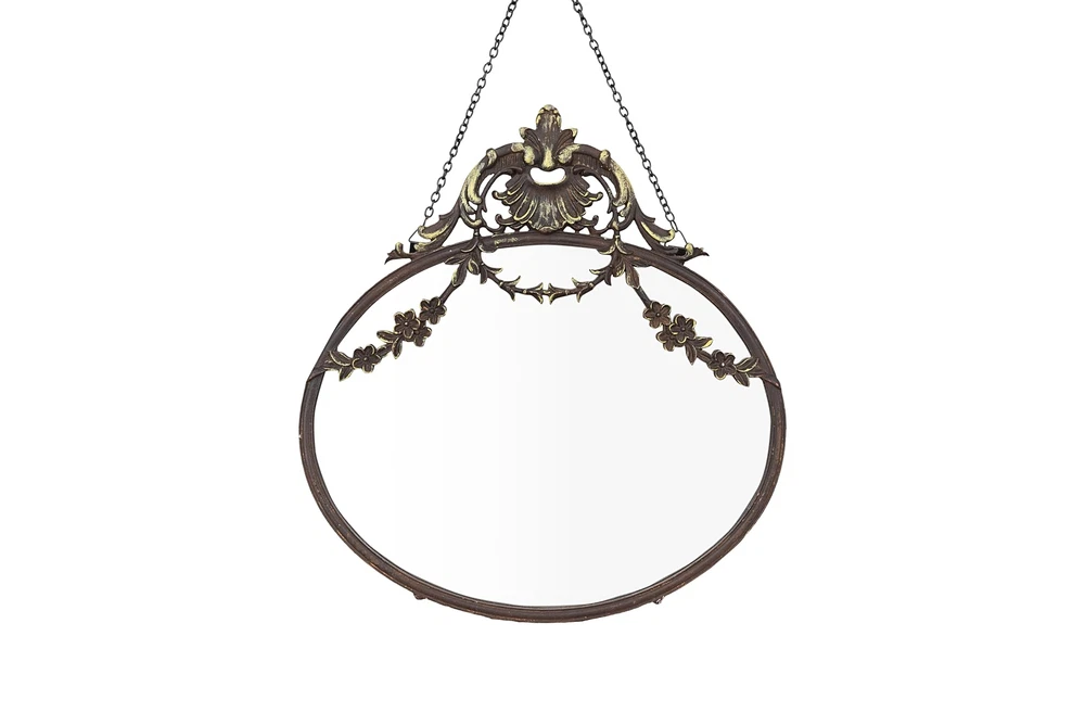 Add vintage charm and elegance to the home with this distressed bronze antique pewter wall mirror with a chain. This wall mirror is a statement-making piece that showcases a dramatic pewter frame and a decorative chain. The pewter frame has a distressed bronze finish that adds warmth and character to the wall, while the round shape reflects light and opens up the space. The decorative chain adds some interest and dimension to the wall, allowing the user to hang the mirror quickly. This wall mirror is ideal for adding vintage charm and elegance to any living space, such as a bedroom, bathroom, or entryway. Hang it on its own or as part of a gallery wall. This wall mirror comes with hanging mechanisms for easy installation. It can be hung easily with the chain that attaches to the wall. This wall mirror is made from pewter, glass, and reclaimed wood, making it sturdy and durable. It measures 10.5 inches in diameter and 13.5 inches in height, making it a perfect size for any space. This mirror is a stunning piece that will add a touch of sophistication to any home. A statement-making wall mirror that showcases a dramatic pewter frame and a decorative chain Ideal for adding some vintage charm and elegance to any living space, such as a bedroom, bathroom, or entryway Comes with hanging mechanisms for easy installation, can be hung easily with the chain Made from pewter, glass, and reclaimed wood Measures 10.5 inches wide and 13.5 inches high