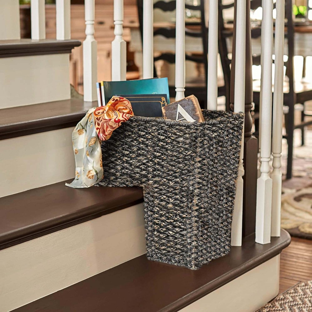 Items that need to be taken upstairs often get spread all over the bottom of the stairs in a haphazard fashion. This not only makes a mess but is also a safety hazard. Place this stair basket on the bottom two steps and allow it to collect all the items that need to be taken upstairs through the day. When ready to head upstairs, grab the convenient handles and take everything up at once. Items then can be carried to each portion of the upstairs and put away where they belong. Perfect for placing at the bottom of stairs for a display item Great for storage or displaying items Sits beautifully on any staircase