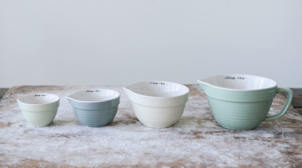 Creative Co-Op Batter Bowl Shaped (Set of 4 Sizes) Measuring Cups, Multicolor, 6.5 x 5 Product Details Color: Seafoam Green Brand: Creative Co-Op MPN: DA9490 UPC: 191009106081 EAN: 0191009106081 Color: Seafoam Green Material: Ceramic Capacity: 1.5 Cups Brand: Creative Co-Op Item dimensions L x W x H: 4.5 x 5 x 6.5 inches Color: Seafoam Green Material: Ceramic Capacity: 1.5 Cups Brand: Creative Co-Op Item dimensions L x W x H: 4.5 x 5 x 6.5 inches Item Weight: 1.5 Pounds Global Trade Identification Number: 81 Manufacturer: Creative Co-Op Size: 6.5 x 5 UPC: 191009106081 Product Dimensions: 4.5 x 5 x 6.5 inches Item Weight: 1.5 pounds Country of Origin: China Item model number: DA9490 Is Discontinued By Manufacturer: No Dishwasher compatible: Yes Number of pieces: 4 Warranty Description: None. Batteries required: No Made from stoneware Stoneware bowls provide an attractive and functional addition to your kitchen 1/4 cup (2 oz.): 2.75"L x 2.5"W x 1.75"H 1/2 cup (4 oz.): 3.5"L x 3.25"W x 1.75"H 1 cup (8 oz.): 4.25"L x 4"W x 2.25"H 1 1/2 cup (12 oz.): 6.25"L x 4.5"W x 2.75"H (with handle) These charming measuring cups are inspired by vintage batter bowls. Perfect for your cooking needs, the inside of each of these measuring cups is marked in both ounces and cups. One side of each is designed with a V-shaped spout for easy pouring. They stack inside each other for easy storing and are dishwasher safe.