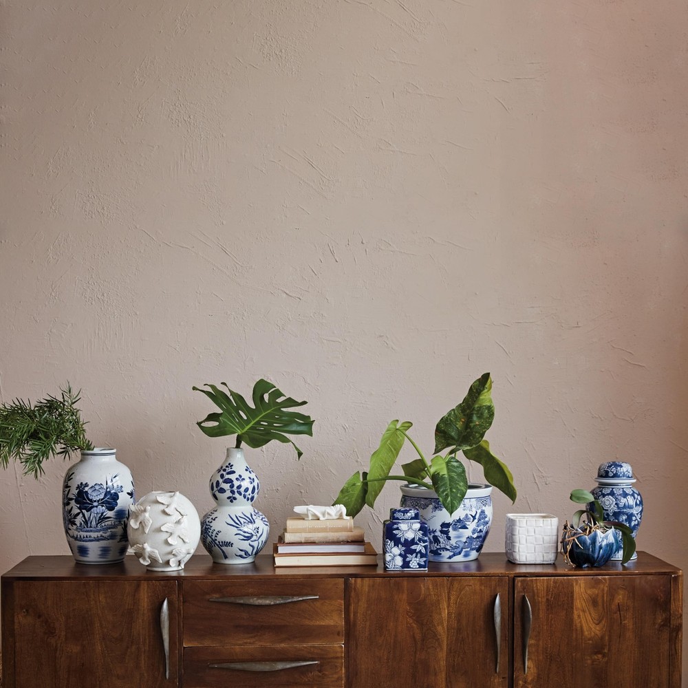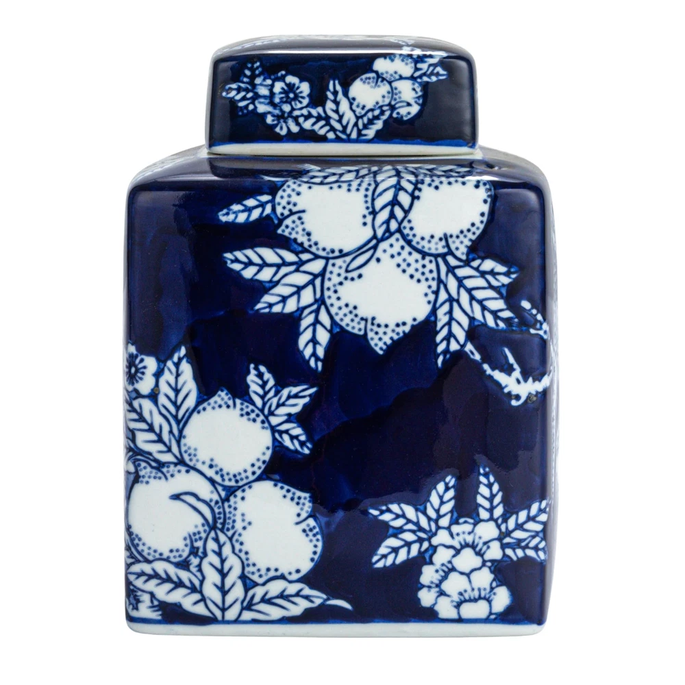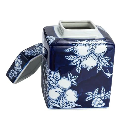 This ceramic ginger jar with lid is a charming and functional addition to any kitchen. It has a square base and a round top, which are smooth and comfortable to hold and use. It features a blue and white color and a floral pattern, creating a harmonious contrast between the ceramic and paint. The jar is designed for storage of spices, herbs, candies, or cookies, and can be used as a decorative item or vase. It can match various decor styles, creating a cozy atmosphere. The durable ceramic material makes cleaning easy. This blue and white ceramic ginger jar is a perfect gift or addition to any kitchenware collection. A ceramic ginger jar with a lid, featuring a blue and white color and a floral pattern, with a square base and a round top A classic and elegant piece that can suit various decor styles, such as coastal, beach, cottagecore, French country, or farmhouse This ginger jar can be used to store spices, herbs, candies, or cookies, or as a decorative item or a vase Made of ceramic, this ginger jar is durable, easy to clean, and resistant to cracks and chips Measures 5 inches in length and width, and 8 inches in height