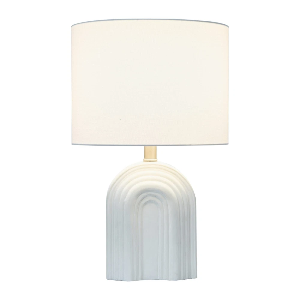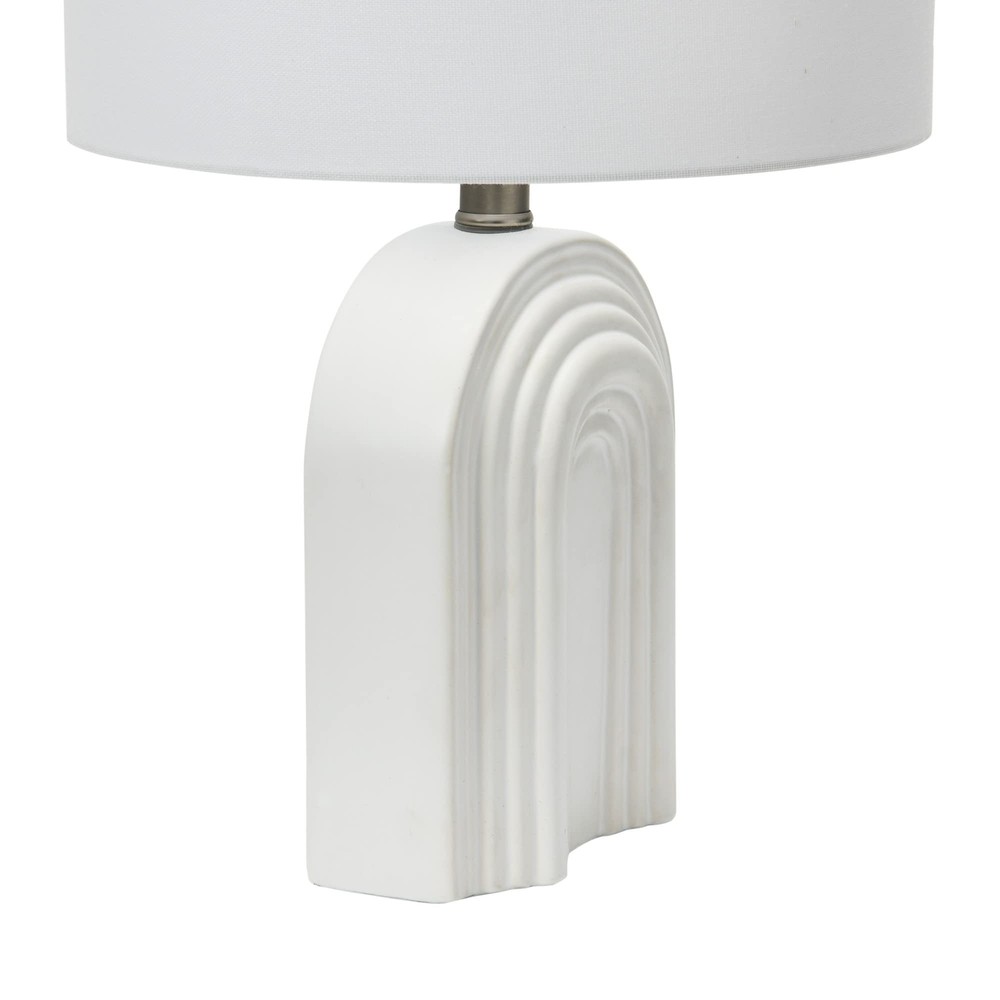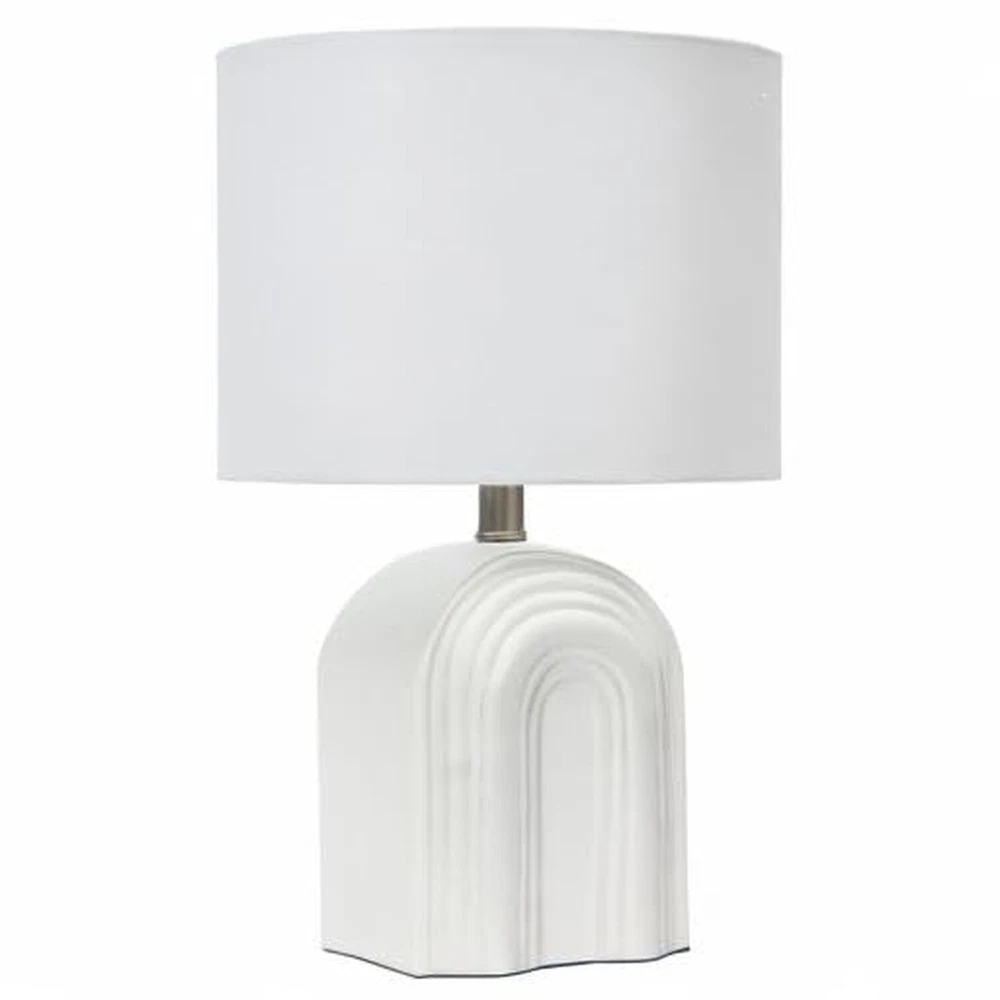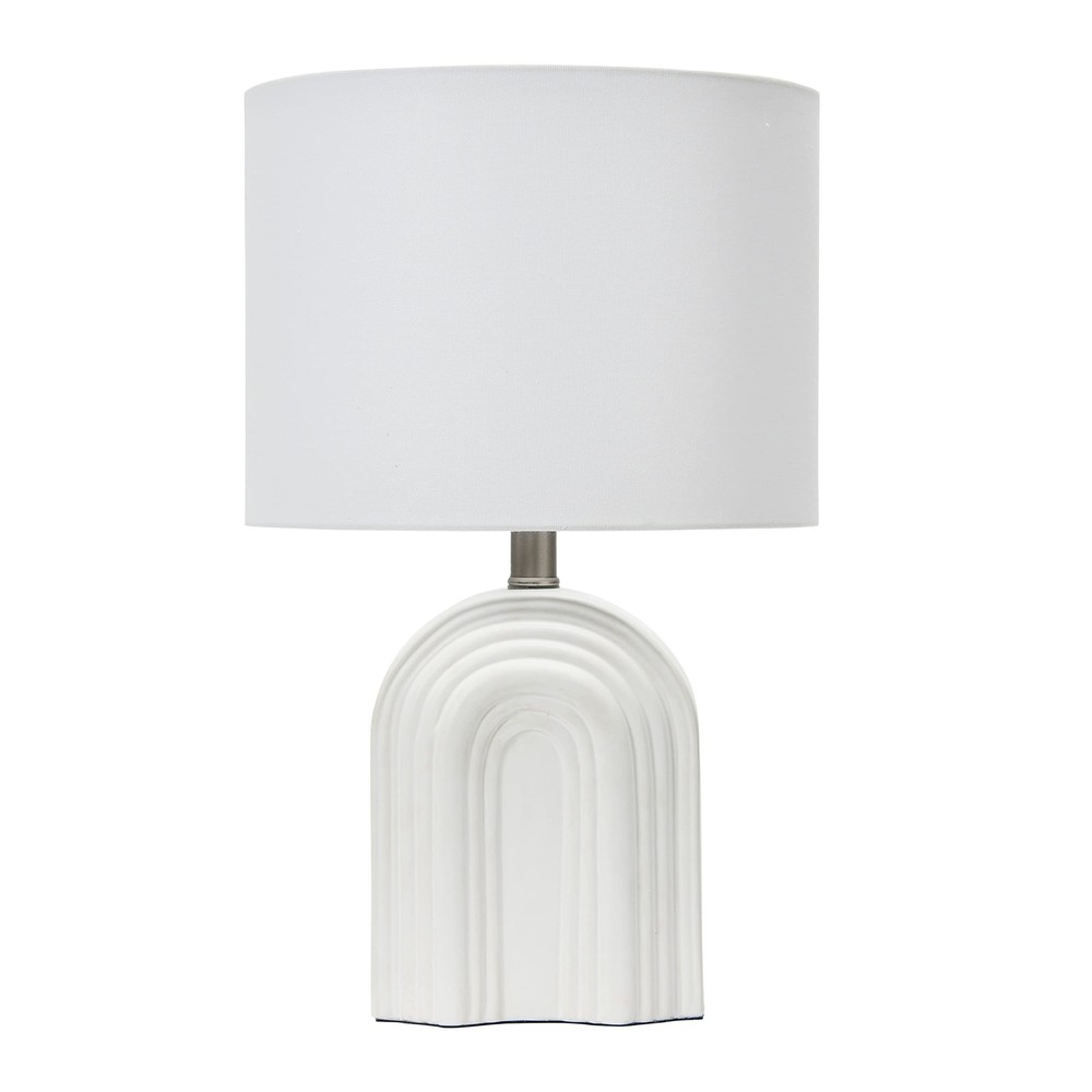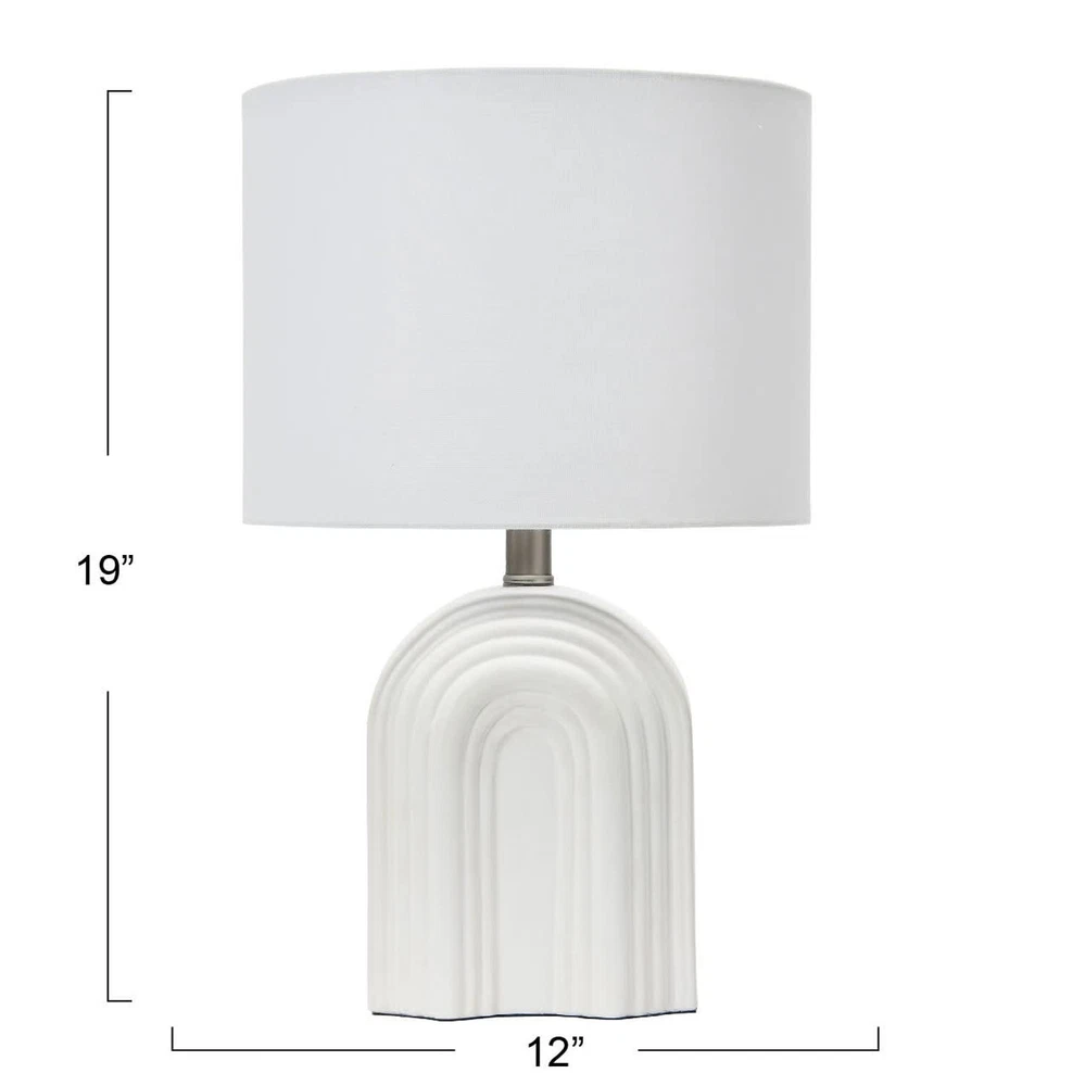 Creative Co-Op Carved Arch Stoneware Table Lamp with Linen Drum Shade, White Product Details Finish Type: White Finish Base Material: Stoneware Product Dimensions: 12"D x 12"W x 19"H Item Weight: 6.53 Ounces Lamp Type: Table Lamp Finish Type: White Finish Base Material: Stoneware Product Dimensions: 12"D x 12"W x 19"H Item Weight: 6.53 Ounces Lamp Type: Table Lamp Shade Color: off white Shade Material: Linen Switch Type: Rotary Style: Modern Brand: Creative Co-Op Color: White Light Source Type: LED Material: Stoneware Power Source: Plug-in Shape: Oval Number of Light Sources: 1 Connectivity Technology: USB Included Components: Table Lamp Is Waterproof: False Mounting Type: Tabletop Wattage: 60 watts Number of Items: 1 Control Method: Touch Indoor/Outdoor Usage: Indoor Water Resistance Level: Not Water Resistant Number of Pieces: 1 Is Cordless?: No UPC: 191009517405 Manufacturer: Creative Co-Op Shade Height: 12 Inches Part Number: EC1279 Item Weight: 6.5 ounces Country of Origin: China Item model number: EC1279 Finish: White Finish Pattern: Solid Item Package Quantity: 1 Batteries Required?: No Warranty Description: None. Date First Available: June 27, 2022 This sculptural table lamp showcases a carved arch stoneware base topped with a linen drum shade Carved arch stoneware table lamp in a white finish with a linen drum shade Equipped with a rotary switch Maximum 60W bulb not included Lamp measures 12" L x 12" W x 19" H Curate a calming environment with the ambient diffused light of an expertly crafted table lamp; This stunning mix of materials and textures brings warmth and serenity to a space of any style from boho to modern