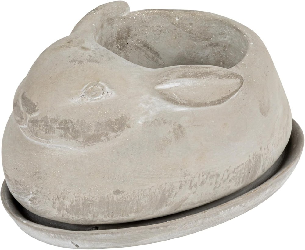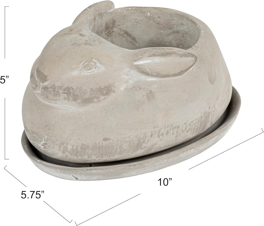 Creative Co-Op Cement Rabbit Planter with Saucer (Set of 2 Pieces) Gray Product Details Material: Concrete Color: Gray Special Feature: Indoor-Outdoor Use Style: Modern Planter Form: Plant Pot Shape: Novelty Indoor/Outdoor Usage: Indoor Mounting Type: Tabletop Plant or Animal Product Type: Flower Product Dimensions: 5.87"D x 9.85"W x 5.12"H Brand: Creative Co-Op Number of Pieces: 2 Pattern: Solid Included Components: Cement Rabbit Shaped Planter with Saucer Finish Type: Unfinished Number of Levels: 1 Item Weight: 7.93 pounds Manufacturer: Creative Co-op Country of Origin: China Item model number: DA7094 Finish types: Unfinished Assembly required: No Batteries required: No A charming and whimsical cement planters shaped like rabbits that will add some fun and personality to the garden or home Ideal for rustic, farmhouse, or cottage style décor, these planters can hold a variety of plants, flowers, or herbs in 4-inch pots The planters are made of concrete and have a realistic rabbit shape, with matching saucers to protect the surfaces, it can hold a 4 inches pot Made of cement The planter measures 10 inches long, 5.75 inches wide, and 5 inches tall Bring some joy and cuteness to any garden or home with this set of two cement rabbit planters with saucers. These adorable planters are shaped like rabbits with realistic details and a grey finish that gives them a vintage look. They can hold any 4-inch pot of choice, whether it's a succulent, a fern, or a daisy. The planters have drainage holes at the bottom to allow excess water to drain out and keep the plants healthy. Saucers are also included to catch the water and prevent any mess on the floor or table. These cement rabbit planters are made of high-quality cement material that is sturdy and durable. The planter measures 10 inches in length, 5.75 inches in width, and 5 inches in height. They can withstand outdoor conditions and maintain their charm for years. Whether placed on a porch, patio, windowsill, or shelf, these cement rabbit planters will surely brighten up any space and make anyone smile.