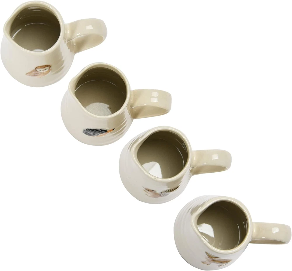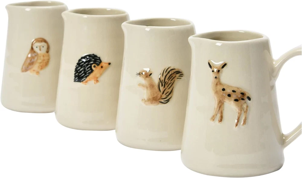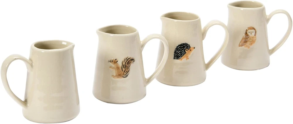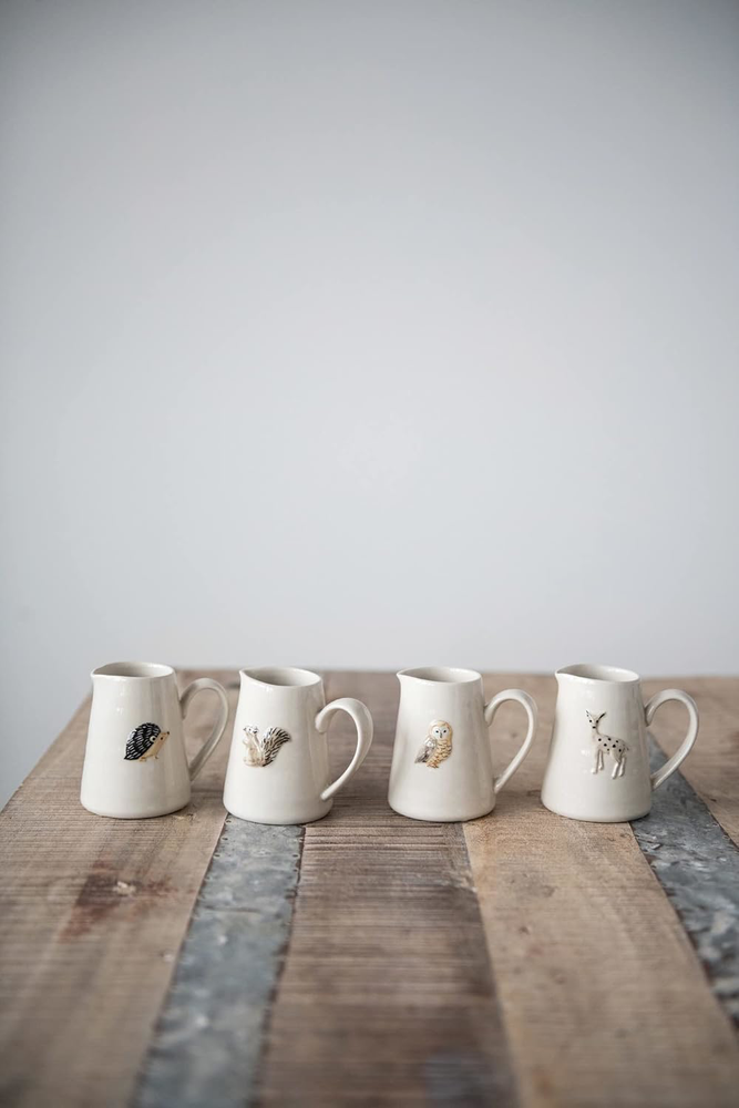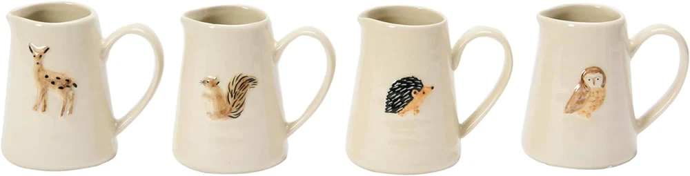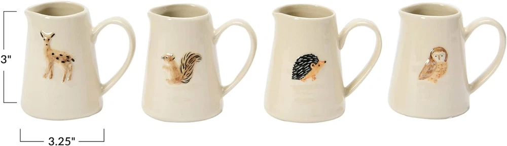 This creamer pitcher set is one fine addition to your kitchen utensils; it will not only help you to entertain your guests stylishly but will also double up to serve as exquisite shelf decor, allowing you extract maximum benefit Beautifully created out of stoneware, this set reflects expert craftsmanship; there are four different animals on the four pieces, with each of them symbolizing different things; the crème background and the embossed finish look splendid You can go a step ahead and create a unique pitcher decor by displaying these pieces together on a shelf, paired other country decorations; these pitchers can also be a great gift for friends and family Let these pitcher mugs help you create warm vibes in your dining area; they are best suited for the evenings when you can grab a nice book and a cup of coffee and have some quality 'me' time Each of these decorative ceramic pitchers measures 3.25" L x 2.50" in width and 3" H, making them a wonderful option not just as kitchen utensils but also as compact decor