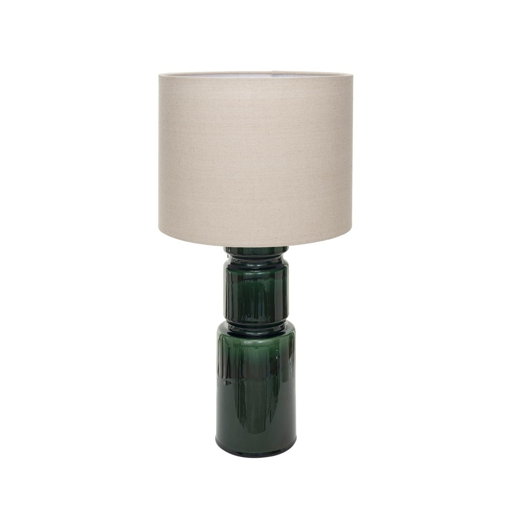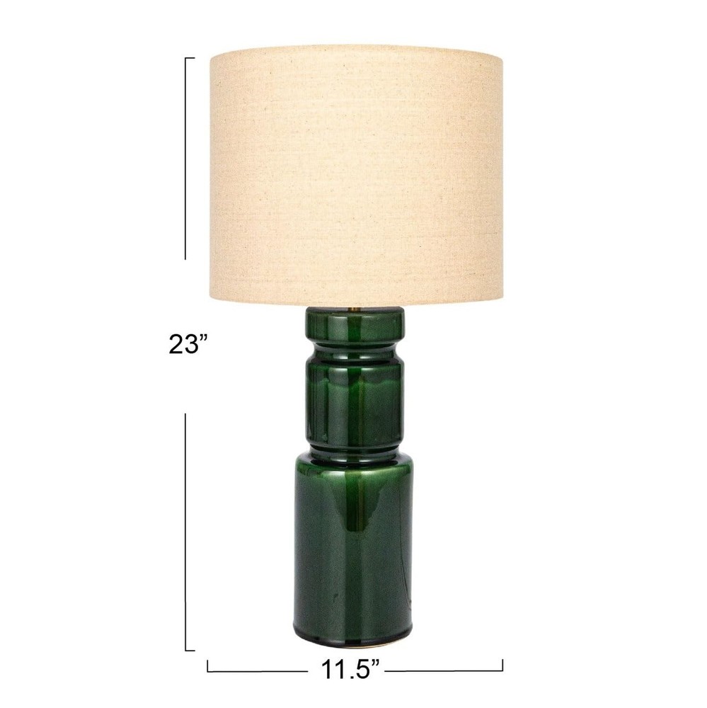 Creative Co-Op Ceramic Table LED Lamp with Natural Linen Shade, Green Product Details Finish Type: Glossy Base Material: Ceramic Bulb Base: E26 Product Dimensions: 11.63"D x 11.63"W x 23"H Item Weight: 4.4 Pounds Finish Type: Glossy Base Material: Ceramic Bulb Base: E26 Product Dimensions: 11.63"D x 11.63"W x 23"H Item Weight: 4.4 Pounds Lamp Type: Table Lamp Shade Color: Beige Shade Material: Linen Switch Type: In Line Style: Farmhouse Brand: Creative Co-Op Color: Green Special Feature: Portable Light Source Type: LED Material: Ceramic, Linen Room Type: Any Room Recommended Uses For Product: Decoration Power Source: Corded Electric Shape: Round Number of Light Sources: 1 Connectivity Technology: USB Included Components: Shade Is Waterproof: False Bulb Shape Size: A19 Mounting Type: Tabletop Wattage: 60 watts Number of Items: 1 Lighting Method: LED Control Method: Touch Indoor/Outdoor Usage: Indoor Specific Uses For Product: Decoration Water Resistance Level: Not Water Resistant Installation Type: Tabletop Number of Pieces: 1 Efficiency: [High] Base Diameter: 11.5 Inches Is Cordless?: No UPC: 191009630425 Manufacturer: Creative Co-Op Item Weight: 4.4 pounds Country of Origin: China Item model number: DF9117 Finish types: Glossy Warranty Description: No warranty. Batteries required: No A sleek and modern table lamp made of ceramic with an LED light and a natural linen shade in a green color A versatile and elegant accessory for any room style, from farmhouse to mid-century modern, from Scandinavian to round, from modern to other Requires 1 4-watt LED bulb or lower (not included), with an inline switch for easy on and off Made of ceramic and linen that are durable, eco-friendly, and easy to clean Measures 11.5 inches in diameter and 23 inches in height This ceramic table LED lamp with a natural linen shade in green is a sleek and modern addition to any room. Its smooth, glossy finish reflects light, adding a touch of sophistication. The green color adds freshness and vibrancy, while the beige shade adds softness and coziness. The lamp is suitable for various room styles, including farmhouse, mid-century modern, Scandinavian, round, and modern. It requires one 4W LED bulb and comes with an inline switch for easy on/off. Made of ceramic and linen, it is durable, eco-friendly, and easy to clean. Measuring 11.5 inches in diameter and 23 inches in height, this versatile and elegant accessory enhances the room's style and ambiance.