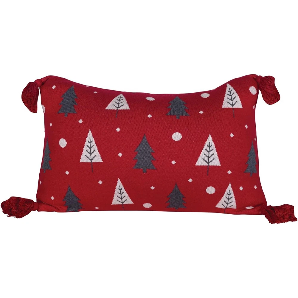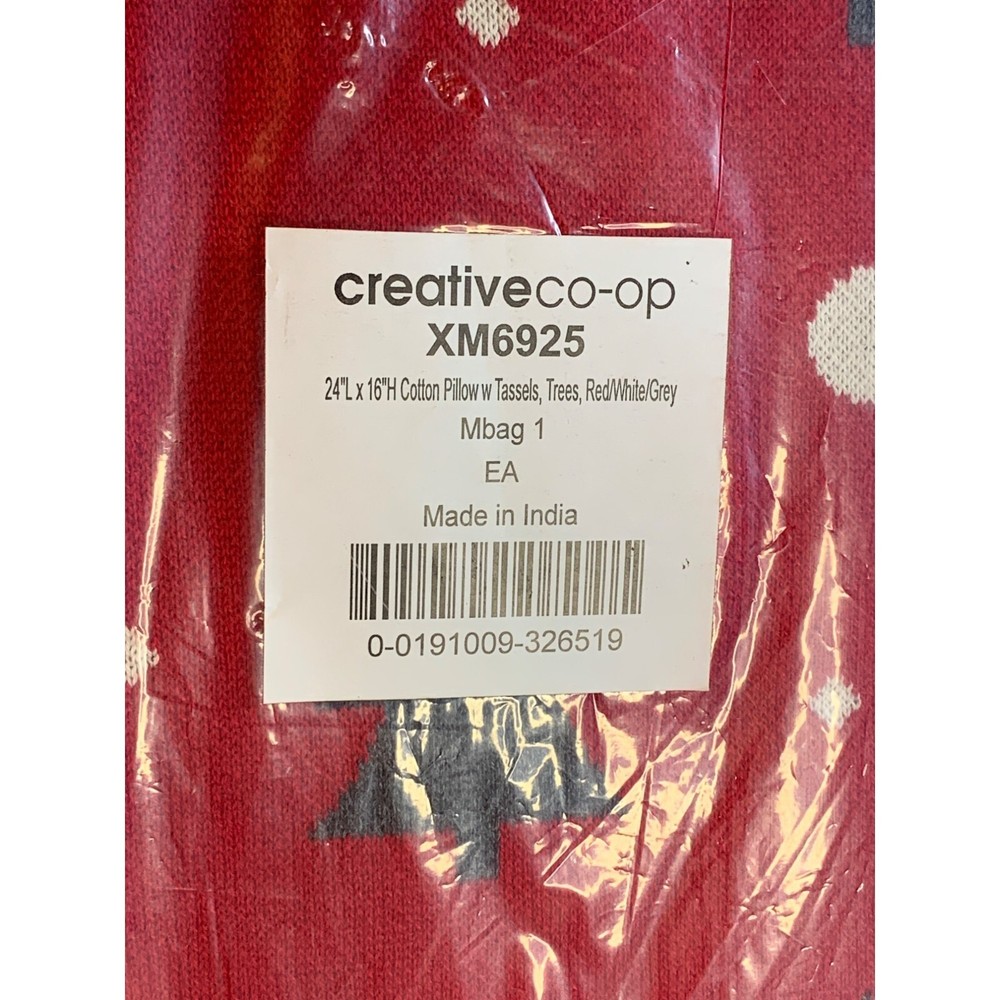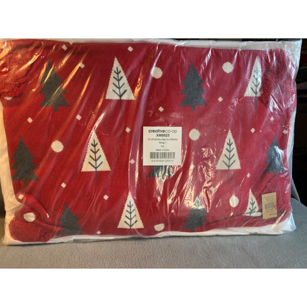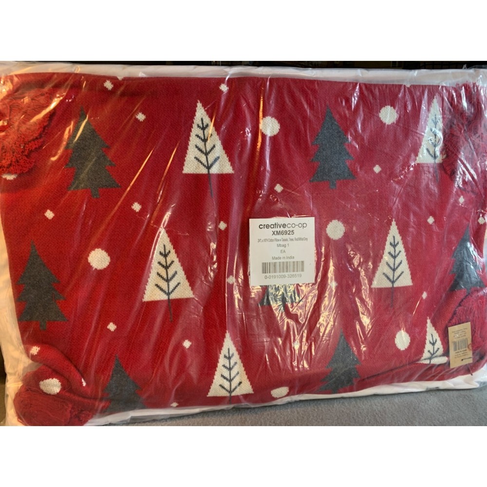 Creative Co-Op Cotton Knit Lumbar Trees and Tassels Pillows Red White Grey new in sealed package. 100% Cotton Knit Add fun to this holiday season with a special Christmas pillow Transform the bedroom for the holidays by simply adding festive pillows Perfect for adding to a couch, chair, bench or window seat 24"L x 3"W x 16"H Spot Clean Only Size: 24"L x 3"W x 16"H Condition: New Please review all photos as they are part of description.