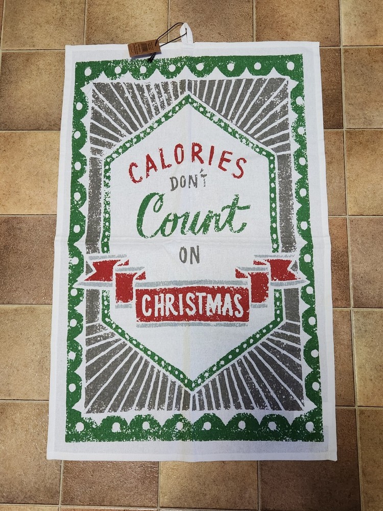 Cotton tea towel new with tags with printed "Calories Don't Count on Christmas" detail 28"L x 18"W...