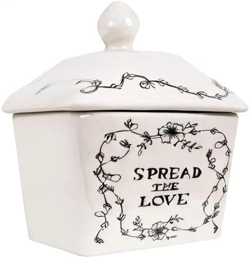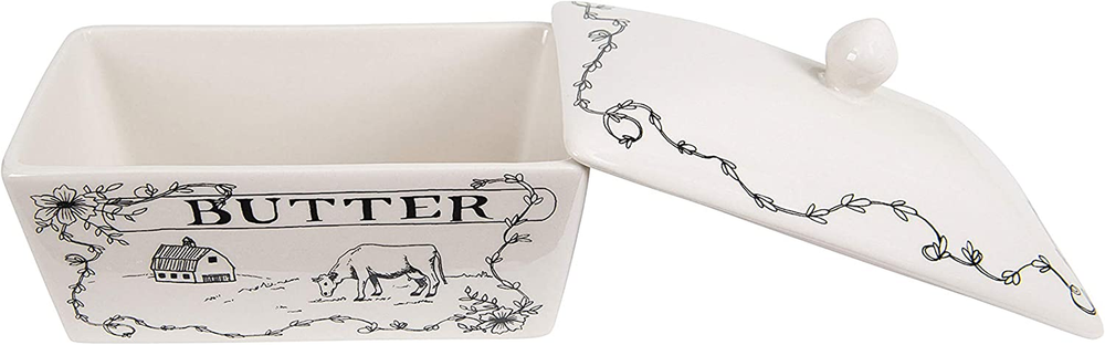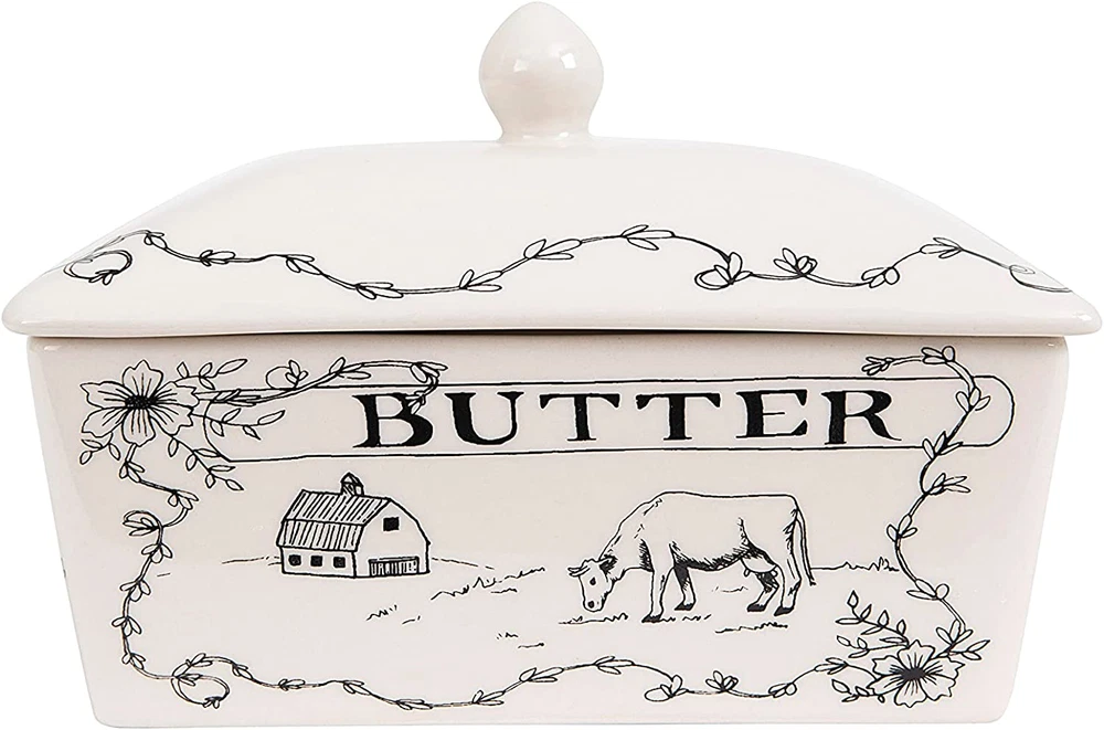 This farmhouse-inspired butter dish features a vintage silhouette finished with intricate line drawings of a farm landscape, florals, and "spread the love" message Add a touch of antique charm to a kitchen counter, breakfast nook, or family dinner with this rustic butter dish Food, microwave, and dishwasher safe Made from 100% stoneware 6.75 inches L x 4 inches W x 4.5 inches H Intentionally curate a fashionable, yet functional kitchen or dining area with Creative Co-Op's thoughtfully crafted collection of kitchen and food storage, designed to transform clutter while adding style and convenience to the space. Peruse a vast selection of unique, display-worthy pieces created to stylishly streamline a well-loved cooking or baking station, including lidded containers with rubber seals, cookie jars, butter dishes, utensil holders, and so much more. Choose from a wide array of materials from hammered aluminum and terracotta to stoneware and ceramic, and styles from mid-century modern and coastal to classic farmhouse and cottage. Elegantly stow kitchen tools, frequently used ingredients, or odds and ends with kitchen and food storage that is sure to impress.