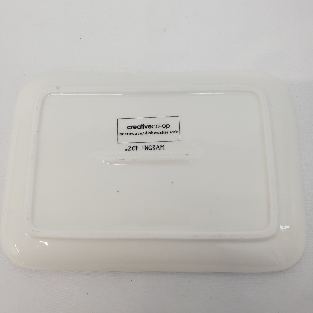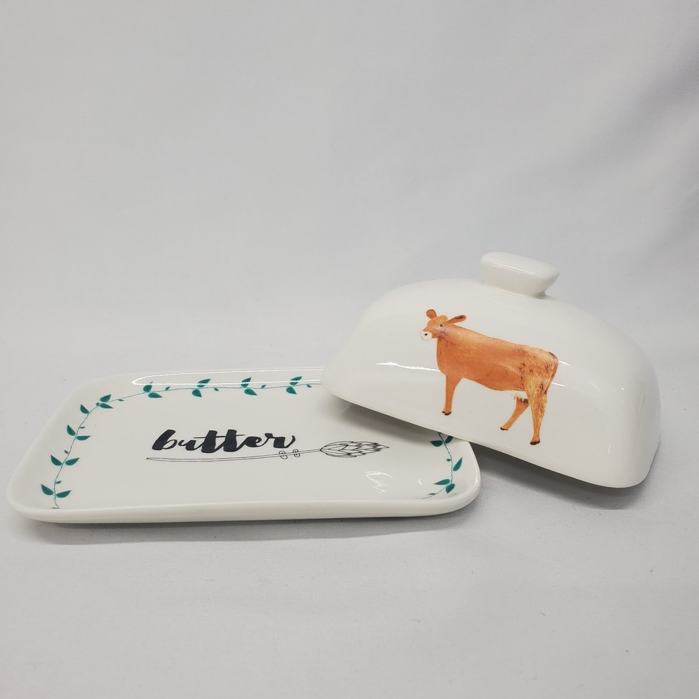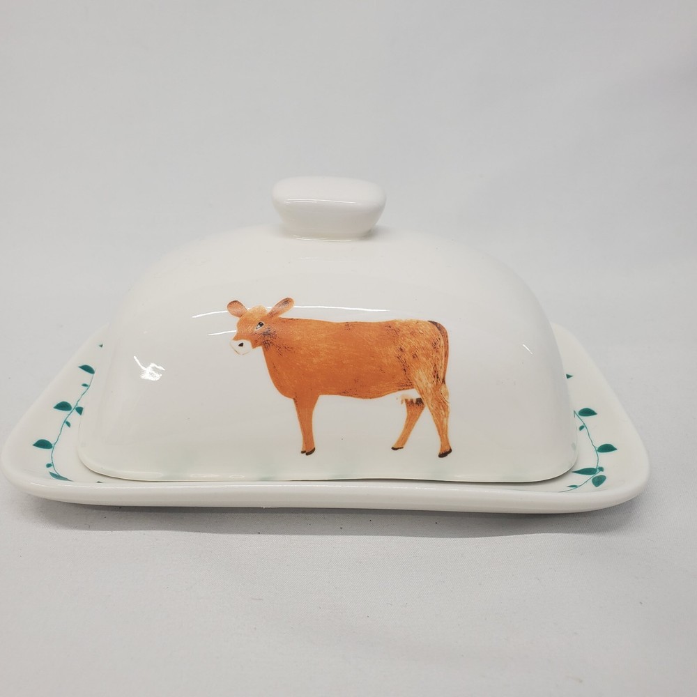 Creative Co-Op Covered Butter Dish Cow Green Leaves Cottage 7.25" Zoe Ingram. Measurements in photos. Condition is Pre-owned. Shipped with USPS Mail
