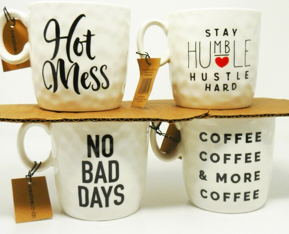 Creative Co-Op DA9443A 4" H Stoneware Mug With Sayings 4 Styles. These are brand new mugs. Dimensions: 4L x 4W x 4H in. Microwave- and oven-safe. Durable stoneware construction. Whimsical quotes printed in black. Dishwasher-safe. Order Processing We only process orders that are paid in full. We process and ship orders Monday - Friday 8AM - 4PM Central Standard Time. Orders place after hours, weekends or holidays will be processed the next business day. Changes To Orders Before you place your order, please check that your shipping address information is correct in your ebay account. We process our orders quickly and most of the time cannot change the address information quickly enough before the item is shipped. We will not be responsible to pay the shipping costs when re-shipping an order because of an incorrect address supplied to us. Returns Please inspect your packages upon arrival. Although we double check all orders before shipment, transit problems occasionally occur. We ask that all goods be in their original package - in resaleable/Brand New condition. Feedback We are customer focused and do want every transaction to be positive for the customer. Once in a while mistakes happen and this is an opportunity for us to make it right. If this does occur, please allow us the opportunity to show that we are customer focused and remedy any problems before you leave feedback. Contact Us We are available Monday through Friday, 8:00 a.m. to 4:30 p.m. CST. TXODDJOBS 3950 Hwy 157 S Euless, TX 76040 Email - Please Use The eBay Message System to contact us! Check out my store at: http://stores.ebay.com/Texas-Best !