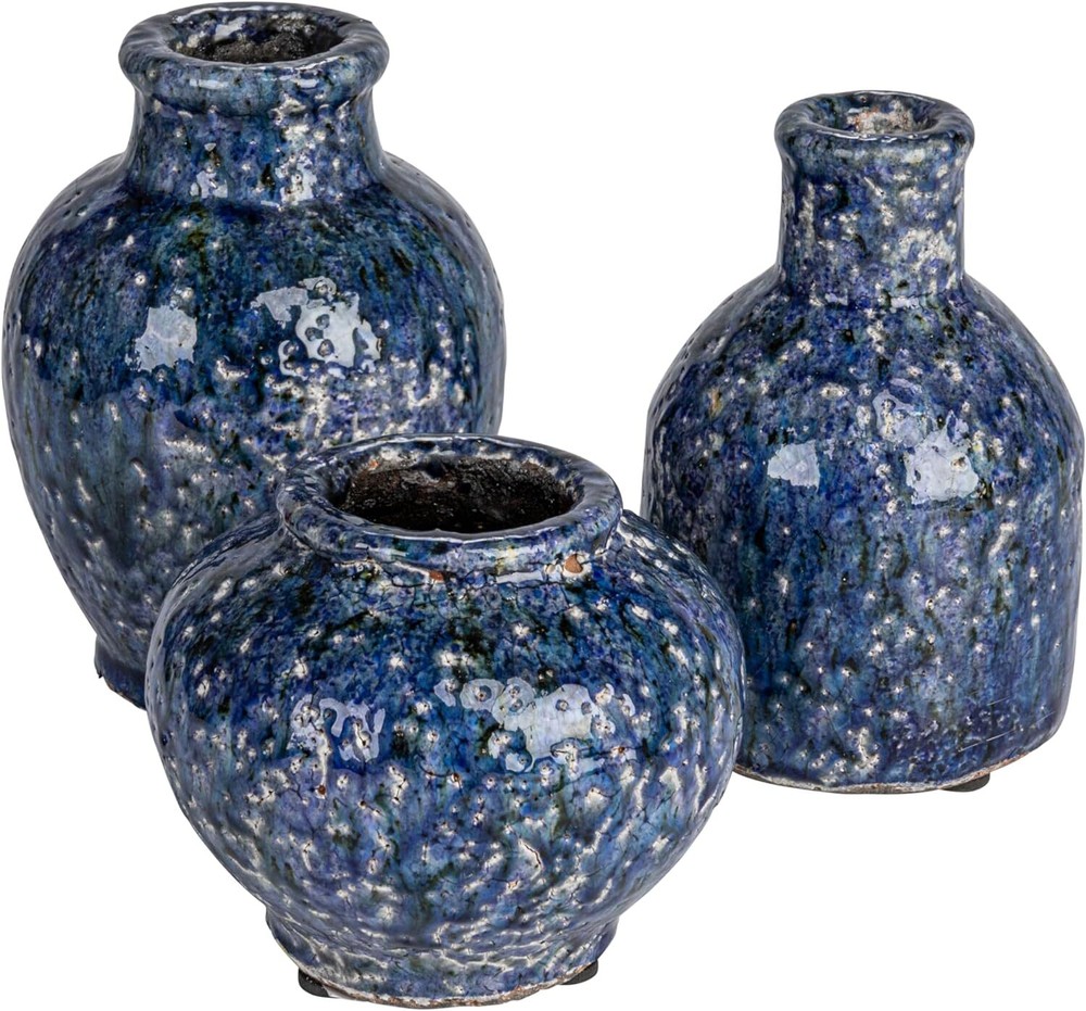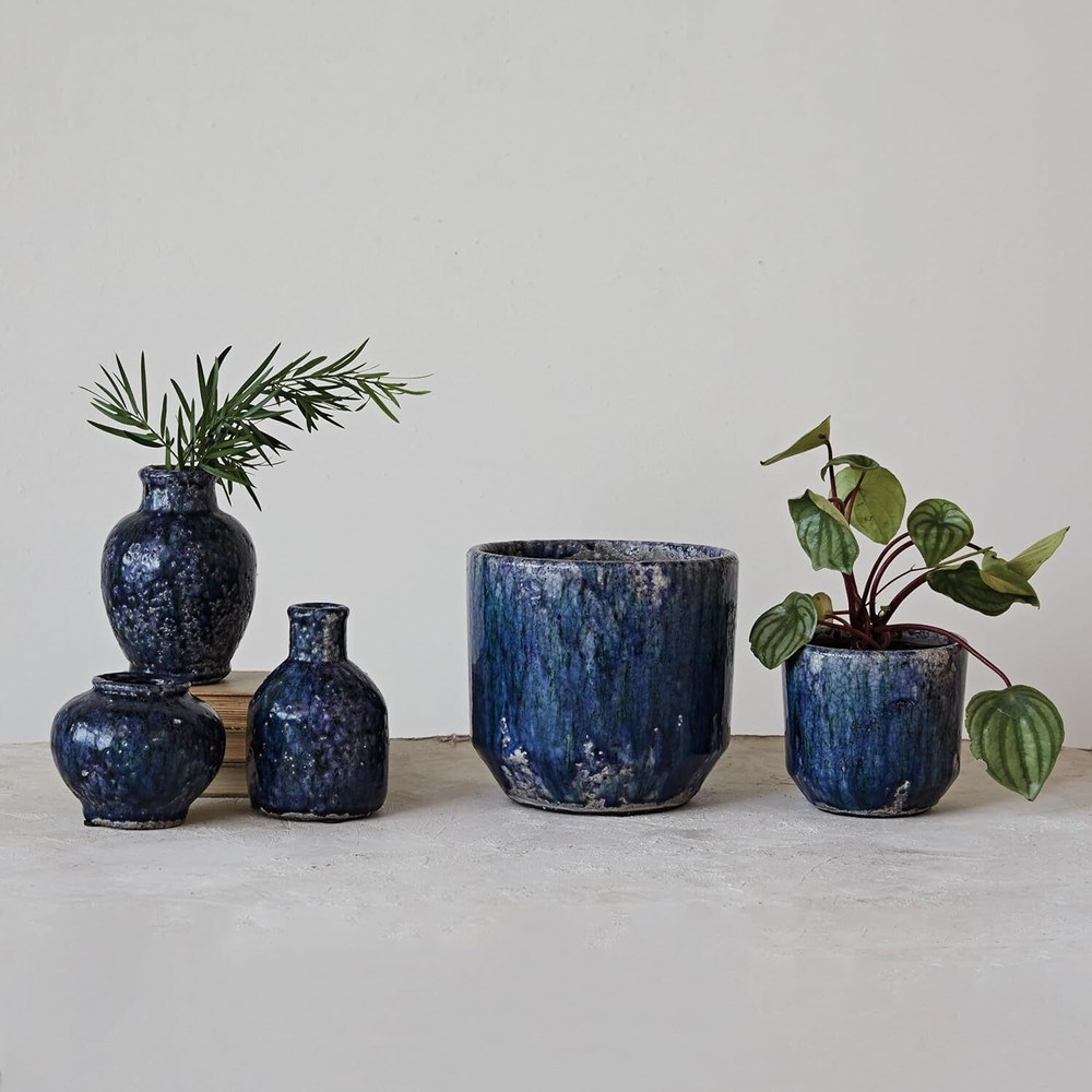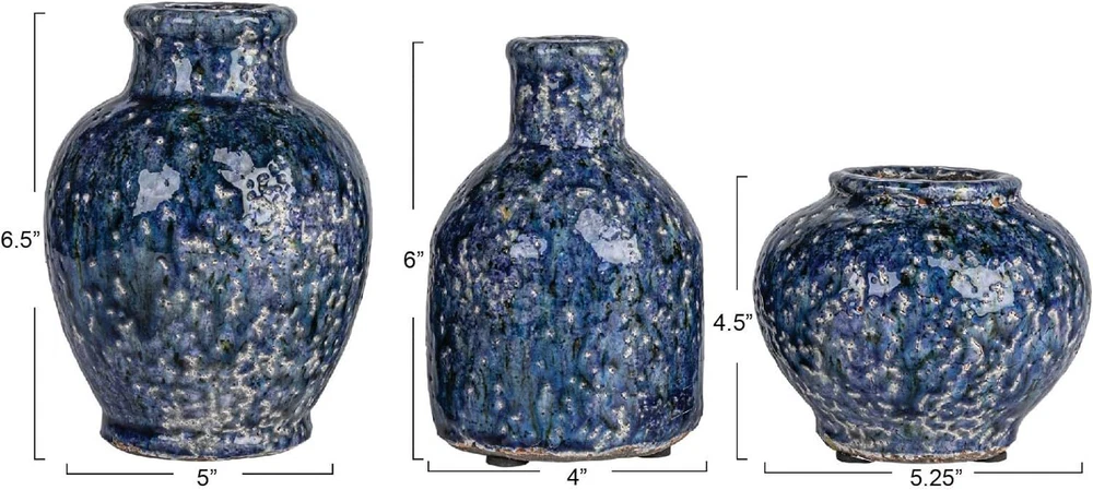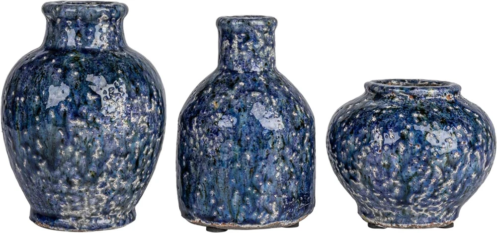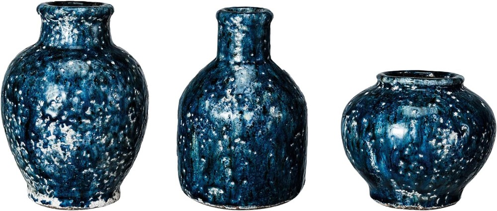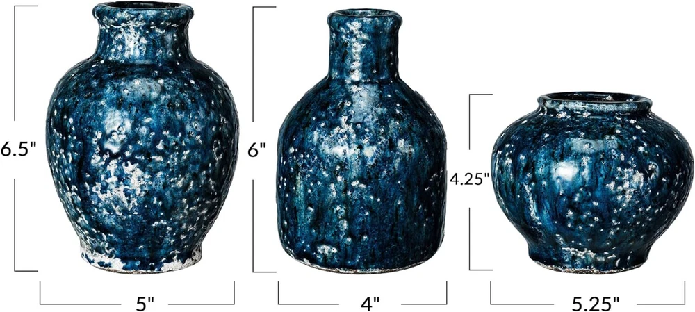 Creative Co-Op Decorative Terra-Cotta Vases with Crackle Glaze, Navy, Blue Product Details Material: Terra Cotta Color: Blue Brand: Creative Co-Op Product Dimensions: 4.75"L x 4.75"W x 6.25"H Shape: Round Style: Coastal Special Feature: Durable Pattern: Solid Theme: Botanical Recommended Uses For Product: Decorative Room Type: Living Room Number of Pieces: 3 Occasion: Women, Mother's Day, Wedding, Graduation Item Weight: 2.42 Pounds Installation Type: Freestanding Manufacturer: Creative Co-Op Item Weight: 2.42 pounds Item model number: DF8700 Batteries required: No A set of three beautiful and unique terra-cotta vases that have a crackle glaze and a navy color This set is suitable for coastal, beach, garden, French country, or farmhouse style, and can add some elegance and charm to any space These vases can be used to display fresh or artificial flowers, plants, or branches, or as decorative accents on their own Made of terra-cotta that is durable and easy to clean Measures 4 inches, 5 inches, and 5.25 inches in diameter, and 6 inches, 6.5 inches, and 4.5 inches in height This set of decorative terra-cotta vases with a crackle glaze and navy color is a unique and beautiful addition to any home. The vases have a round shape and narrow opening, with a cracked and glossy surface created by the crackle glaze. The navy color gives the vases a vibrant and elegant look. They can be used to display flowers, plants, or branches, or as decorative accents. Place them on tables, shelves, mantels, or windowsills, and create a cozy and inviting atmosphere in the home. These vases are suitable for coastal, beach, garden, French country, or farmhouse styles, adding elegance and charm to any space. Each vase will vary slightly in color and texture due to the crackle glaze process.