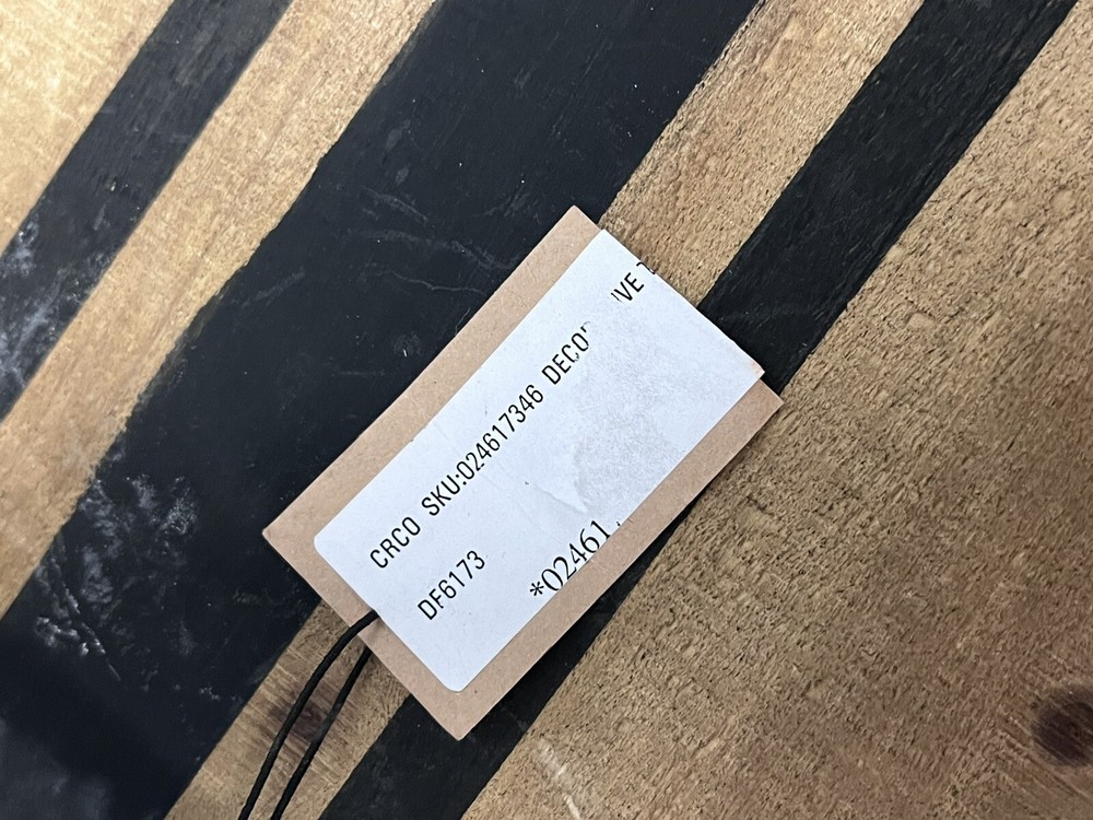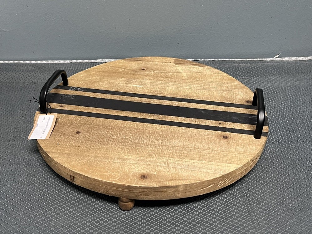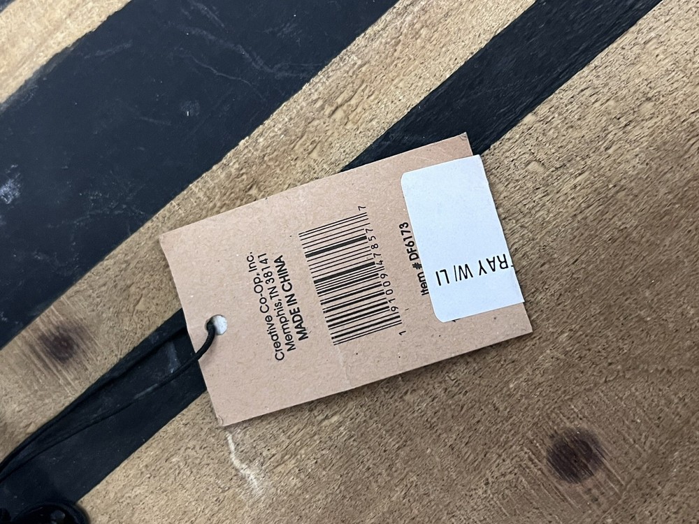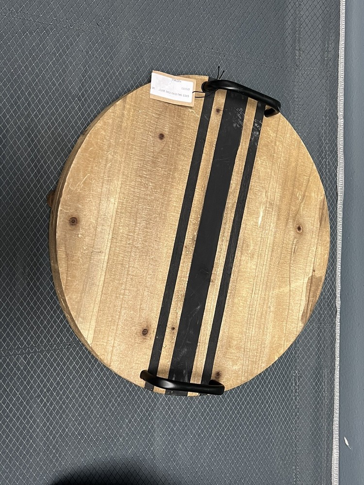 Enhance your home decor with this Creative Co-Op Decorative Wood Tray. The tray is made of natural wood with a striped pattern and metal handles for easy transportation. It is 16.3 inches in length and width, and 1.9 inches in height, making it perfect for serving drinks or displaying decorative items. The tray is a single piece set and is branded by Creative Co-Op, a well-known publisher and studio.