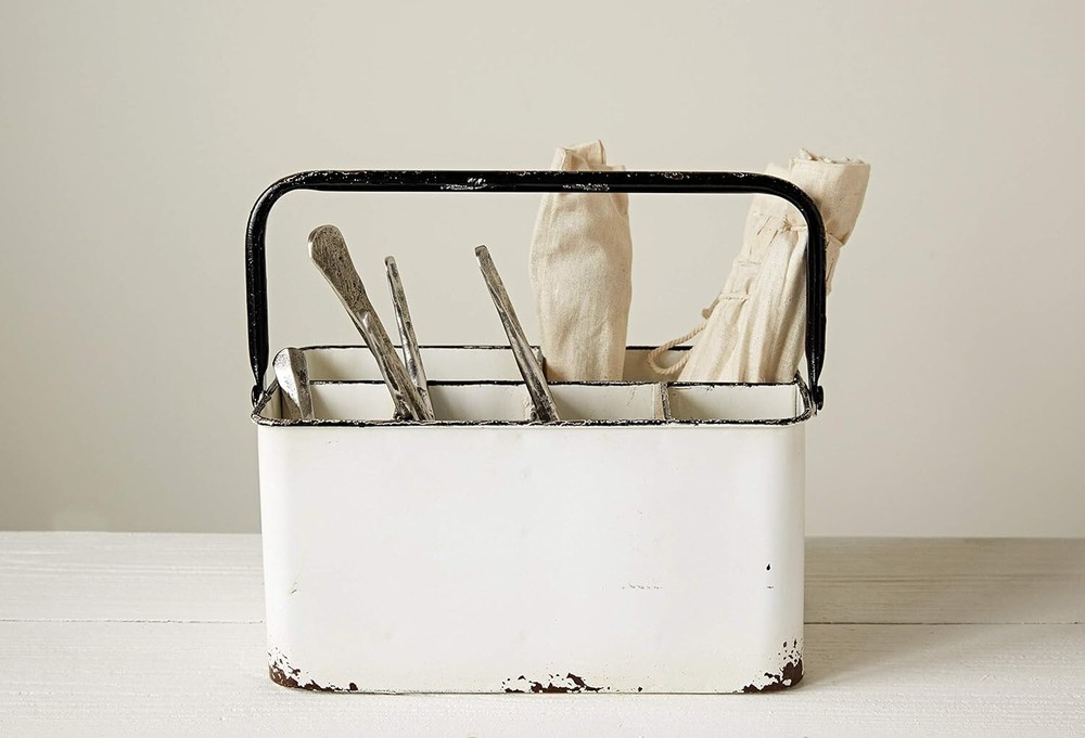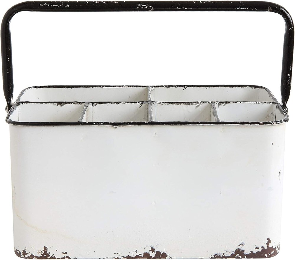 Creative Co-Op Distressed White Metal Caddy with 6 Compartments About this item: This vintage-inspired portable caddy features durable metal construction with six storage compartments and functional handle in a distressed enamel finish Organize silverware and napkins, office essentials and craft supplies, or showcase dried florals in the storage compartments Wipe clean with dry cloth Made from iron and enamel 11 inches L x 6.25 inches W x 9 inches H