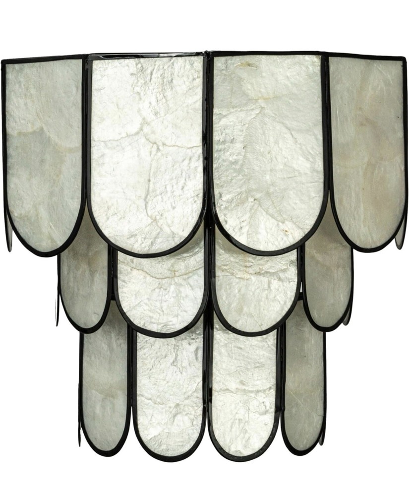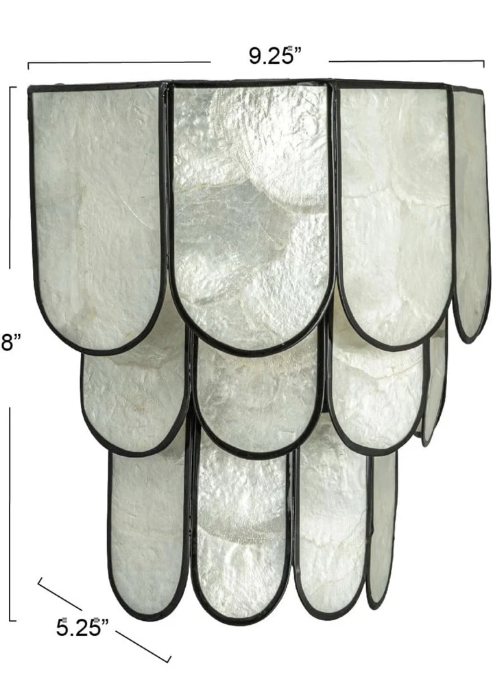 Creative Co-Op EC1684, Black Laminated Capiz Tiered Wall Sconce, 9.3" L x 5.3" W x 8.0" H A stunning and elegant wall sconce with a black metal frame and a tiered shade made of laminated capiz shells A perfect addition to any room that needs some natural and glamorous lighting with a touch of coastal, boho, or modern style Requires 1 60-watt bulb (not included) or lower and needs hardwiring Made of high-quality and eco-friendly metal and capiz shells Measures 9.25 inches in length, 5.25 inches in width, and 8 inches in height This black finish laminated capiz-tiered wall sconce is an elegant and versatile lighting piece that can enhance any space. It features a black metal frame and a tiered shade made of laminated capiz shells, creating an intricate pattern that reflects and diffuses light. The sconce is suitable for any room with natural and glamorous lighting, with a touch of coastal, boho, or modern style. It requires 1 60-watt bulb and hardwire installation. Made from eco-friendly metal and capiz shells, it reduces waste and environmental impact. The sconce measures 9.25 inches in length, 5.25 inches in width, and 8 inches in height. Product information Manufacturer Creative Co-Op Part Number EC1684 Item Weight 1.76 pounds Product Dimensions 9.25 x 5.25 x 8 inches Country of Origin Philippines Item model number EC1684 Size 9.3"L x 5.3"W x 8.0"H Color Black Style Coastal Material Metal, Capiz Power Source Corded Electric Voltage 120 Volts Wattage 60 watts Item Package Quantity 1 Mounting Type Wall Mount Switch Style Hardwired Usage Home Batteries Required? No