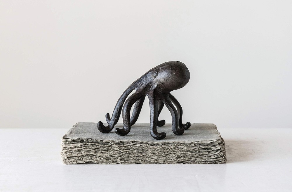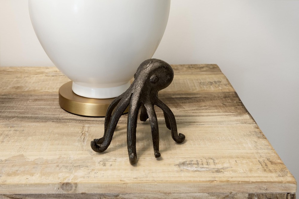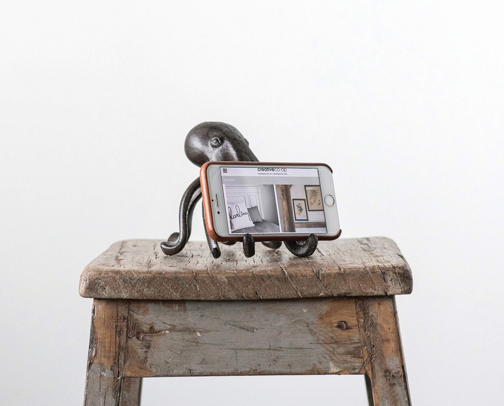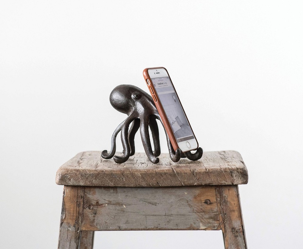 This playfully designed decorative accent showcases a cast iron silhouette of an octopus Place phone or tablet on the 2 front arms of the octopus to enjoy videos or follow recipes while cooking Please note that this accent is only compatible with select phone and tablet models Made from 100% cast iron Octopus accent measures 6 inches L x 5.25 inches W x 4.75 inches H; Opening for device is 0.5 inches W