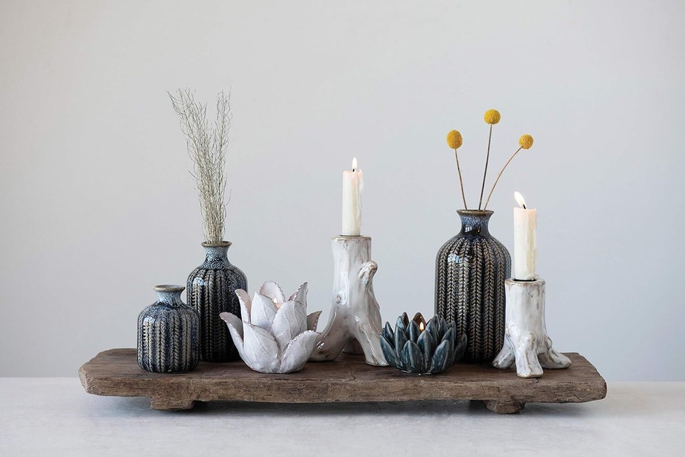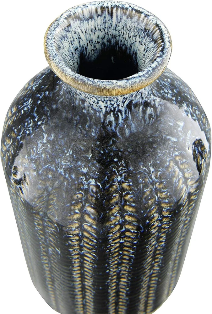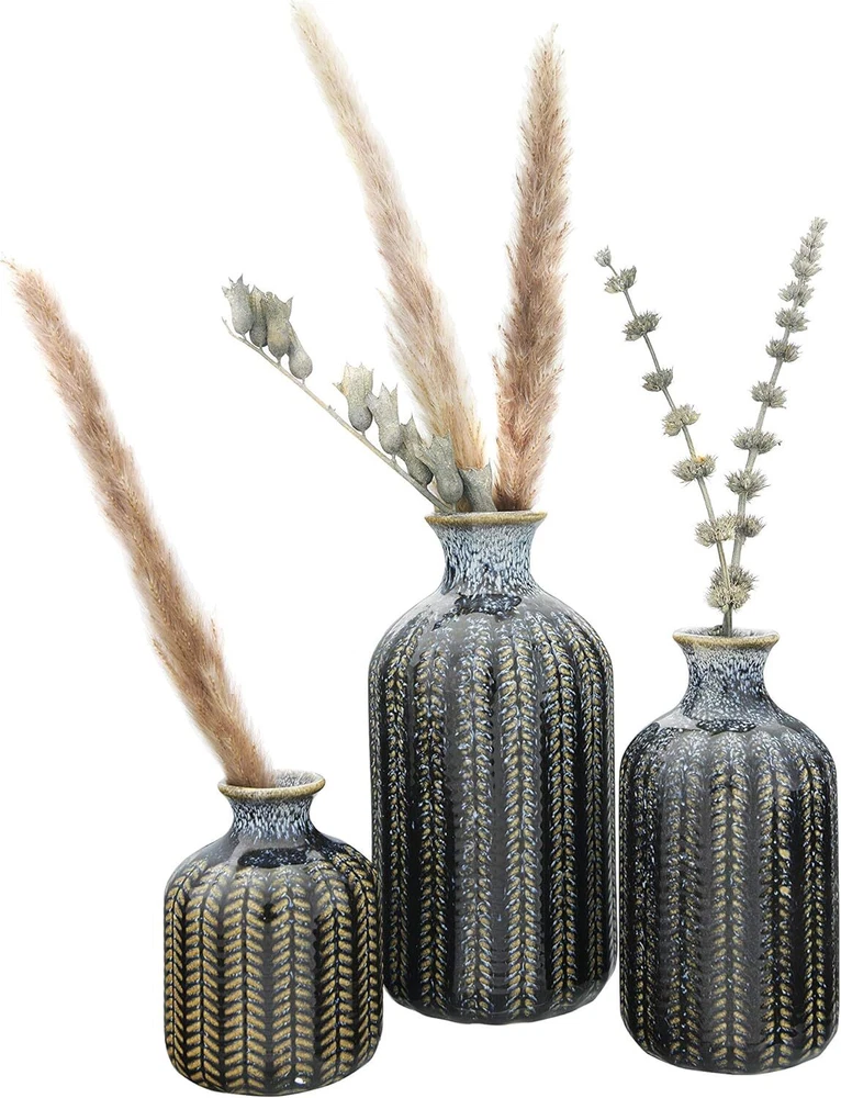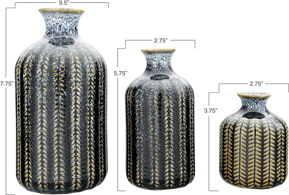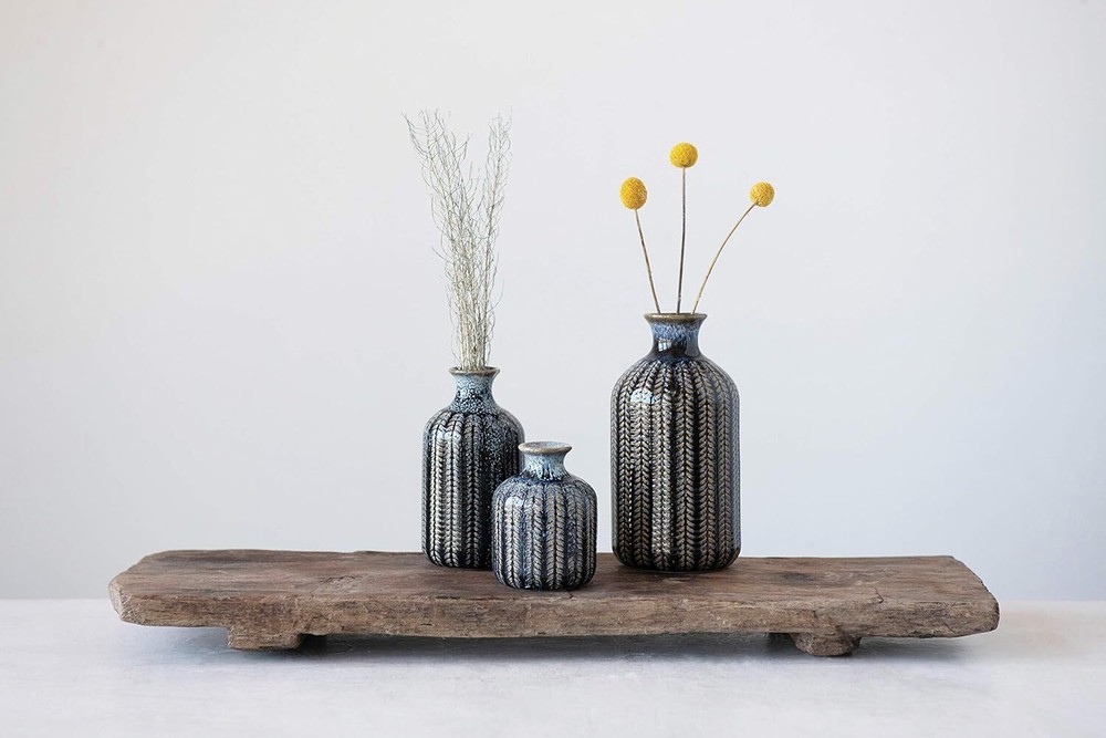 Creative Co-Op Embossed Stoneware Reactive Glaze Finish (Set of 3 Sizes) Blue Product Details Color: Blue Brand: Creative Co-Op Product Dimensions: 3.54"L x 3.54"W x 7.09"H Shape: Round Style: Elegant Special Feature: Embossed Theme: Flowers Recommended Uses For Product: Decorative Room Type: Bathroom, Living Room, Bedroom Finish Type: Blue Number of Pieces: 3 Occasion: Women, Mother's Day, Wedding, Graduation Item Weight: 2.38 Pounds Installation Type: Decorative Mounting Type: Table Manufacturer: Creative Co-Op Item Weight: 2.38 pounds Country of Origin: China Item model number: DF3002 Finish types: Blue Assembly required: No Batteries required: No These stunning vases will make great decorative accents without the addition of botanicals Narrow openings will gently hold your delicate flowers Small: 2. 75"L x 2. 75"W x 3. 75"H Medium: 2. 75"L x 2. 75"W x 5. 75"H Large: 3. 5"L x 3. 5"W x 7. 25"H This elegant trio of stoneware vases features an interesting striped pattern. Their varying heights create a splendid setting when they are lined up next to each other. To accent a shelving unit, place each on a different level with one on the right, one on the left and one in the middle.