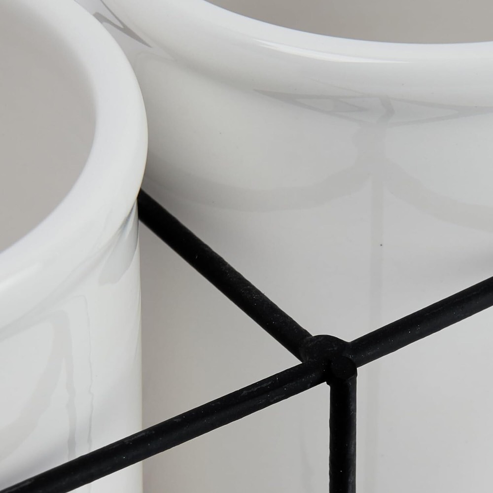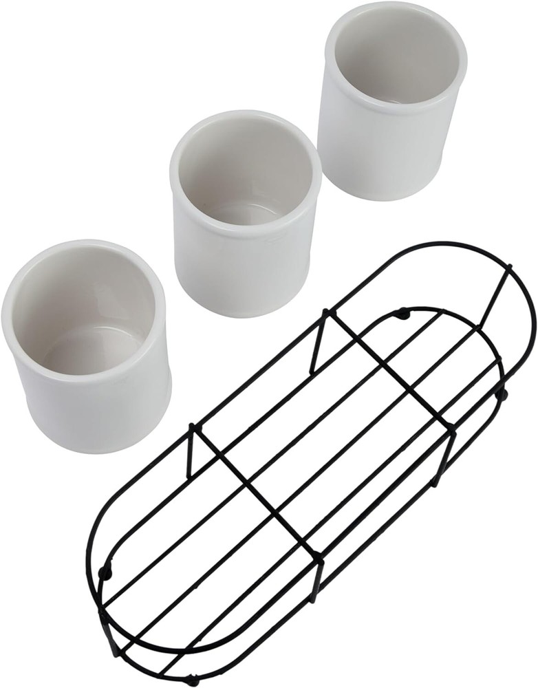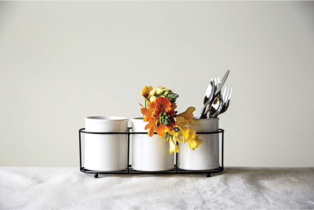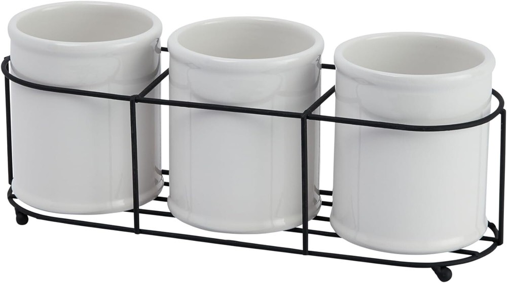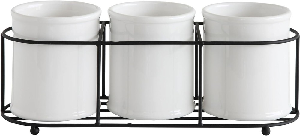 I don't ship out US + Puerto Rico + Hawaii + PO. Box Color White Material Ceramic Item Dimensions LxWxH 3.74 x 3.74 x 4.33 inches Item Weight 2.75 Pounds Brand Creative Co-Op About this item This cottage-inspired set of stoneware 3 crocks features simple silhouettes on a sleek metal stand Utilize this piece in the kitchen to separate silverware, in the bathroom for easy access to q-tips and toothbrushes, or as a decorative accent to display dried florals Wipe clean with dry cloth Made from dolomite and iron Set measures 11.5 inches L x 3.75 inches W x 4.25 inches H; Each crock measures 3.25 inches diameter x 4.25 inches H