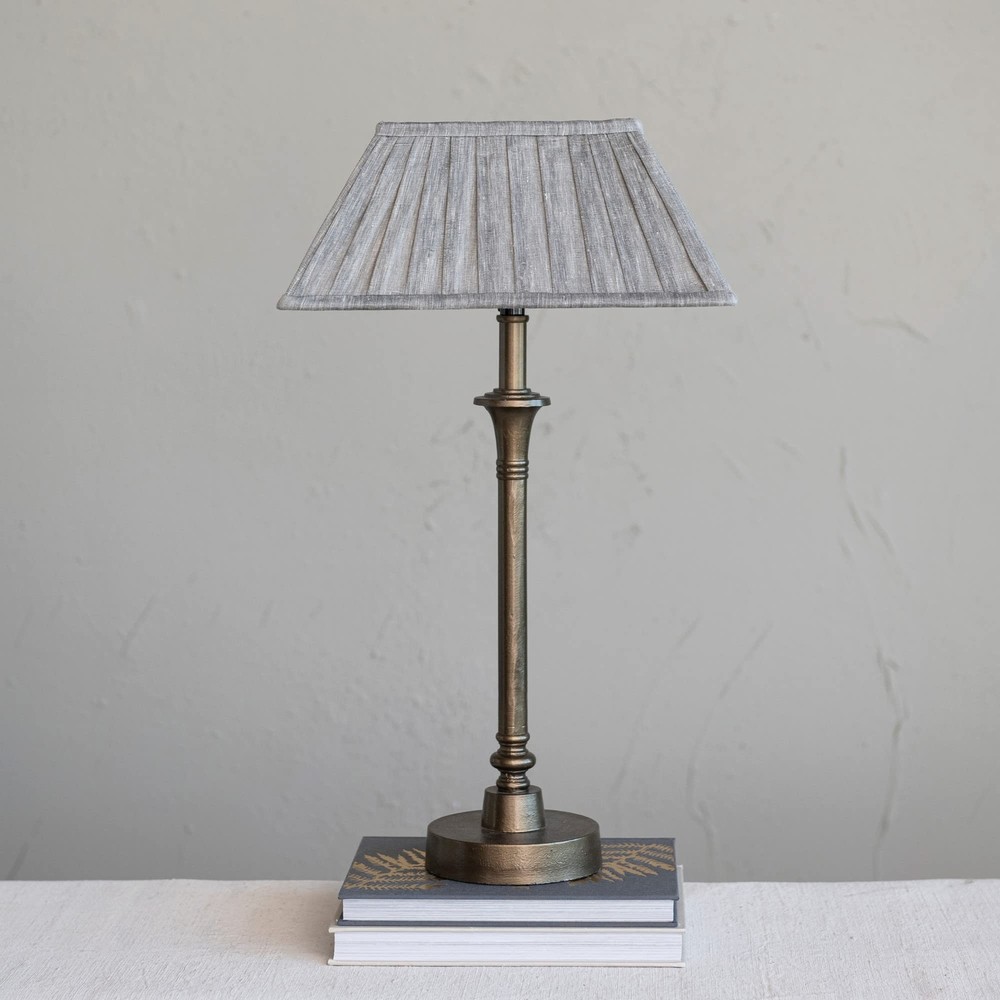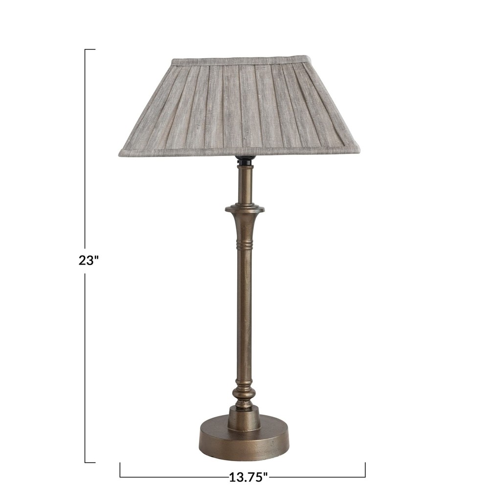 Creative Co-Op Farmhouse Metal Pleated Linen Shade, Brass and Grey Table Lamp, Gray Mood lighting meets modern art in our thoughtfully curated collection of floor and table lamps. Explore a wide array of textures, hues, sizes, and silhouettes to find the perfect fit for any space, including vintage reproductions, lanterns, A-frames, abstract asymmetrical bases, figurine lamps, and so much more. Choose from a vast selection of materials from solid marble and reclaimed wood to terracotta and glass, and styles from mid-century modern and classic farmhouse to vintage glam and boho. The thoughtful placement of a floor or table lamp from this hand-picked collection will create a warm and welcoming ambiance that is guaranteed to impress. Product Features This French country-inspired table lamp features a timeless metal base topped with a pleated rectangle shade Display in a living space of any style from cottage to farmhouse Maximum 40W bulb not included Made from aluminum and linen 13.75 inches L x 8 inches W x 23 inches H Open Box Condition Notice: Items are in perfect working condition. Items may have some minor signs of use, and the original protective wrapping may be absent or the item may be repackaged. All accessories will be included. Return Policy: You may return any item purchased within 30 days of receiving the shipment.