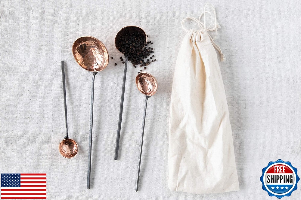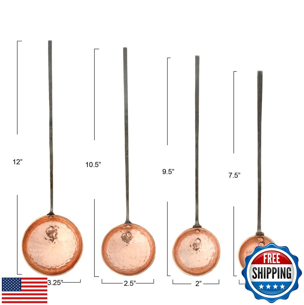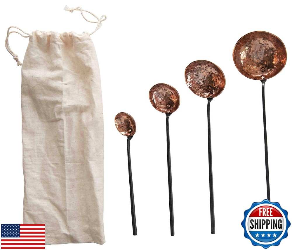 Creative Co-Op Farmhouse Textured Copper Ladles with Metal Handles, Set of 4 Sizes in Drawstring Bag Features This industrial-inspired set of metal ladles features hammered copper scoops and contrasting, riveted handles in four descending sizes Add a touch of style to a dinner party, or give the perfect housewarming gift with this farmhouse-inspired set of ladles in a drawstring bag Food safe; Hand wash only Made from metal and copper Ladles measure 7.5 inches L x 1.5 inches W, 9 inches L x 2 inches W, 10.5 inches L x 2.5 inches W, 12 inches L x 3.25 inches W X-Large: 12"L x 3.25"W & 1" deep / Handle 9" long Shipping Free & Fast Shipping: We offer free shipping to most of the USA with a normal delivery time of 3-7 days. However, due to the current situation, additional delivery time (up to 3 weeks) may be required for some items. Alternative Carriers: We may use alternative carriers (e.g., USPS, FedEx, UPS) to ensure your package arrives safely and on time. Due to the use of multiple carriers, we are unable to provide a tracking number automatically. Handling Time: Orders are processed and shipped within 1-2 business days of receiving cleared payment. Shipping Restrictions: Shipping to Alaska, Hawaii, Puerto Rico, Guam, and other US territories may incur shipping charges or delivery restrictions. Please contact us before ordering, or your order can be refunded/cancelled. State Restrictions: Certain items may not be shipped to California due to state regulations. Contact for Tracking Updates: If you require tracking updates or have any concerns about the delivery of your order, please feel free to contact us, and we will be happy to assist you. Return Policy 30-Day Hassle-Free Returns: If you are not completely satisfied with your purchase, you can return the item for free within 30 days of receiving it for a full refund or exchange. Easy Return Process: Contact us, and we will provide you with a prepaid return shipping label and detailed instructions. No Restocking Fee: There are no restocking fees for returns. However, the buyer is responsible for return shipping costs if the return is not due to a seller's error. Refund Processing: Refunds will be processed within 1 business day of receiving the returned item in its original condition. Payment We accept all major credit cards, PayPal, and Apple Pay for your convenience. Your payment information is secure and encrypted to ensure a safe and seamless transaction. Please complete your payment within 3 days of purchase to avoid any delays in shipping. Feedback Your feedback is extremely important to us. We strive to provide the best products and customer service possible. If you are satisfied with your purchase, please take a moment to leave us a positive review. If you have any concerns or issues with your order, please contact us before leaving negative feedback. We are committed to resolving any problems and ensuring your satisfaction. Contact Us If you have any questions or concerns, please feel free to reach out to our customer support team. You can contact us through the eBay messaging system. We are available Monday to Friday, 9:00 am to 5:00 pm EST, and we will do our best to respond to your inquiry within 24 hours. Thank you for supporting our small family business!