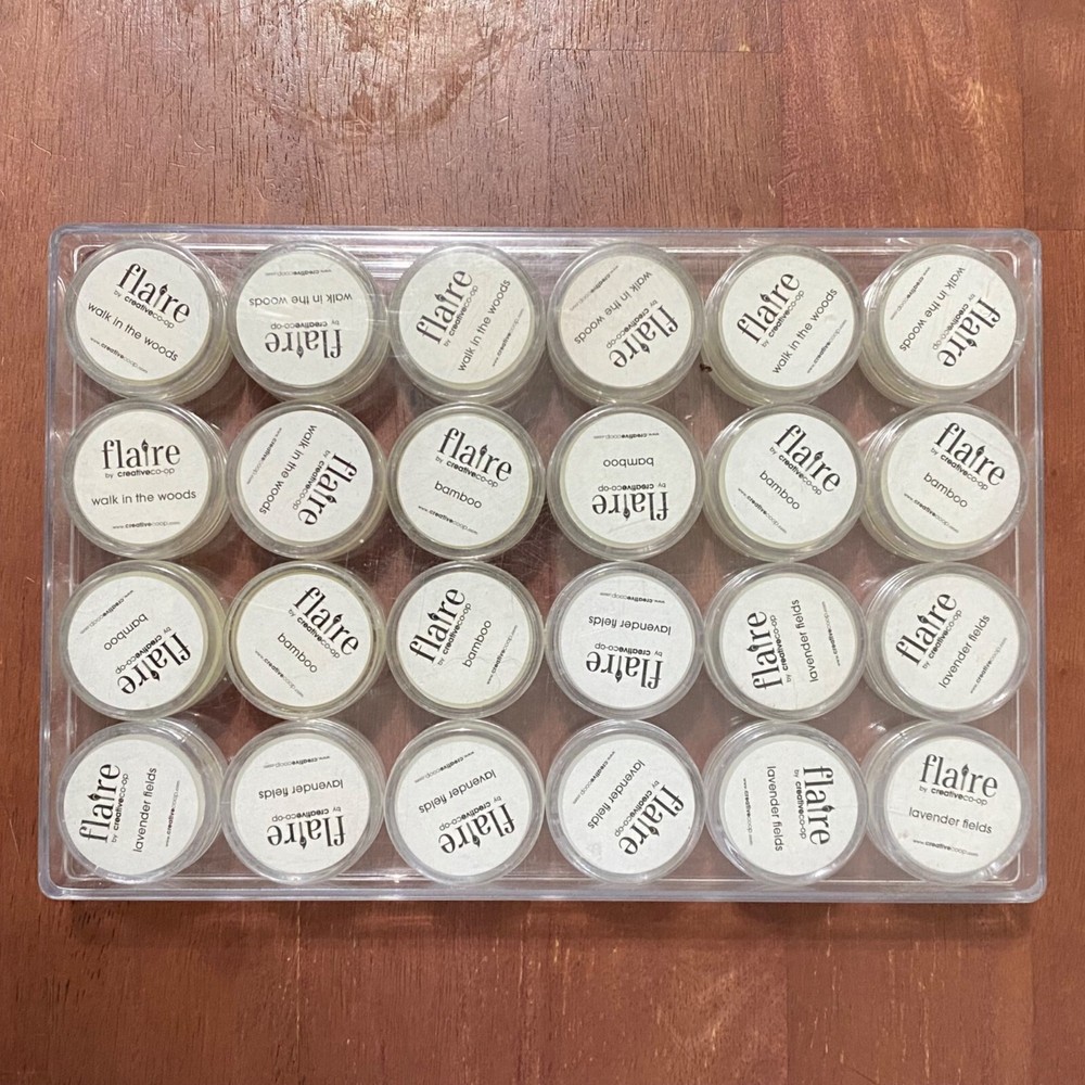 Creative Co-Op Flaire Variety Scent Sample Wickless Candle Lot of 24 Scents: Lavender Fields - 9 Bamboo - 7 Walk in the Woods - 8 1.25 inch diameter .75 inch height Remove the lid and place anywhere you would put a candle Can be used in a warmer Unused Case is cracked