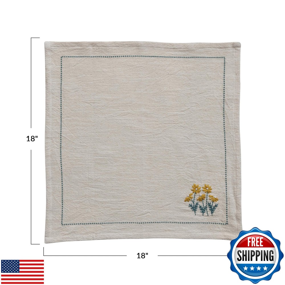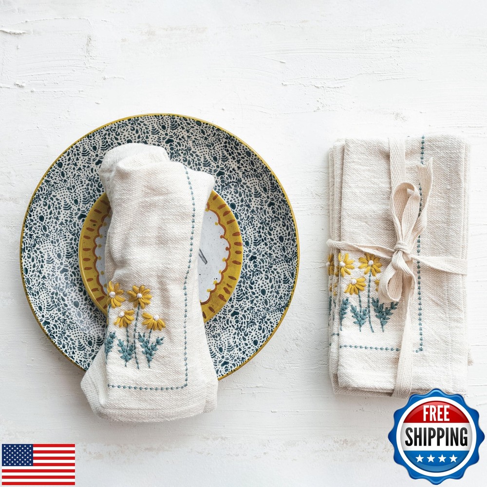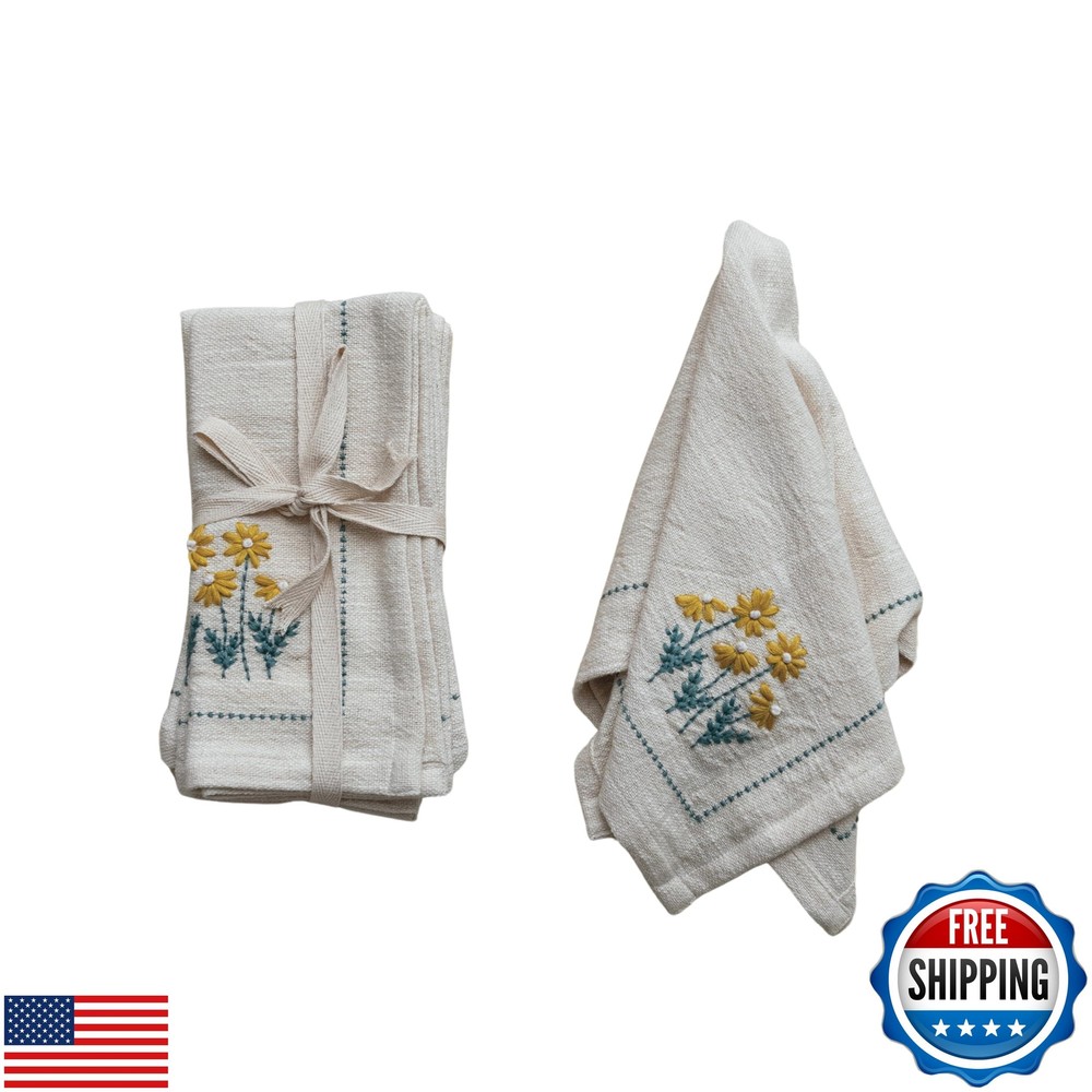 Creative Co-Op Floral Hand-Embroidered Cotton Napkins, Multicolor, Set of 4 Features A vibrant collection of cotton napkins, each adorned with exquisite hand-embroidered flowers, bringing a touch of artisanal craftsmanship to the table An elegant complement to farmhouse, lodge, or French country decor, these napkins add a flourish of natural beauty A charming addition to any dining occasion, these napkins are perfect for enhancing the presentation of the meals Made of soft, durable cotton, these napkins are as functional as they are decorative 18” L x 18” W Shipping Free & Fast Shipping: We offer free shipping to most of the USA with a normal delivery time of 3-7 days. However, due to the current situation, additional delivery time (up to 3 weeks) may be required for some items. Alternative Carriers: We may use alternative carriers (e.g., USPS, FedEx, UPS) to ensure your package arrives safely and on time. Due to the use of multiple carriers, we are unable to provide a tracking number automatically. Handling Time: Orders are processed and shipped within 1-2 business days of receiving cleared payment. Shipping Restrictions: Shipping to Alaska, Hawaii, Puerto Rico, Guam, and other US territories may incur shipping charges or delivery restrictions. Please contact us before ordering, or your order can be refunded/cancelled. State Restrictions: Certain items may not be shipped to California due to state regulations. Contact for Tracking Updates: If you require tracking updates or have any concerns about the delivery of your order, please feel free to contact us, and we will be happy to assist you. Return Policy 30-Day Hassle-Free Returns: If you are not completely satisfied with your purchase, you can return the item for free within 30 days of receiving it for a full refund or exchange. Easy Return Process: Contact us, and we will provide you with a prepaid return shipping label and detailed instructions. No Restocking Fee: There are no restocking fees for returns. However, the buyer is responsible for return shipping costs if the return is not due to a seller's error. Refund Processing: Refunds will be processed within 1 business day of receiving the returned item in its original condition. Payment We accept all major credit cards, PayPal, and Apple Pay for your convenience. Your payment information is secure and encrypted to ensure a safe and seamless transaction. Please complete your payment within 3 days of purchase to avoid any delays in shipping. Feedback Your feedback is extremely important to us. We strive to provide the best products and customer service possible. If you are satisfied with your purchase, please take a moment to leave us a positive review. If you have any concerns or issues with your order, please contact us before leaving negative feedback. We are committed to resolving any problems and ensuring your satisfaction. Contact Us If you have any questions or concerns, please feel free to reach out to our customer support team. You can contact us through the eBay messaging system. We are available Monday to Friday, 9:00 am to 5:00 pm EST, and we will do our best to respond to your inquiry within 24 hours. Thank you for supporting our small family business!