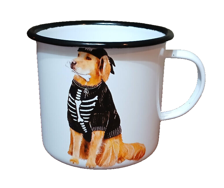 This Creative Co-Op enamelware mug features a beloved character, a Golden Retriever, in a pirate Halloween design. The 12oz mug is perfect for enjoying hot or cold beverages and is made of durable enamel material. It is an original piece, not a licensed reproduction, and was manufactured in China. The mug is part of the Mugs category and is a great addition to any collection of dinnerware and serveware. The set includes the mug itself and would make a great gift for any occasion, especially Halloween. The mug is snow white in color and has a unique pattern that adds to its charm. Vintage collectors will also appreciate this piece, as it is not only a great addition to any home but also a wonderful addition to any collection.