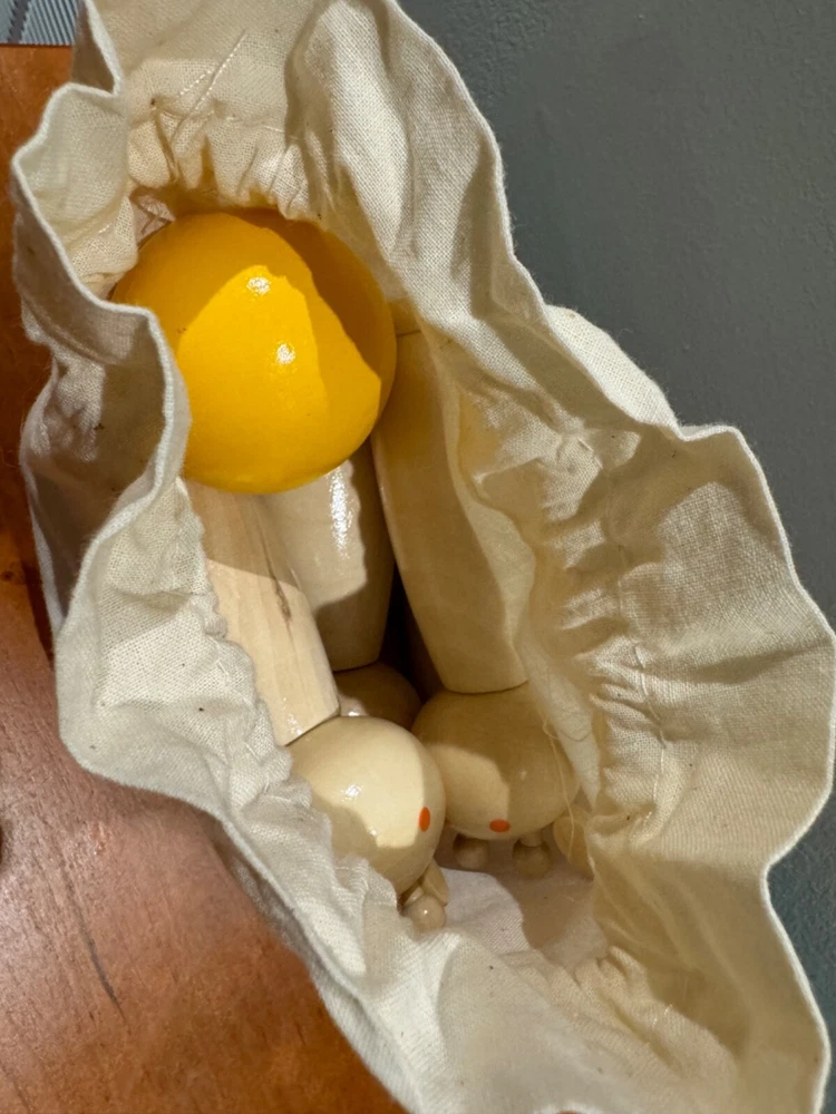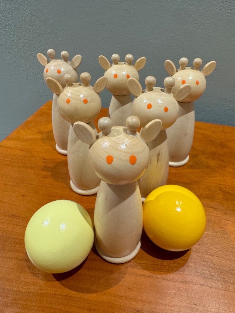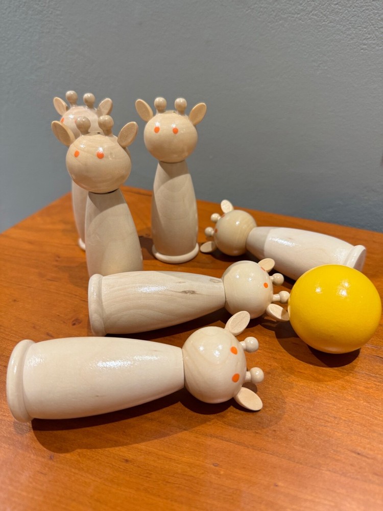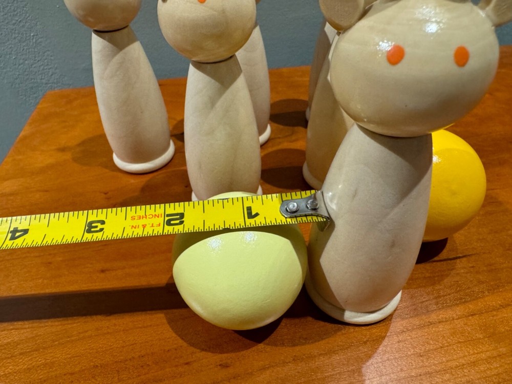 A game of bowling with adorable wooden pins that look like giraffes and cheery yellow wooden bowling balls. Six pins and two balls. Child-safe lacquered wood finish. The balls are about 2 inches across, in two shades of yellow. The giraffe-shaped pins are about 4.75 inches tall. This game by Creative Co-Op is loads of fun while it develops children's hand-eye coordination in both setting up and knocking down the pins. The 8 pieces come in their own natural colored cotton drawstring storage bag. New, without tags. Non-smoking home.
