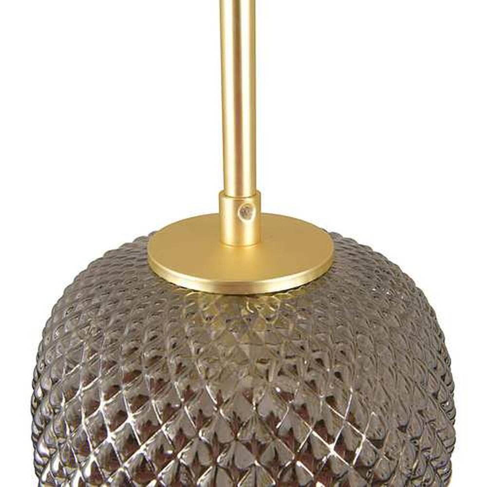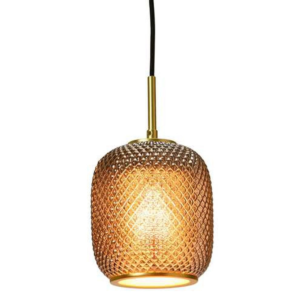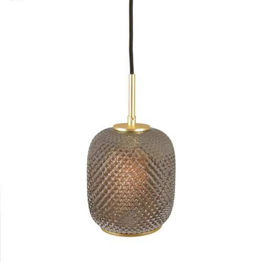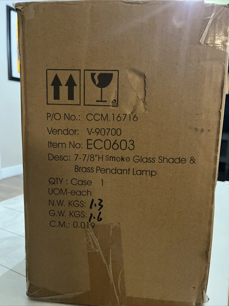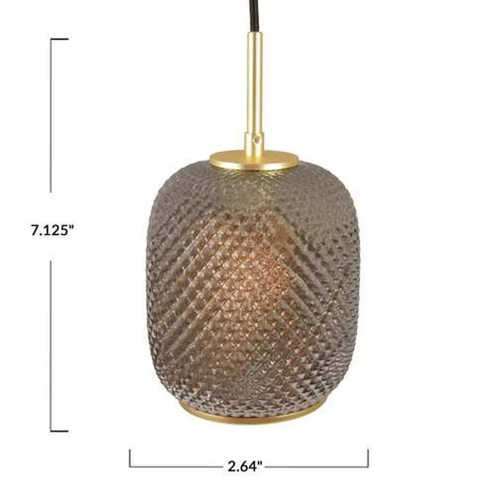 Open Box Creative Co-Op Embossed Glass Shade Lamp with Brass Accents and Smoked Finish Pendant PN: EC0603 Brand : Creative Co-Op Color : Smoke Material : Brass, Glass Style : Modern Light Fixture Type : Pendant Product Details: Crafted with durable glass and brass materials. Designed with a sleek black cord. Makes a striking statement in living rooms, dining areas, bedrooms, or kitchens. Features a distinctive shape with intricately embossed decorative glass. Dimensions: 7" x 7" x 8".