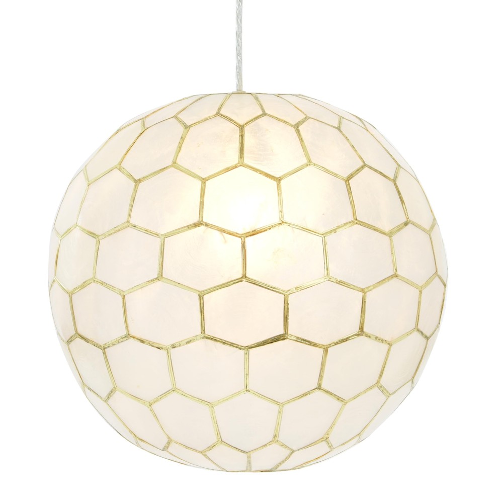 Creative Co-Op Gold Honeycomb Globe Pendant Light, Capiz White Seashells with Antique, 14" This Capiz Honeycomb Chandelier is handcrafted by skilled artisans in the Philippines. It has an antique gold metal frame with Capiz seashells featuring a beautiful honeycomb pattern detail. This lamp effortlessly elevates any space. Perfect for dining rooms, kitchen islands, or hallways. Each piece is one of a kind, as there are natural variations in the shell. Product Features Color: Gold Style: 14" Globe Brand: Creative Co-Op MPN: EC0491 UPC: 191009370246 EAN: 0191009370246 Chandelier features Capiz seashells placed in a beautiful honeycomb pattern detail, lined with antique gold painted metal Neutral pearl-colored shell creates a soft, warm glow This light effortlessly elevates any space. Perfect for dining rooms, kitchen islands, or hallways Wipe clean with a soft, dry cloth; do not use harsh cleansers or polish 14" Diameter Open Box Condition Notice: Items are in perfect working condition. Items may have some minor signs of use, and the original protective wrapping may be absent or the item may be repackaged. All accessories will be included. Return Policy: You may return any item purchased within 30 days of receiving the shipment.