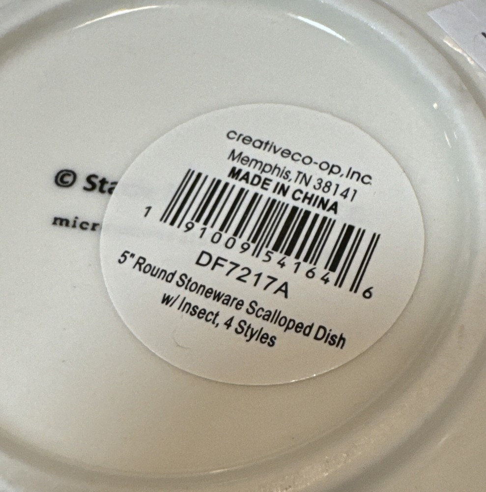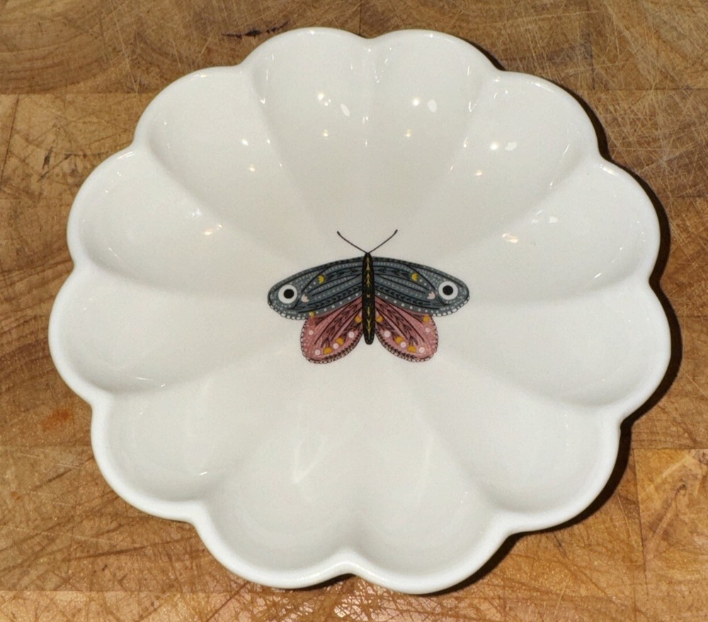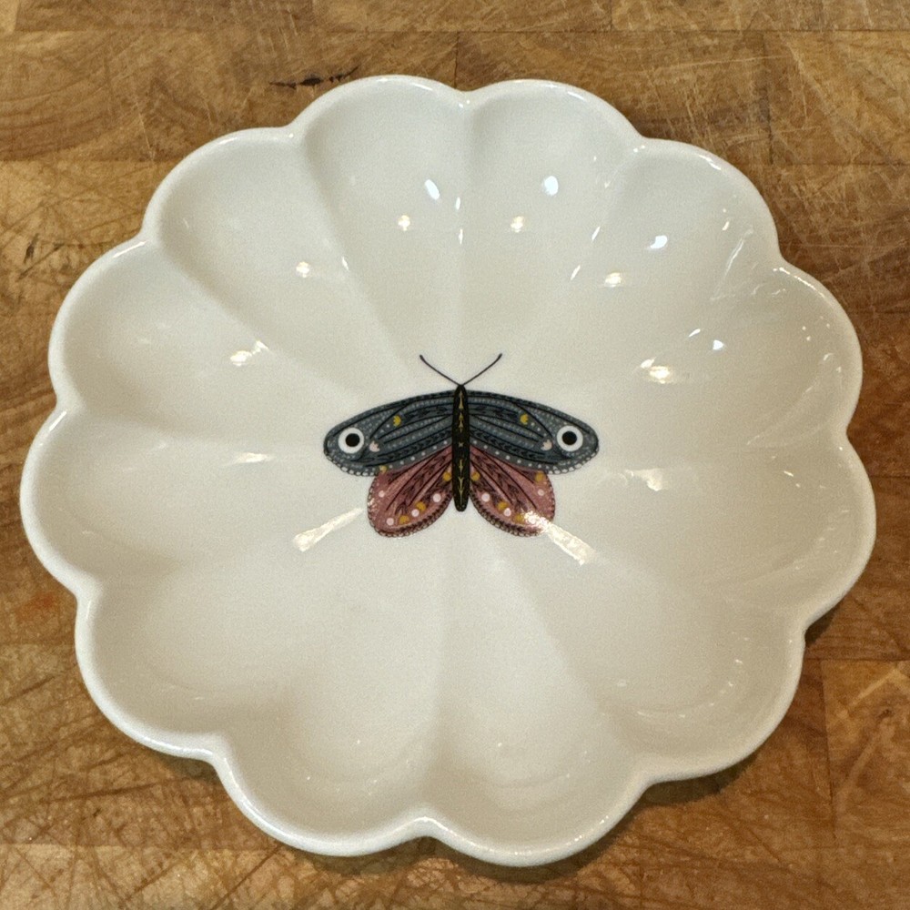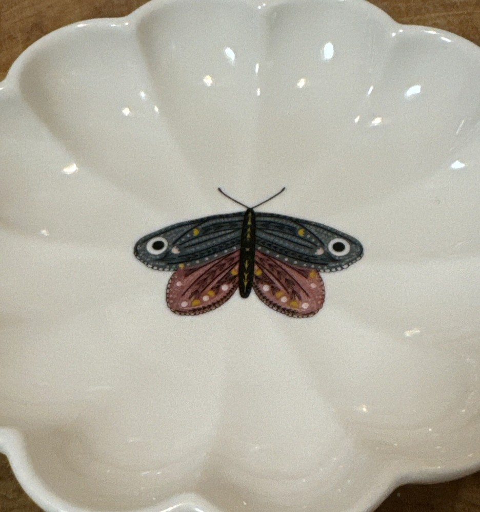 Creative co-op Scalloped dish in the shape of a winged insect Gray/Pink Moth From the Secret Garden stoneware fluted Insect Plate collection There are 4 different plates-each featuring a different insect and a different set of beautiful gossamer wings. Imported Material: Sandstone, stone Size: 5 inch Round Dishwasher & microwave safe