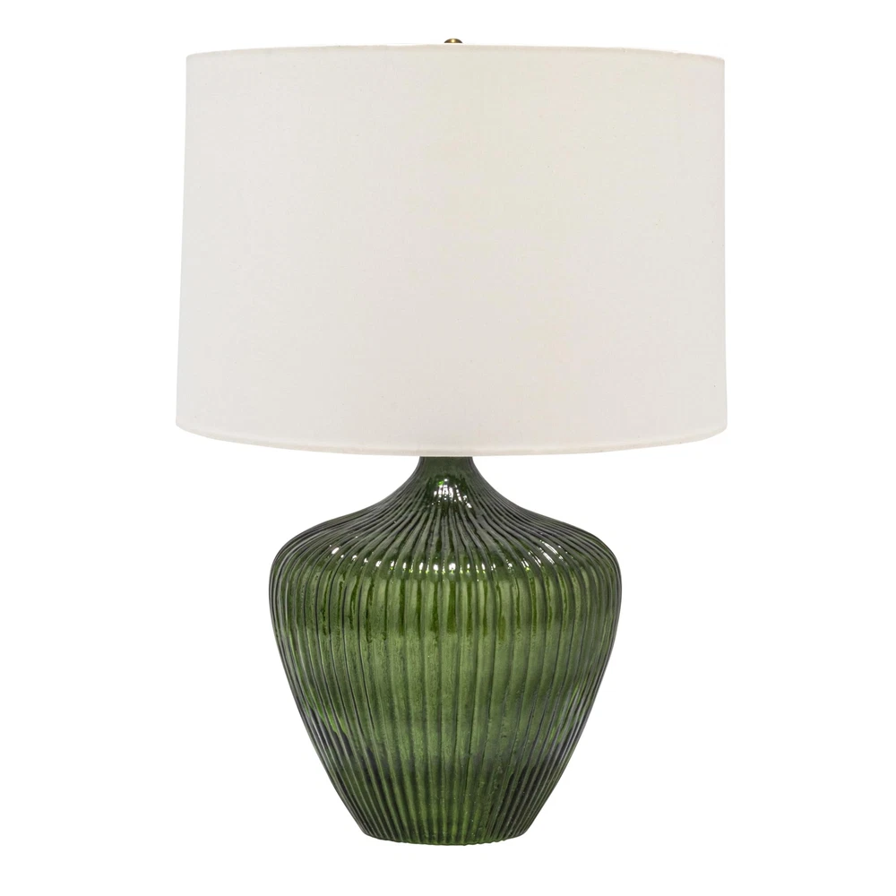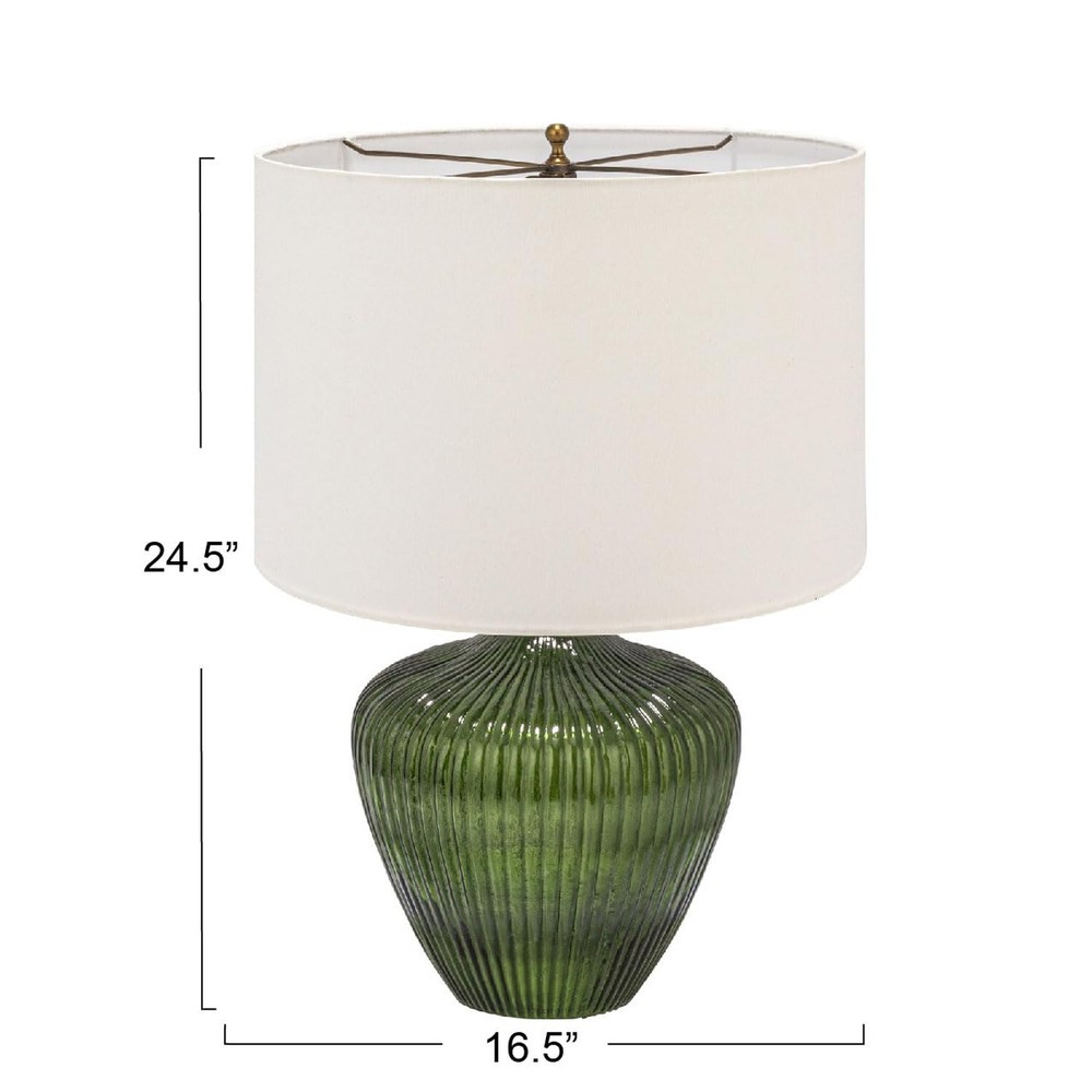 Creative Co-Op Green Glass Table Lamp with White Drum Shade Product Details Finish Type: Textured, Matte Base Material: Glass Bulb Base: E26 Product Dimensions: 16.5"D x 16.5"W x 24.5"H Item Weight: 6.99 Pounds Finish Type: Textured, Matte Base Material: Glass Bulb Base: E26 Product Dimensions: 16.5"D x 16.5"W x 24.5"H Item Weight: 6.99 Pounds Lamp Type: Table Lamp Shade Color: White Shade Material: Fabric Switch Type: Touch Style: Transitional Brand: Creative Co-Op Color: Green Special Feature: Portable Light Source Type: LED Material: Glass Room Type: Living Room Recommended Uses For Product: Decoration Power Source: Corded Electric Number of Light Sources: 1 Connectivity Technology: USB Included Components: Shade Is Waterproof: False Bulb Shape Size: A19 Mounting Type: Tabletop Wattage: 6E+1 Number of Items: 1 Lighting Method: LED Control Method: Touch Indoor/Outdoor Usage: Indoor Number of Pieces: 1 Efficiency: Energy Efficient Is Cordless?: No UPC: 191009617075 Manufacturer: Creative Co-Op Shade Height: 24.5 Inches Item Weight: 6.99 pounds Country of Origin: India Item model number: EC1578 Finish types: Textured, Matte Warranty Description: No warranty. Batteries required: No Green glass base with vertical ribbed detail Easily accessible on/off switch located on the cord. Uses 1 Standard E26 bulb, 60w maximum (bulb not included) White fabric drum shade 16.5"L x 16.5" W x 24.5" H This table lamp is perfect for bedside tables, living room end tables, or as an eye catching addition to your home office. Designed to complement any decor, this lamp is a true masterpiece that adds a touch of glamour and warmth to your home.