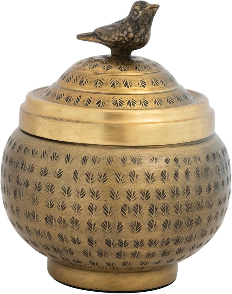 Creative Co-Op Hammered Aluminum Sphere Lid and Bird, Antique Brass Product Details Brand: Creative Co-Op Color: Brass Material: Aluminum Style: Bird Recommended Uses For Product: Decorative Product Dimensions: 6"L x 6"W x 7"H Capacity: 7 Cubic Inches Closure Type: Flip Top Opening Mechanism: Lift-Off Lid Number of Items: 1 Number of Compartments: 1 Unit Count: 1.0 Count Item Package Quantity: 1 Material Feature: Non-Toxic UPC: 191009564034 Item Weight: 1.04 pounds Manufacturer: Creative Co-Op Country of Origin: India Item model number: DF7471 Care instructions: Hand Wash Dishwasher compatible: No Number of pieces: 1 Batteries required: No Included Components: Container This classically designed lidded aluminum container showcases a spherical hammered silhouette adorned with a bird figurine Display in a living space of any style from traditional to farmhouse Add a touch of personal style to a mantelpiece or shelfscape with this decorative container Made from aluminum 6 inches L x 6 inches W x 7 inches H Curate an elegant, storied space with our thoughtfully crafted collection of decorative dishes and bowls, designed to transform clutter or be displayed as unique decorative accents. Peruse a vast selection of unique, eye-catching pieces created to stylishly streamline a space of any design scheme, including platters, plates, footed containers, feeders, animal-shaped vessels, and so much more. Choose from a wide array of materials from reclaimed wood and cast iron to terracotta and ceramic, and styles from mid-century modern and coastal to classic farmhouse and cottage. Elegantly stow unsightly odds and ends, or display treasured trinkets with decorative storage that is sure to impress.